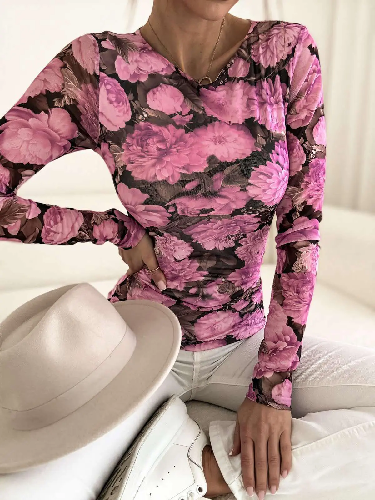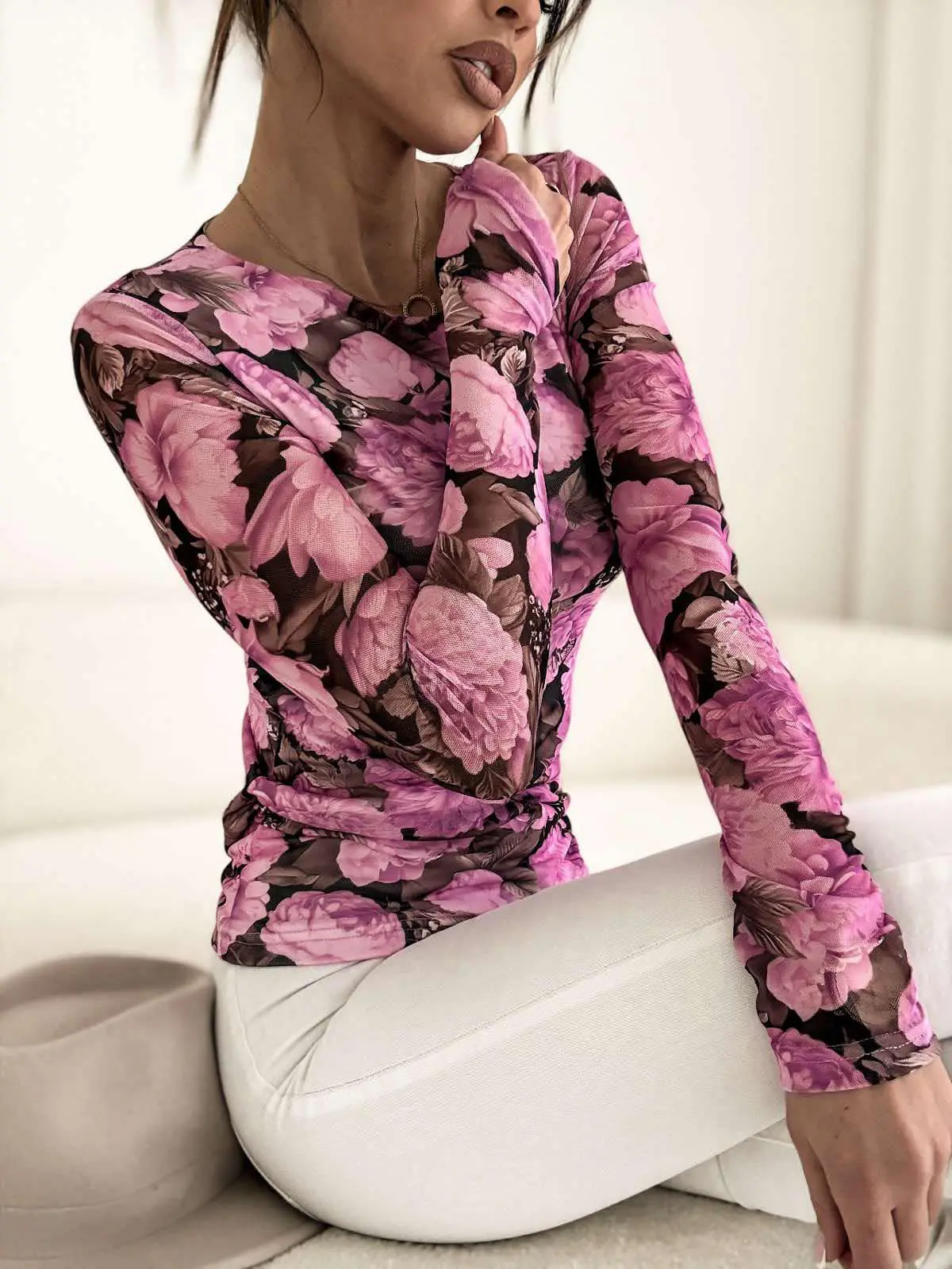 Aptempta gėlėta palaidinė prailgintomis rankovėmis išsiskiria elegantišku ir moterišku dizainu. Švelnios gėlių raštų detalės bei aptemptas siluetas pabrėžia figūrą, o prailgintos rankovės suteikia rafinuotumo. Puikiai tinka derinti tiek su klasikiniais sijonais, tiek su džinsais, kuriant subtilų ir stilingą įvaizdį.