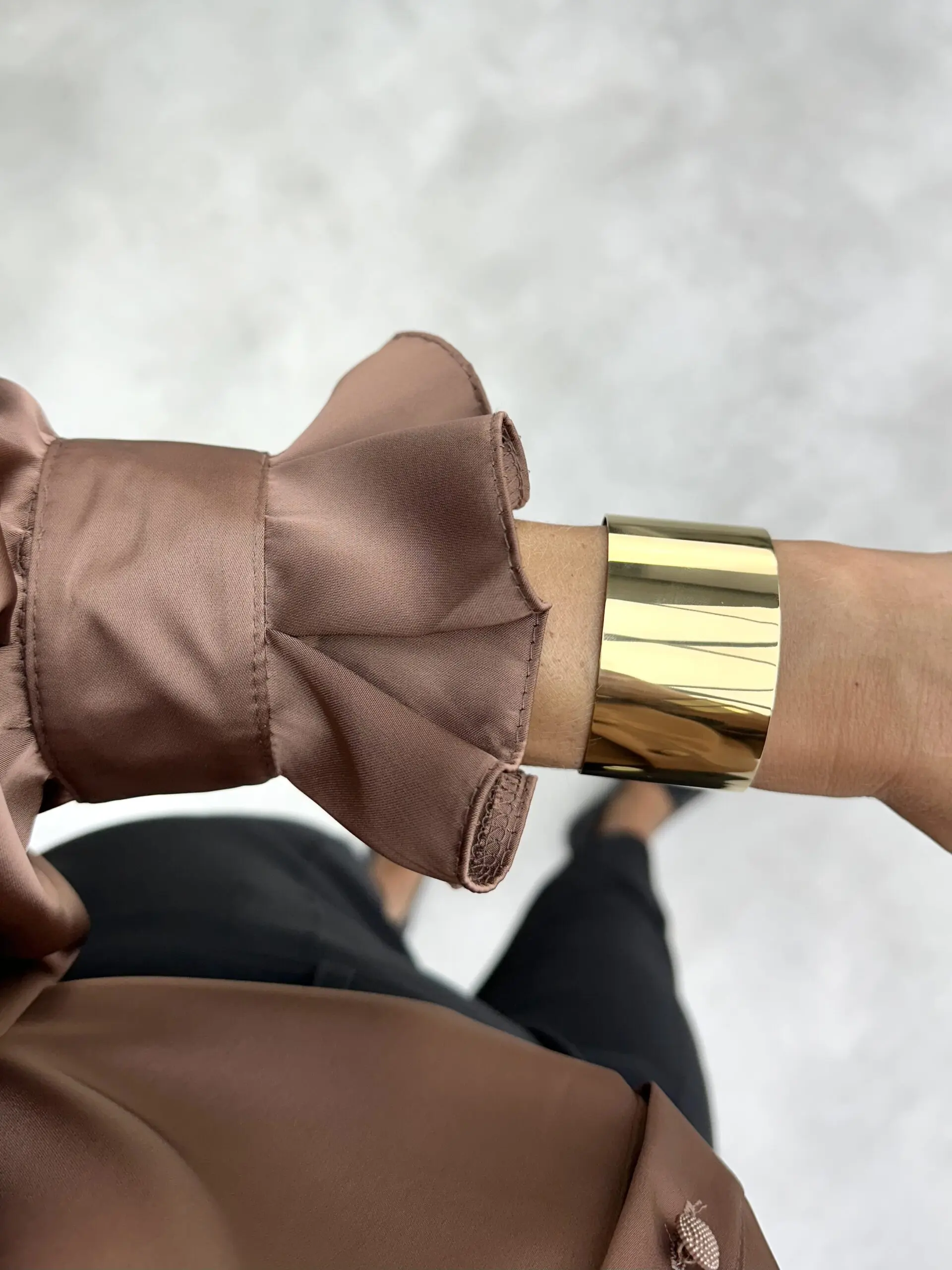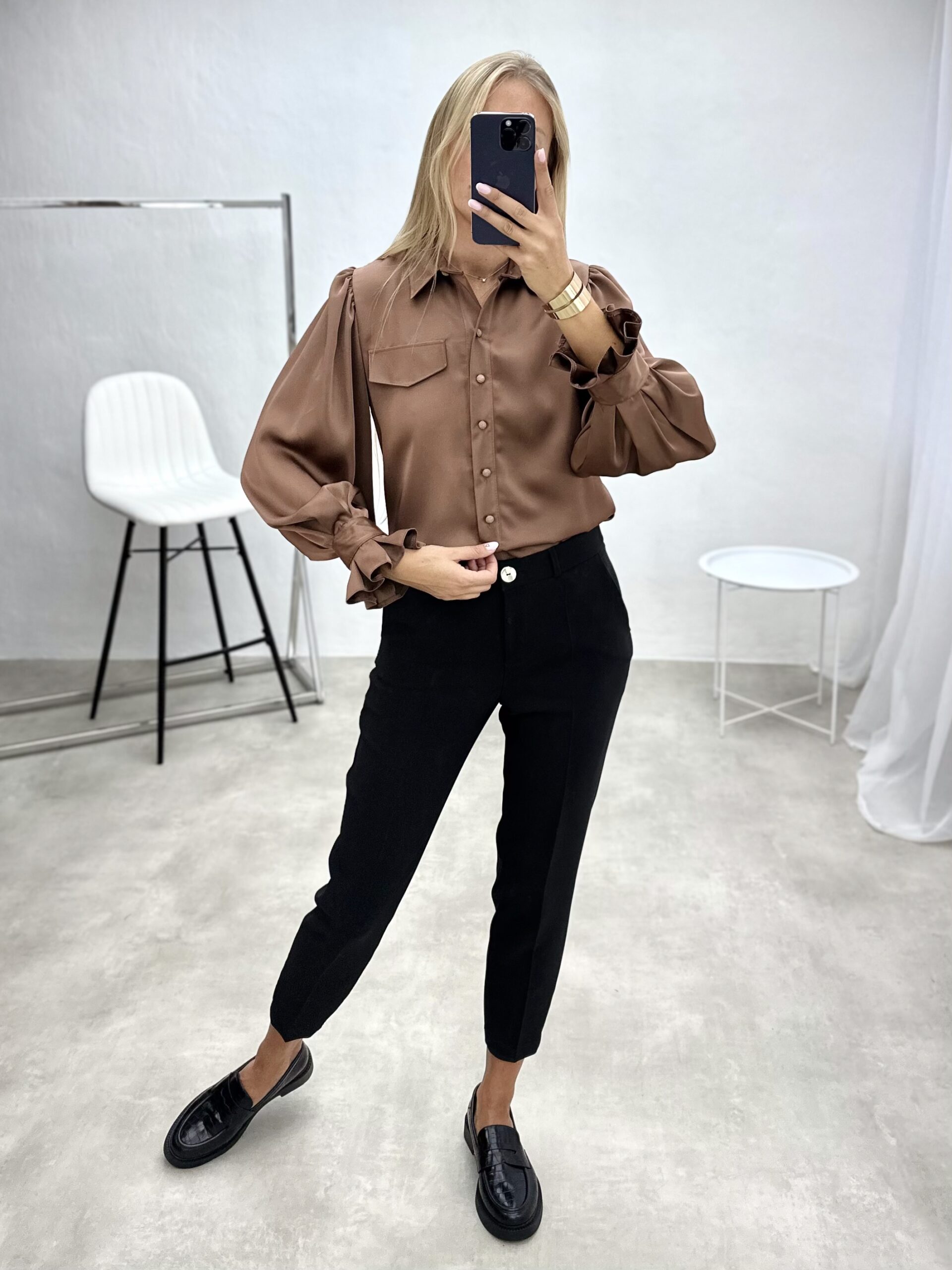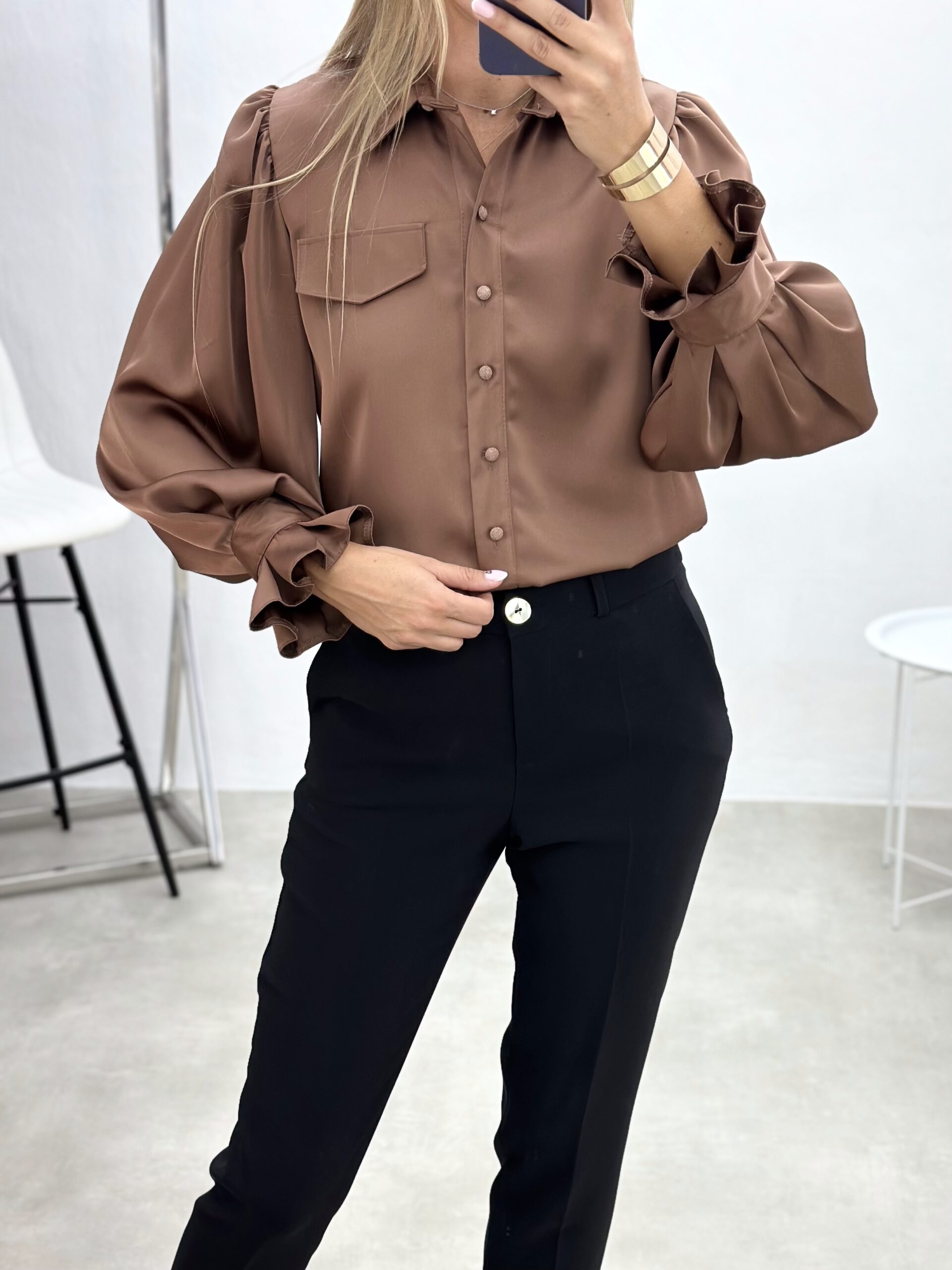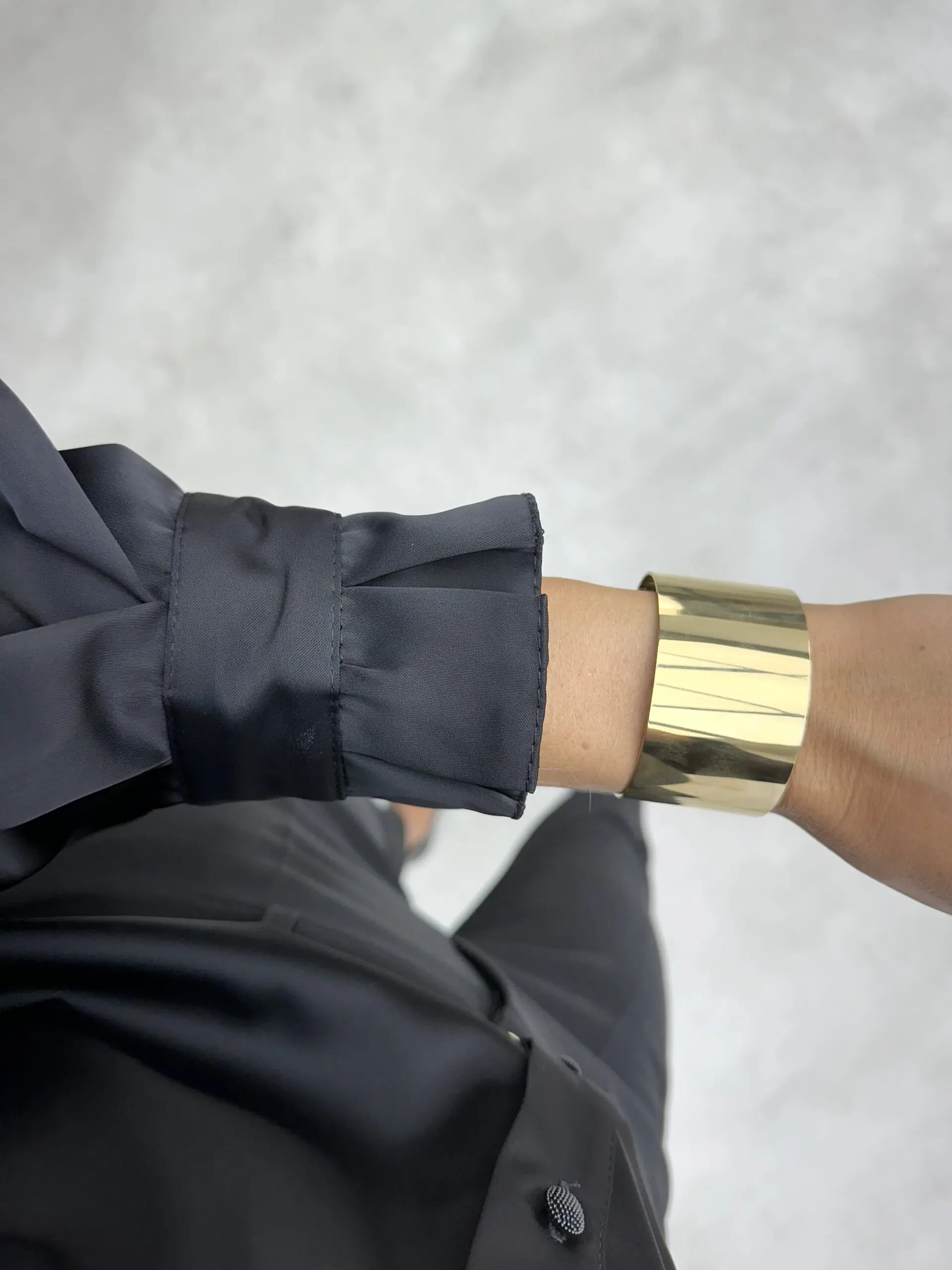 Blizgaus audinio marškiniai – puošnūs ir elegantiški, su subtiliais ripuliukais ant rankogalių. Puikiai tinka tiek kasdieniams, tiek šiek tiek formalesniems deriniams, suteikiant stilingą akcentą.