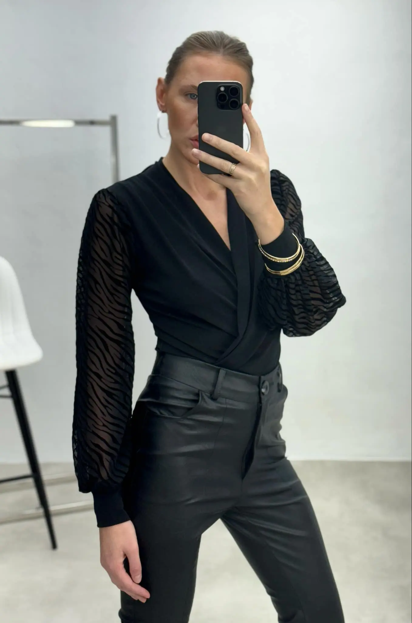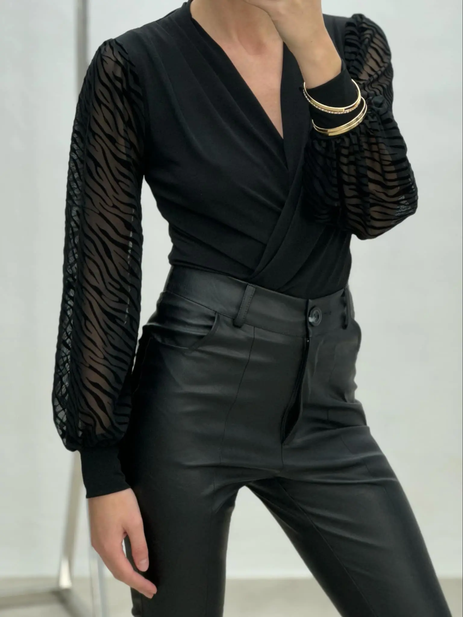 Elegantiškas bodis su permatomomis, lengvai pūstomis rankovėmis, dekoruotos zebro raštu. Subtilus ir stilingas įvaizdis įvairioms progoms.