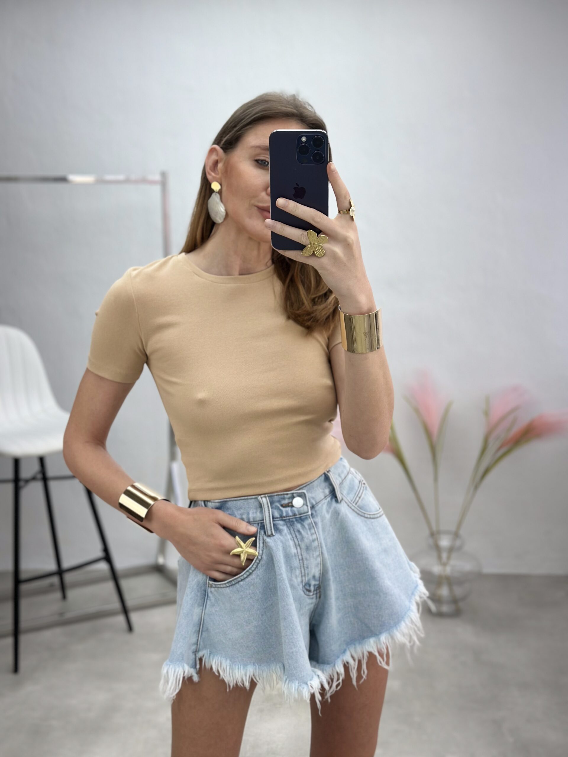 Marškinėliai trumpomis rankovėmis „crop top“ modelio – jaunatviškas ir stilingas pasirinkimas vasaros garderobui. Puikiai tinka tiek prie aukšto liemens kelnių ar šortų, tiek sluoksniuojant su kitais drabužiais.