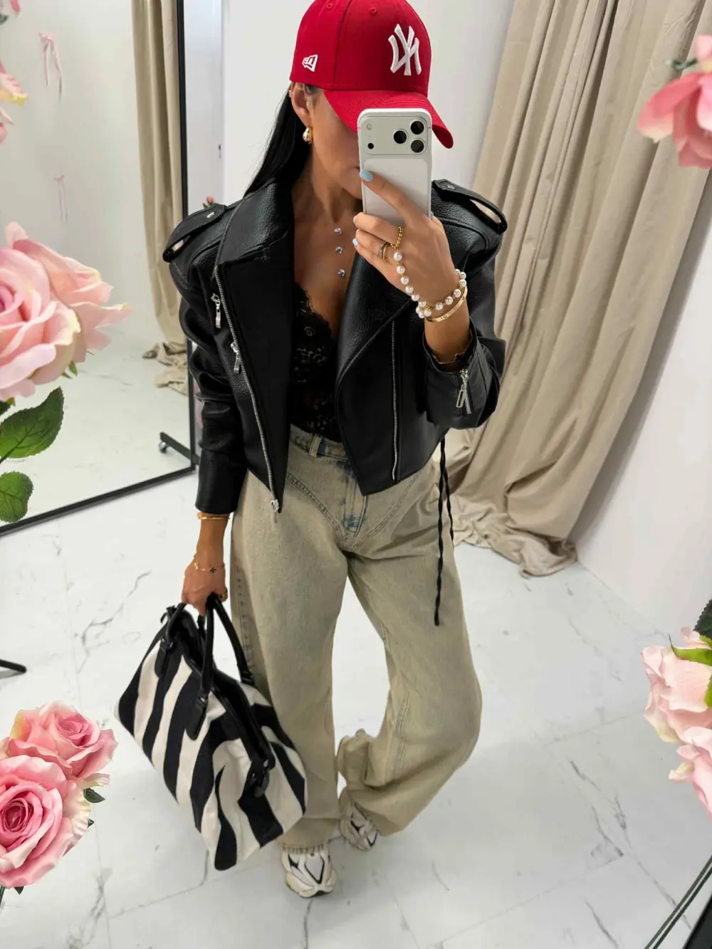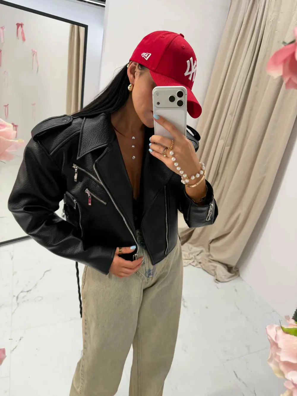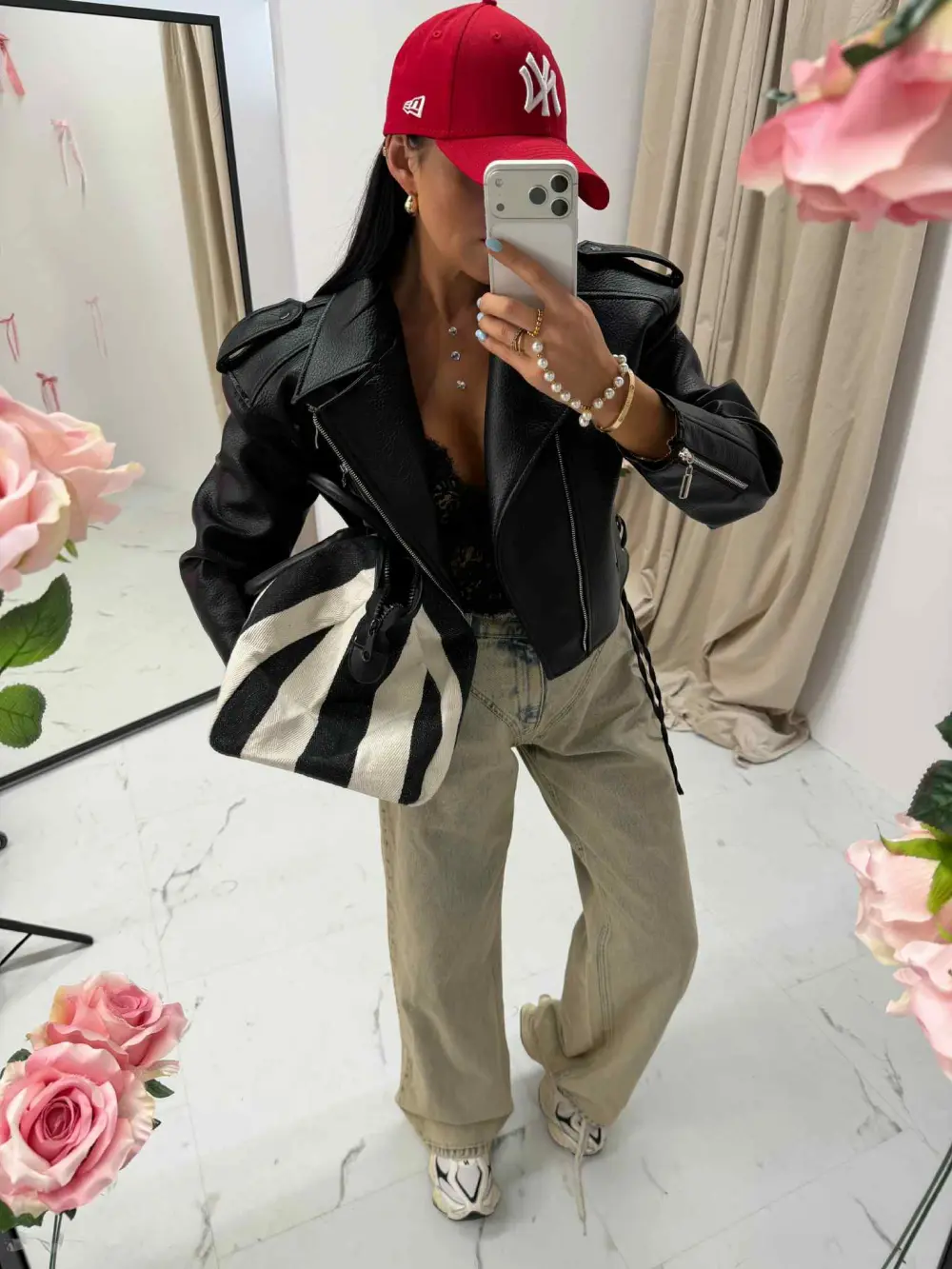 Dirbtinės odos biker stiliaus striukė suteikia drąsų ir modernų įvaizdį. Tvirtas audinys ir klasikinės detalės – užtrauktukai bei įsiūtos siūlės – pabrėžia miesto stiliaus charakterį.