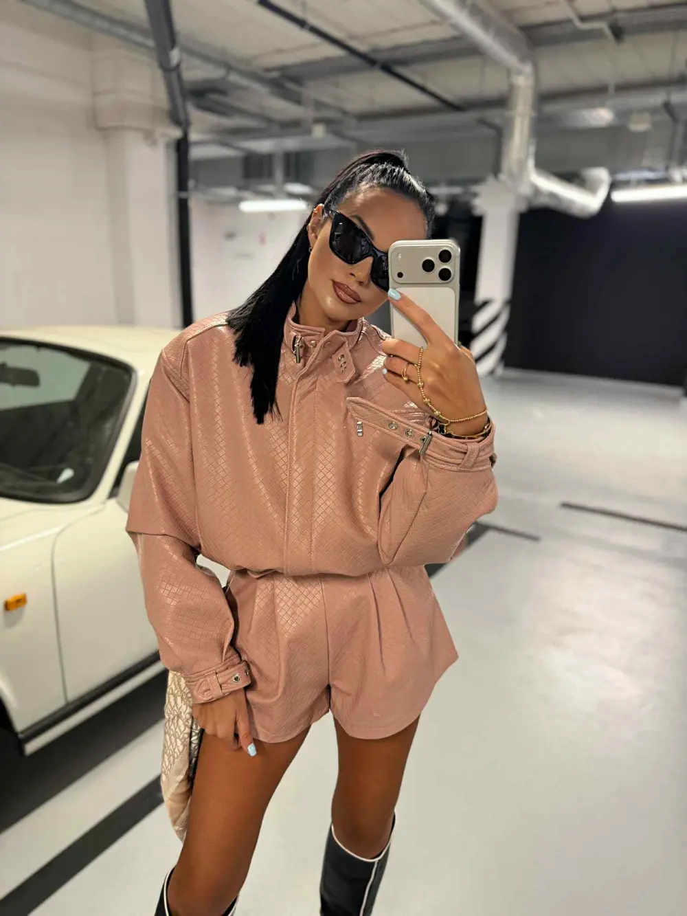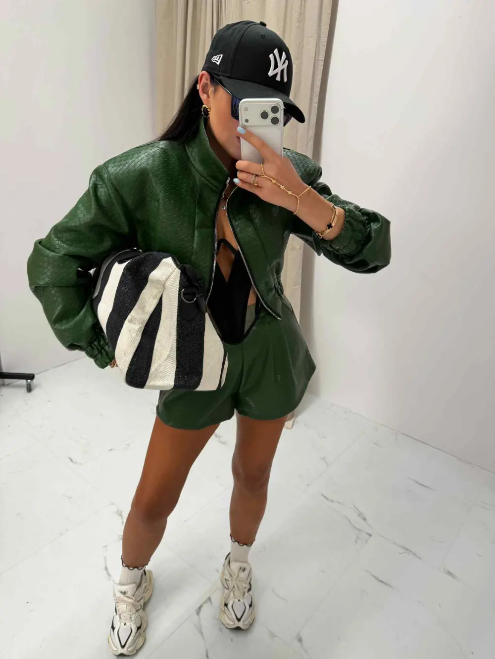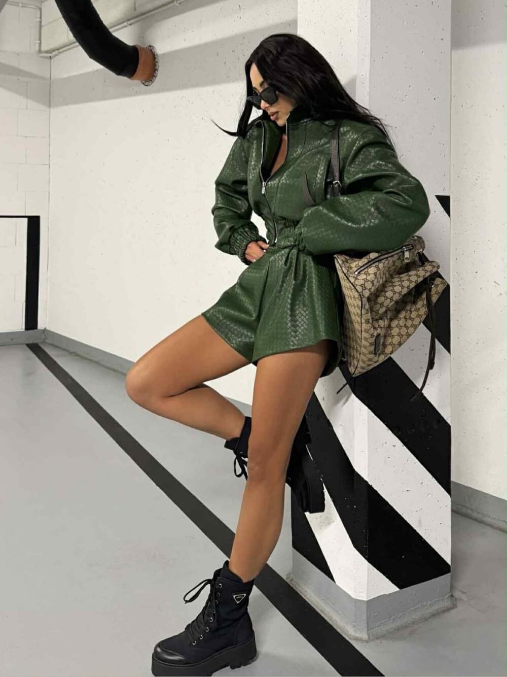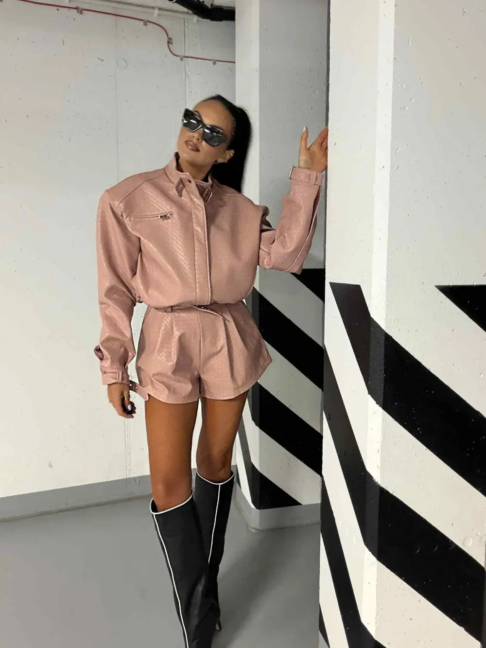 Dirbtinės odos šortai su subtiliu raštu suteikia stilingą ir drąsų akcentą. Modernus kirpimas ir tvirtas audinys užtikrina komfortą bei išskirtinį miesto stiliaus įvaizdį.