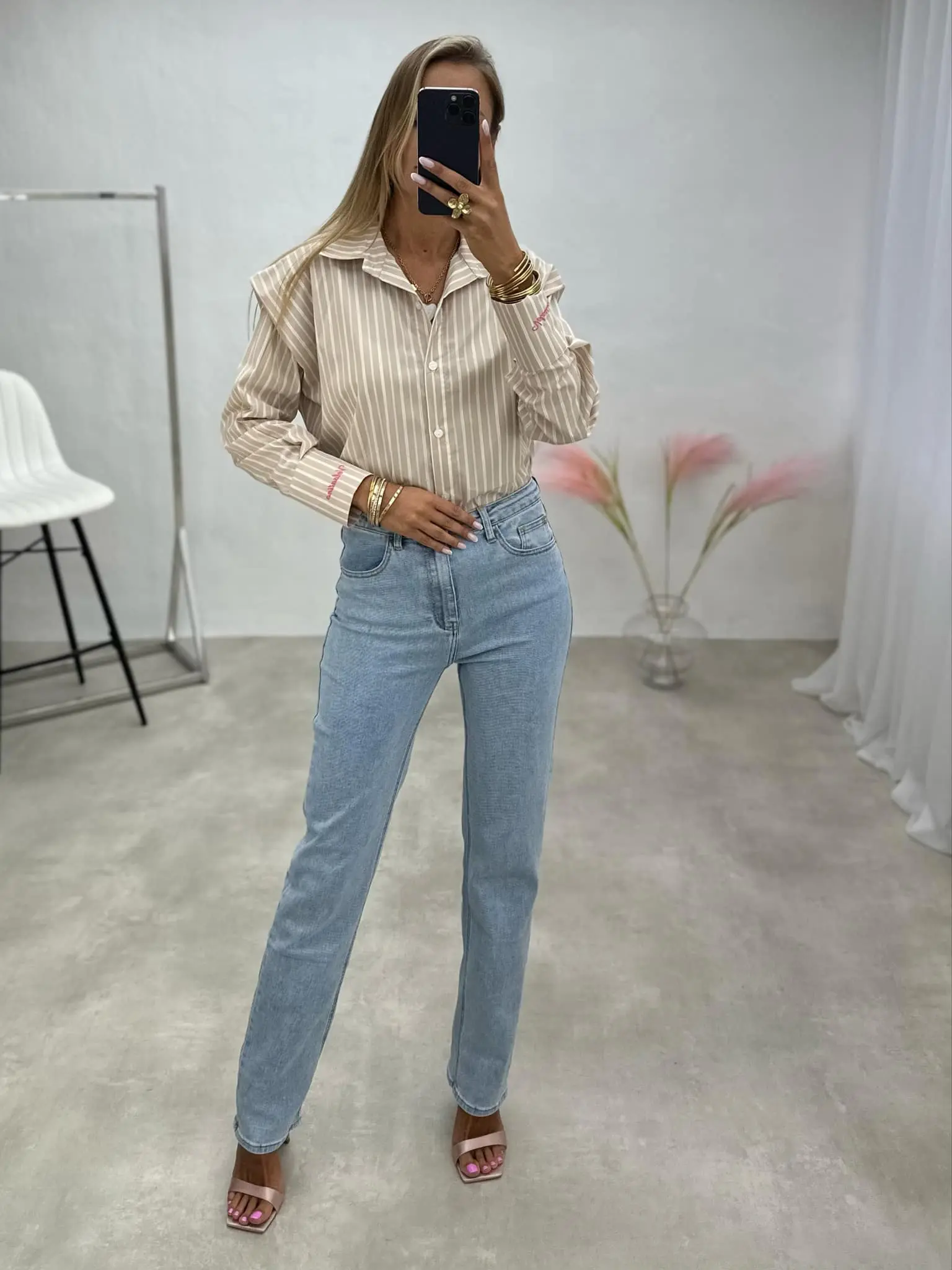 Dryžuoti marškiniai su išraiškingais pečiais – stilingam ir moderniam įvaizdžiui.