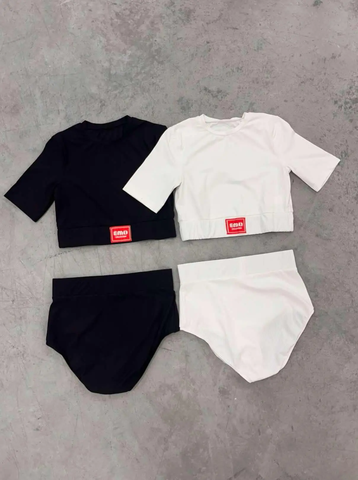 Dviejų dalių komplektas, kurį sudaro prigludusi palaidinė trumpomis rankovėmis iš tamprios, malonios medžiagos su stilinga elastine juosta apačioje. Tos pačios spalvos kelnaitės aukštu liemeniu, tinkančios dėvėti, kaip bazinis sluoksnis po drabužiais.