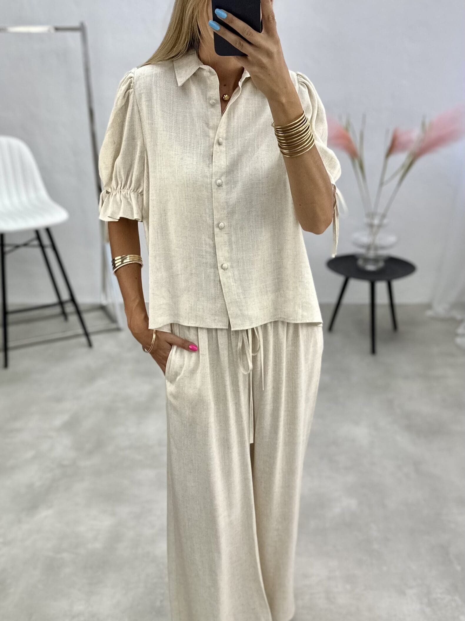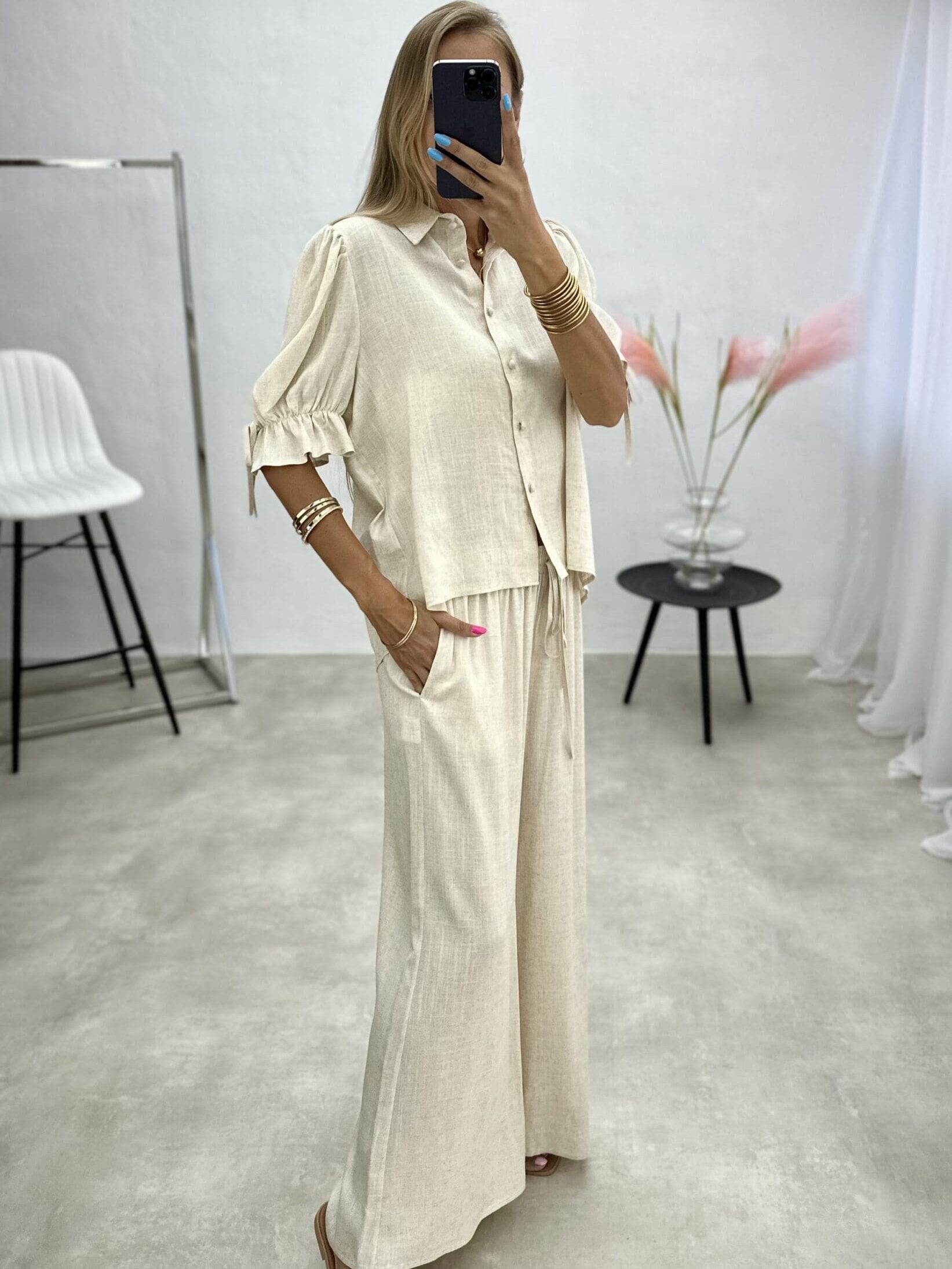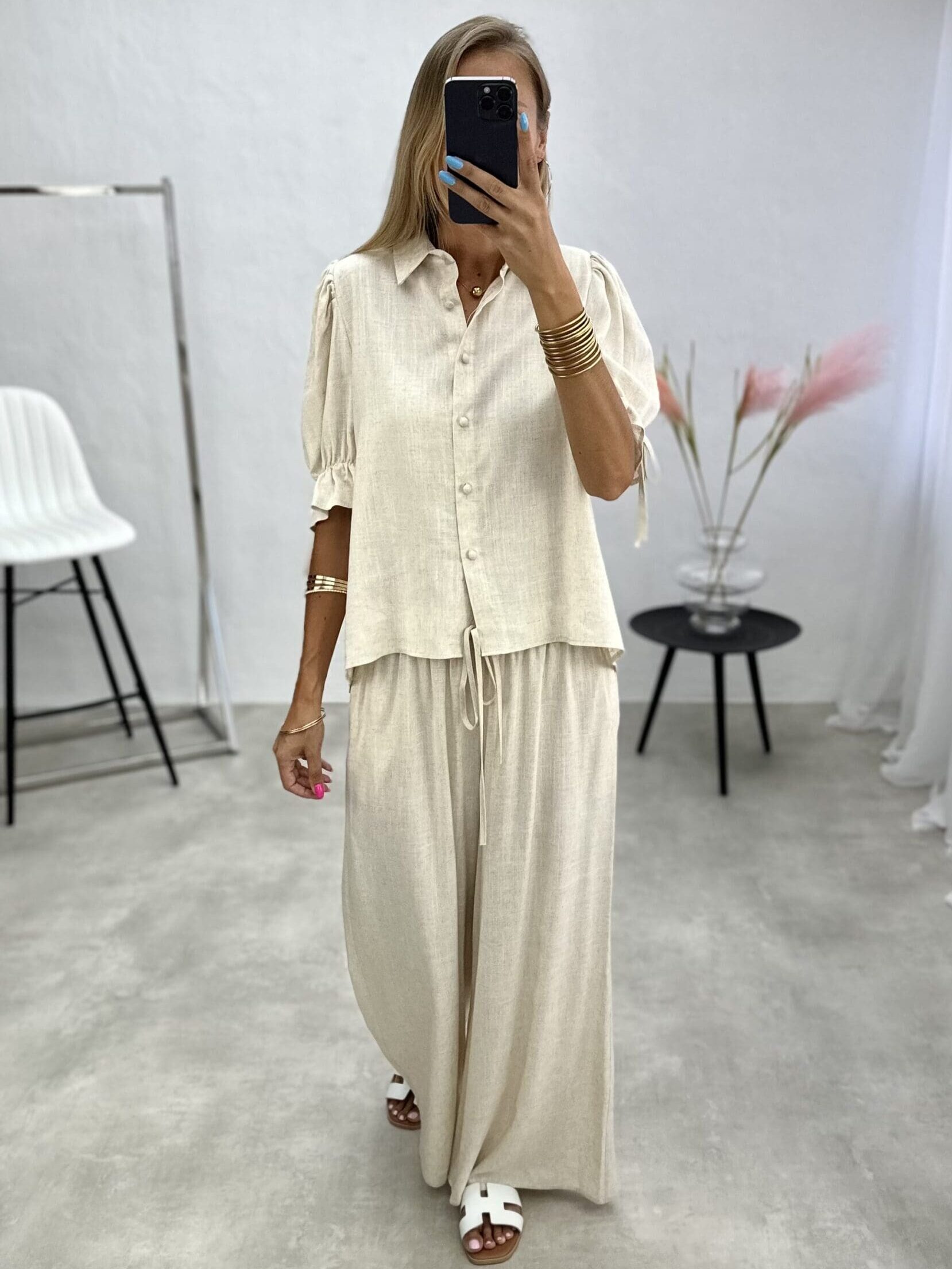 Lengvos medžiagos dviejų dalių kostiumėlis, kurį sudaro marškinėliai su sagutėmis ir 3/4 rankovėmis ir plačios kelnės.