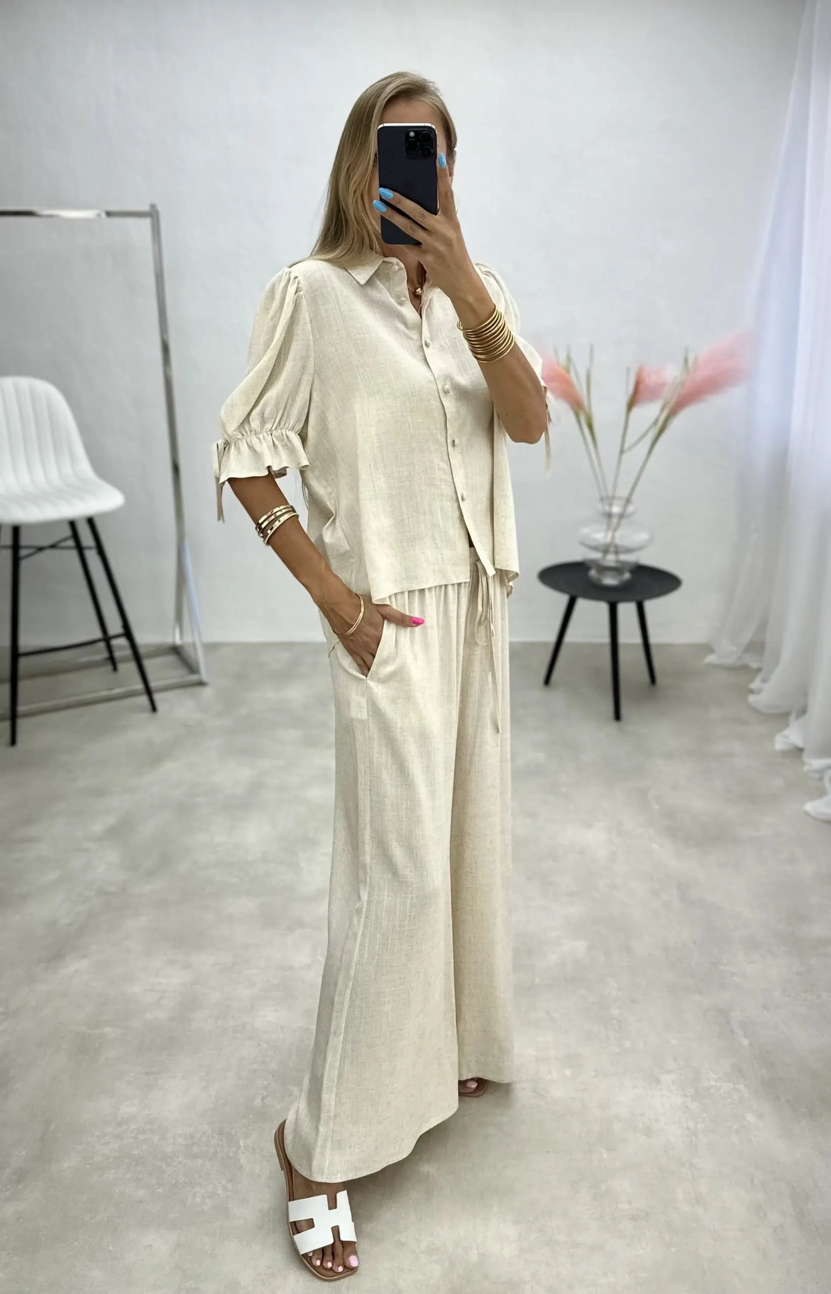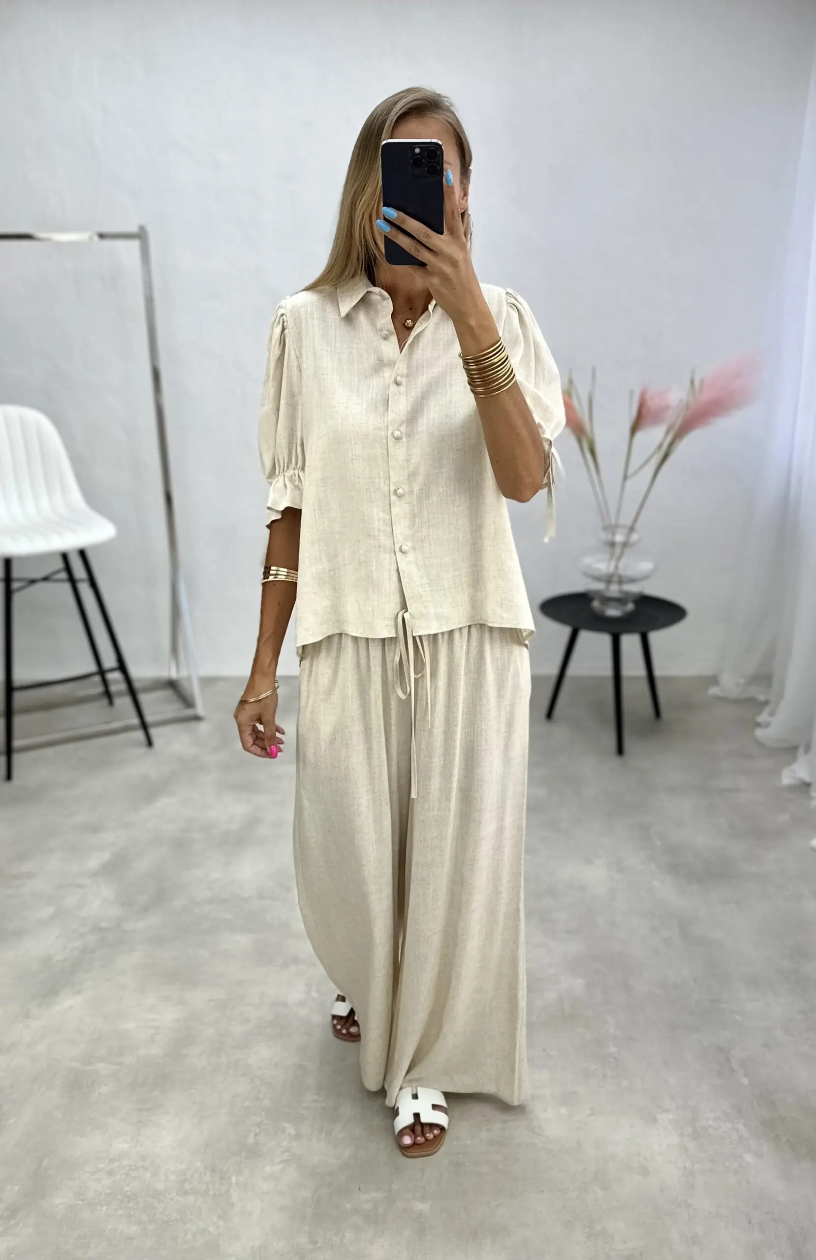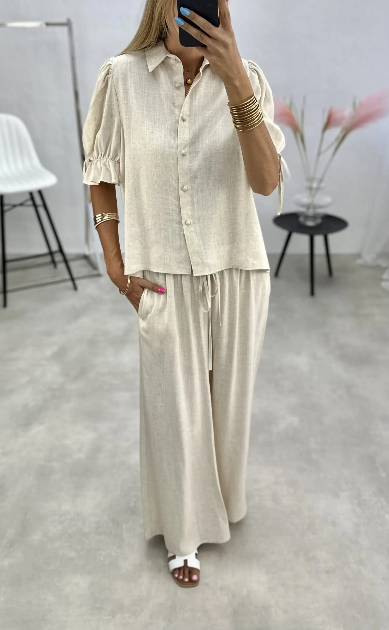 Vasariškas lengvos medžiagos dviejų dalių kostiumėlis, kurį sudaro marškinėliai su sagutėmis ir 3/4 rankovėmis ir plačios kelnės.