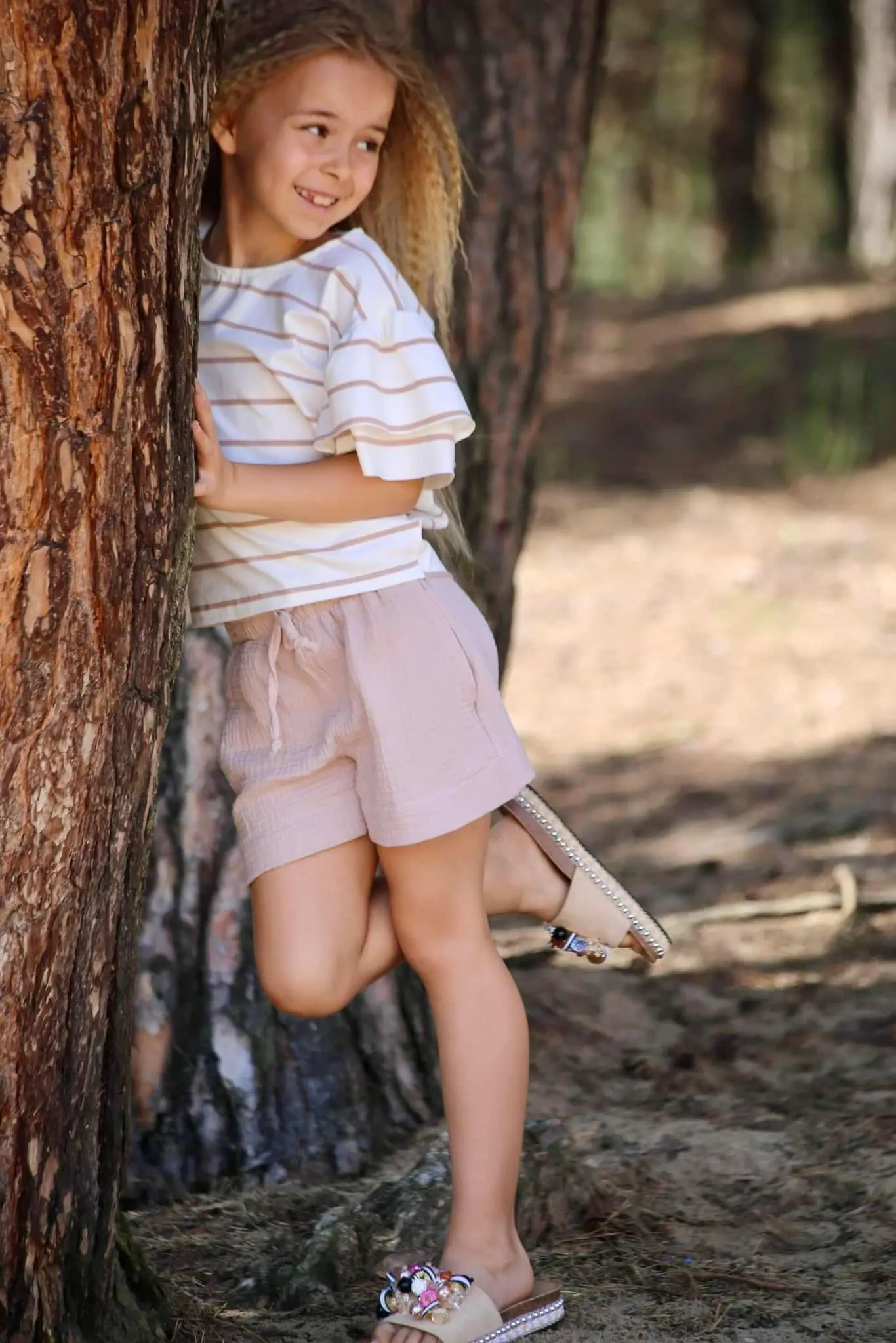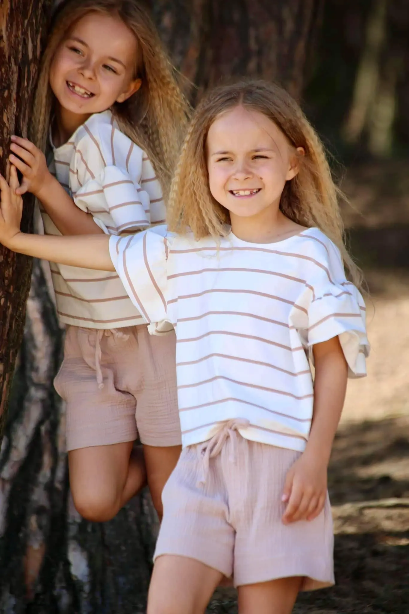 Vasariškas dviejų dalių laisvalaikio kostiumėlis, kurį sudaro marškinėliai ir šortai.