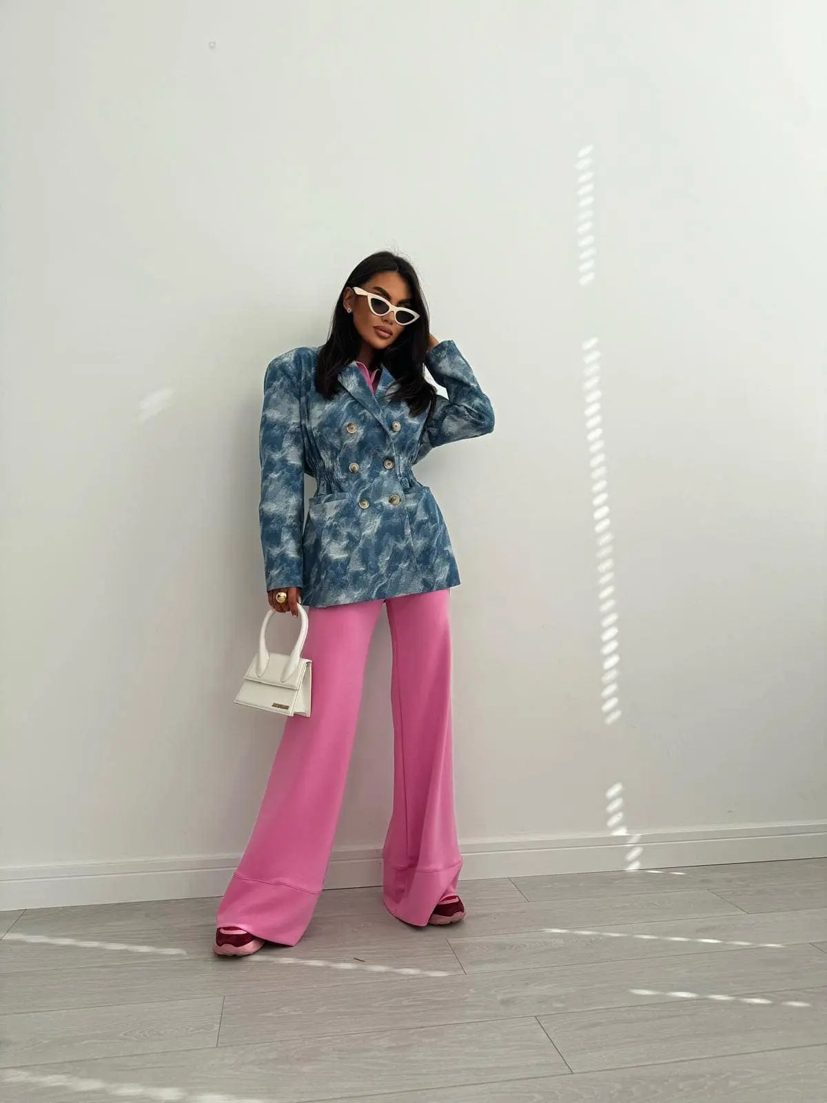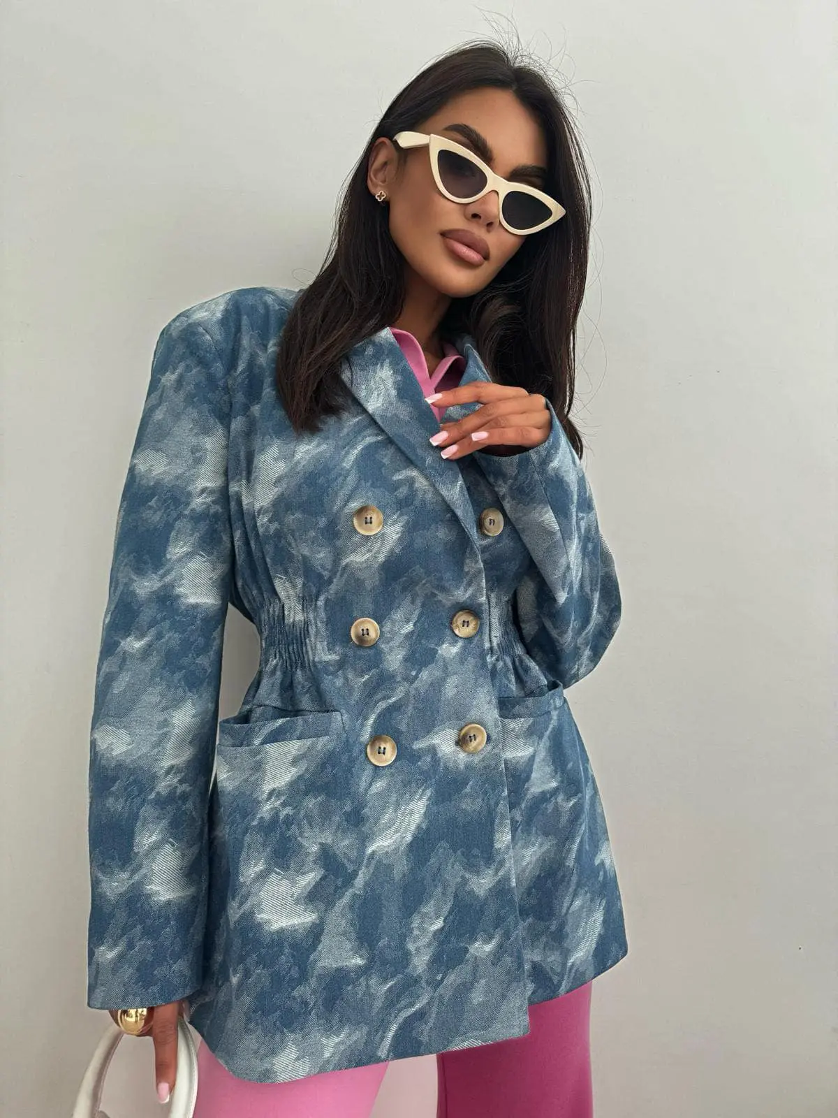 Stilingas džinsinio efekto dvisagis švarkas su struktūriniais pečiais suteikia išskirtinio stiliaus ir elegancijos. Puikiai derės tiek prie klasikinių kelnių, tiek prie laisvalaikio aprangos.