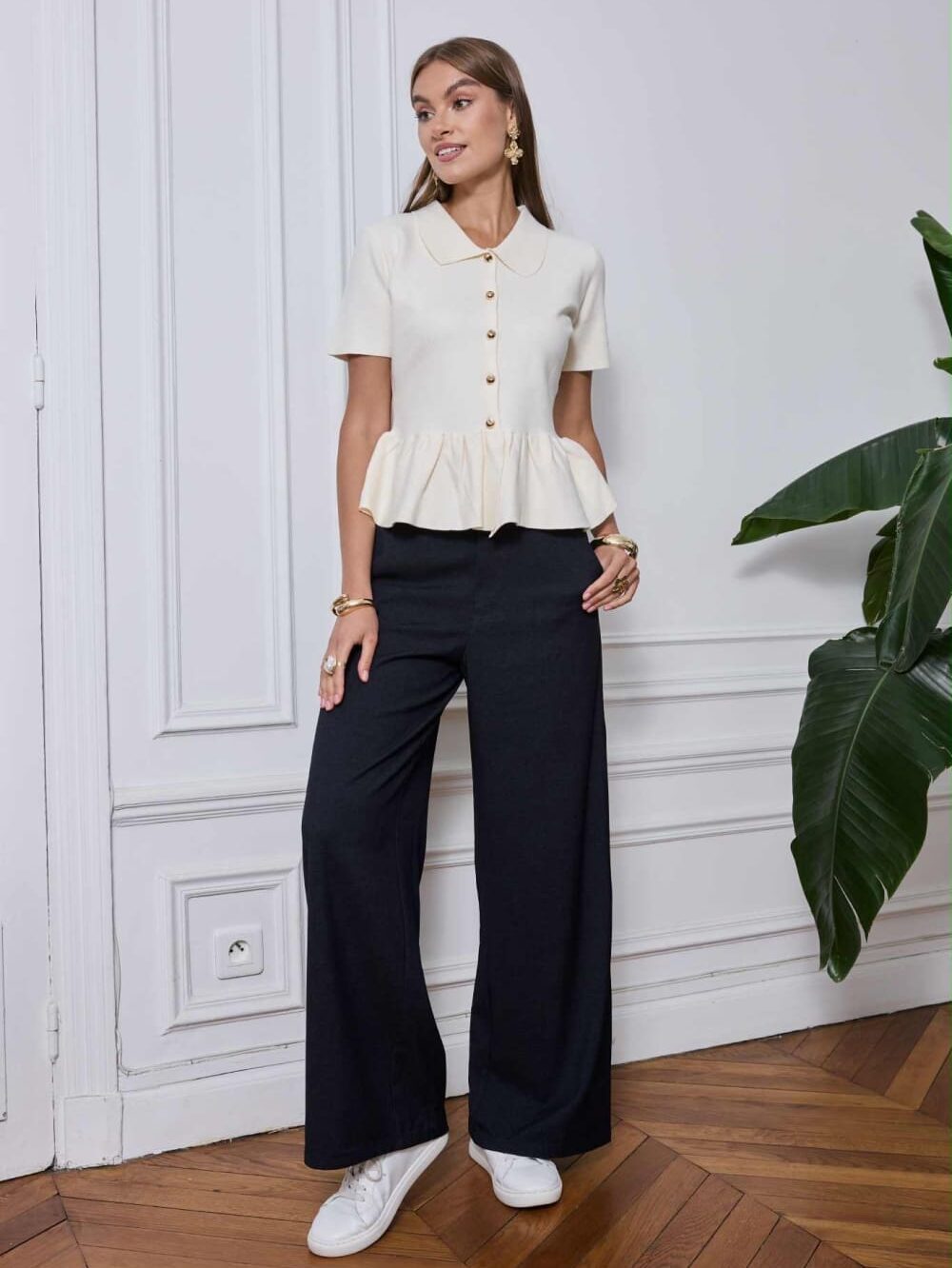 Klasikinio stiliaus megztinis su trumpomis rankovėmis ir auksinės spalvos sagutėmis – elegantiškas ir stilingas kasdieniam dėvėjimui.