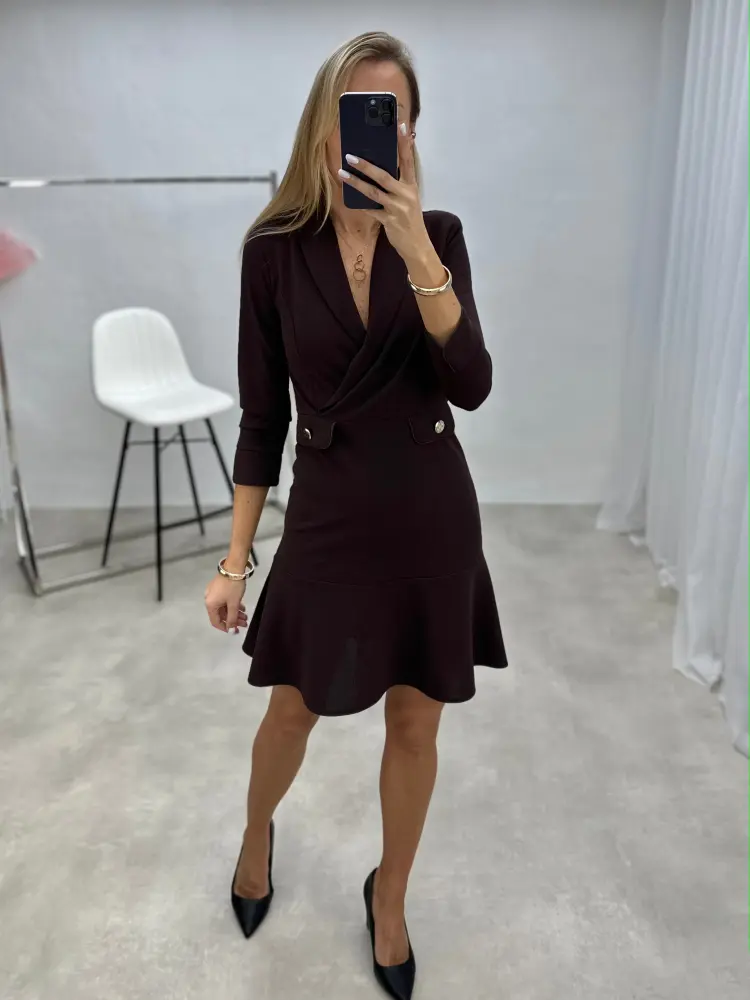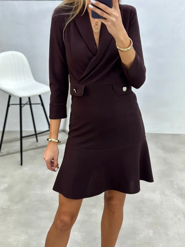 Suknelė klasikinio silueto su imituotomis kišenėlėmis, sijono dalis iš lengvo audinio su raukiniais apačioje. Elegantiška ir patogi kasdienai.