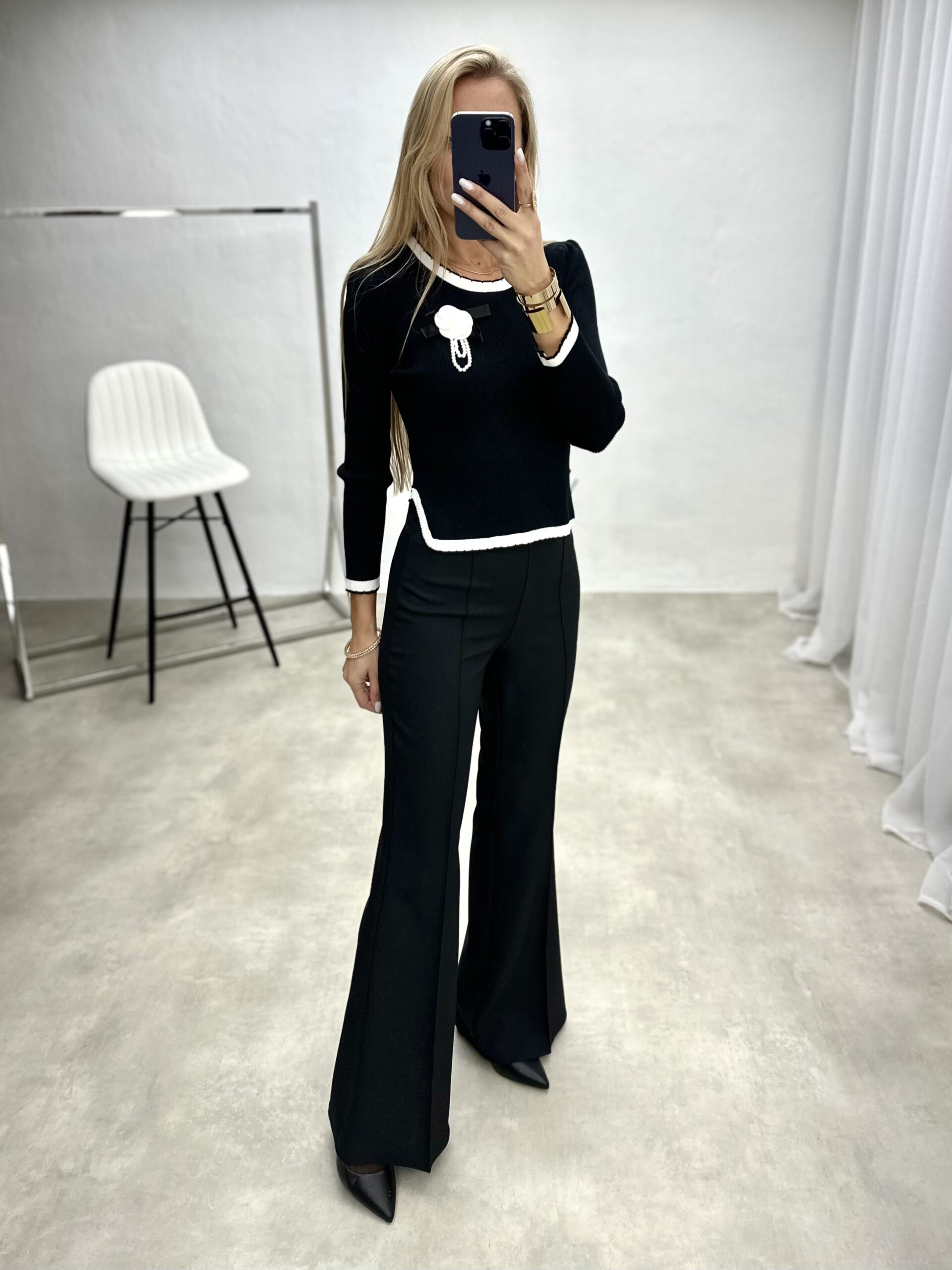 Megztinis dekoruotas subtilia rože ir kaspinėliu, kurie suteikia elegantiško žavesio bei išskirtinumo. Šoniniai skeltukai užtikrina patogų kritimą ir lengvą siluetą. Klasikinis modelis lengvai derinamas prie įvairių stilių ir puikiai tinka tiek kasdienai, tiek puošnesnėms progoms.