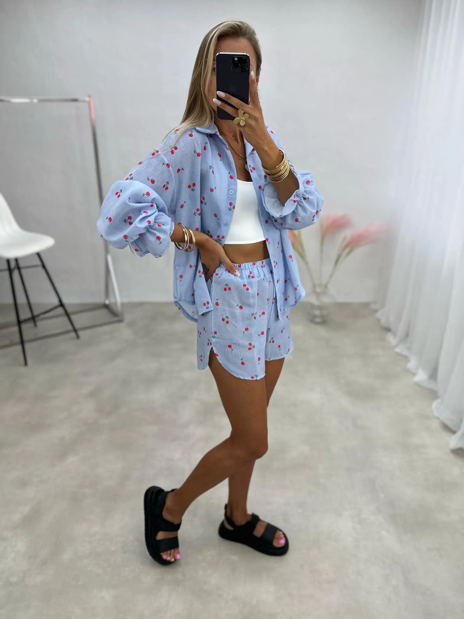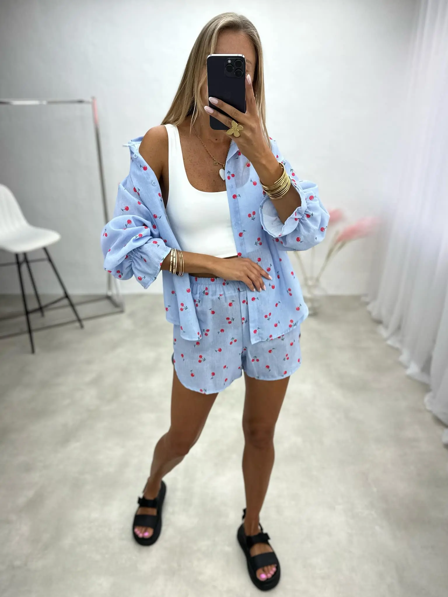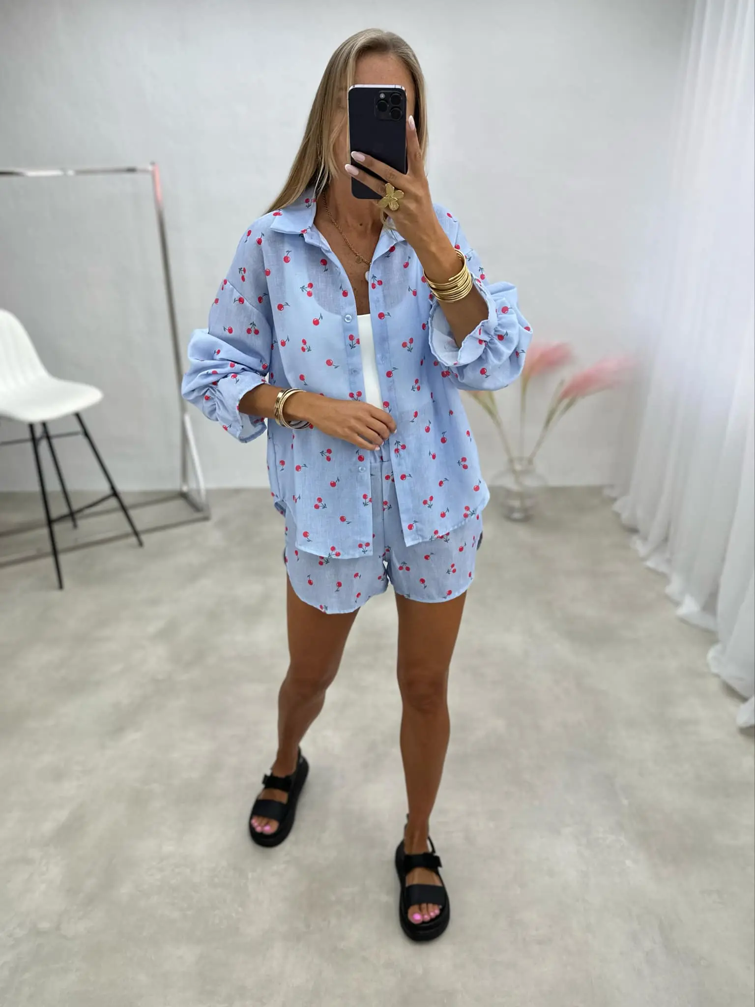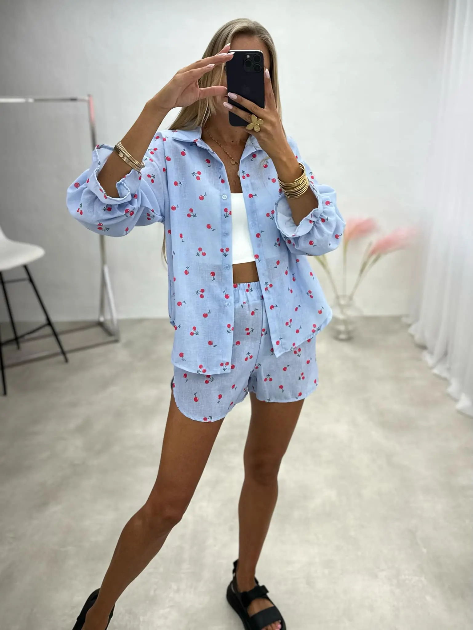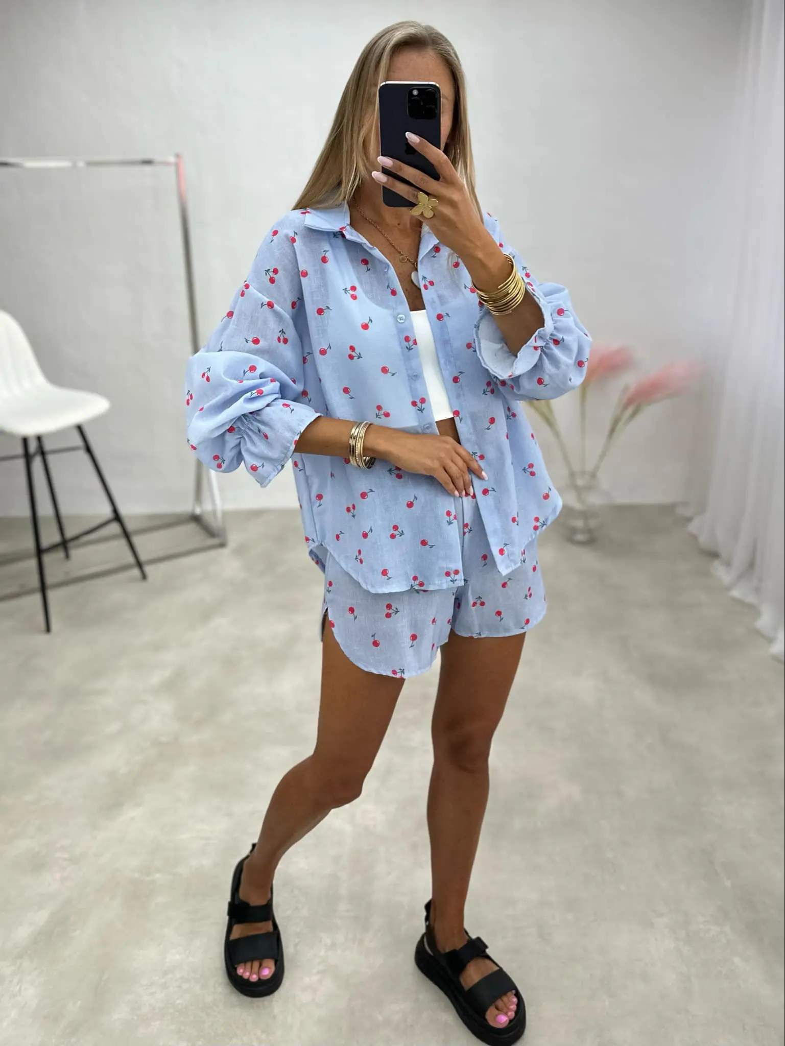 Žaismingas dviejų dalių kostiumėlis, kurį sudaro marškiniai ir šortai. Puikus pasirinkimas šiltoms dienoms, užtikrinantis komfortą ir elegantišką įvaizdį.