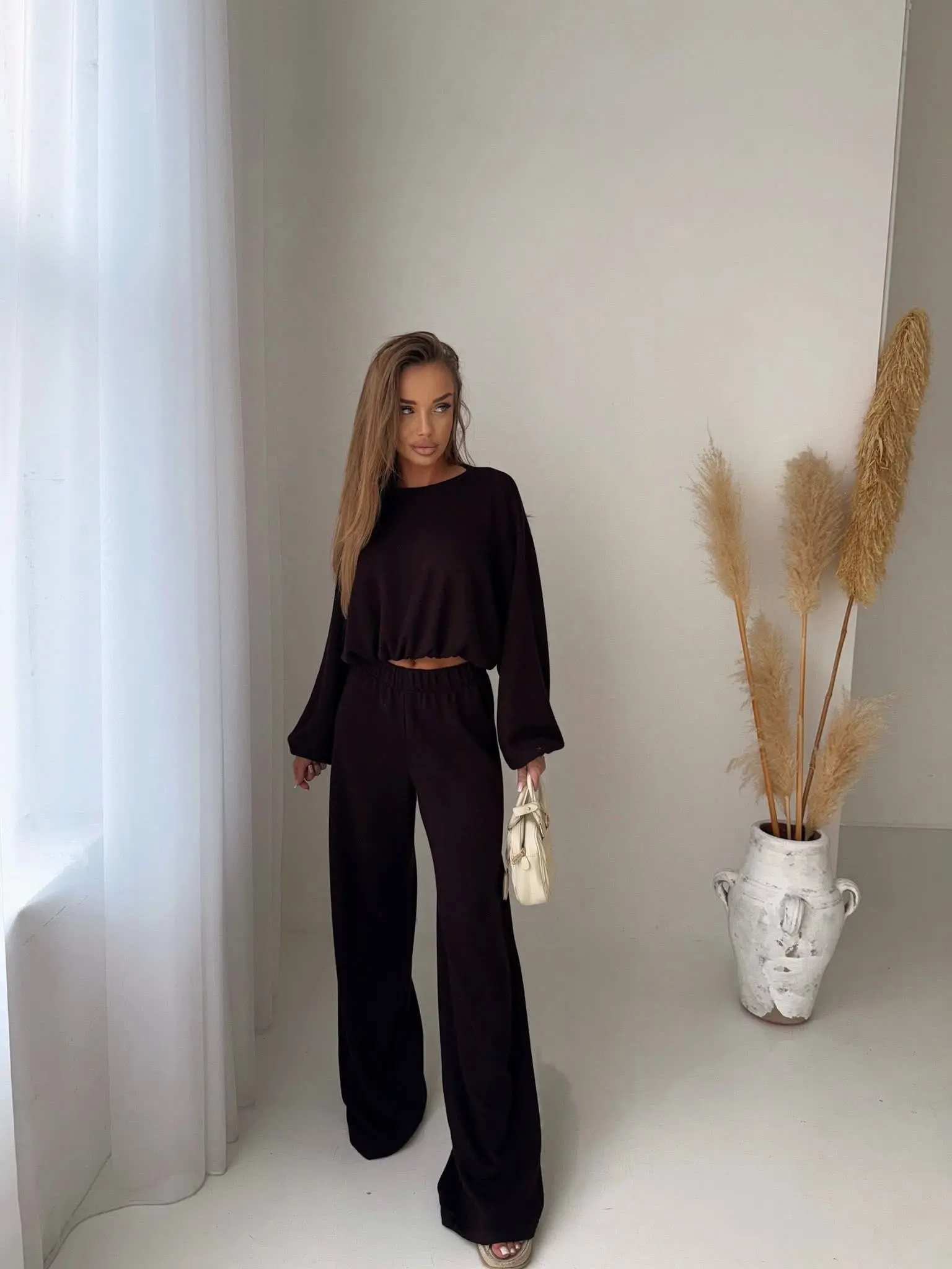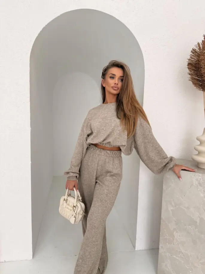 Dviejų dalių laisvalaiko kostiumas su vilna, kurį sudaro džemperis ir kelnės su guma – patogus bei stilingas pasirinkimas laisvalaikiui. Minkšta ir elastinga medžiaga užtikrina komfortą visą dieną.
