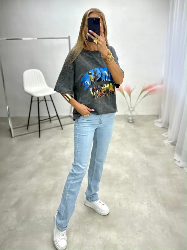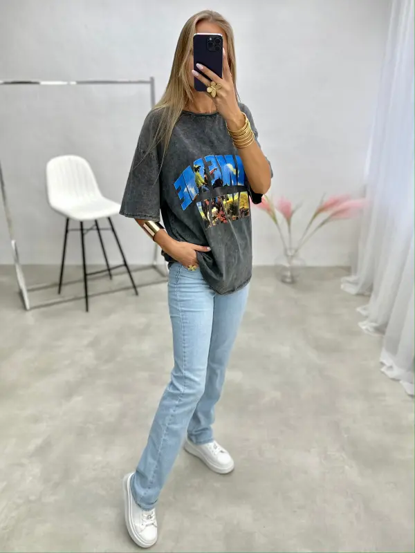 Laisvalaikio marškiniai su užrašu, oversize modelis – patogus ir madingas pasirinkimas neįpareigojančiam miesto ar savaitgalio įvaizdžiui.