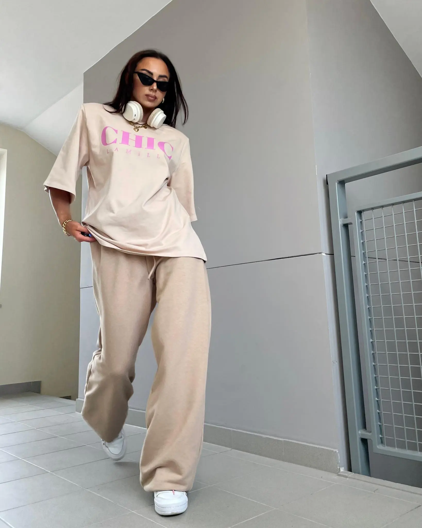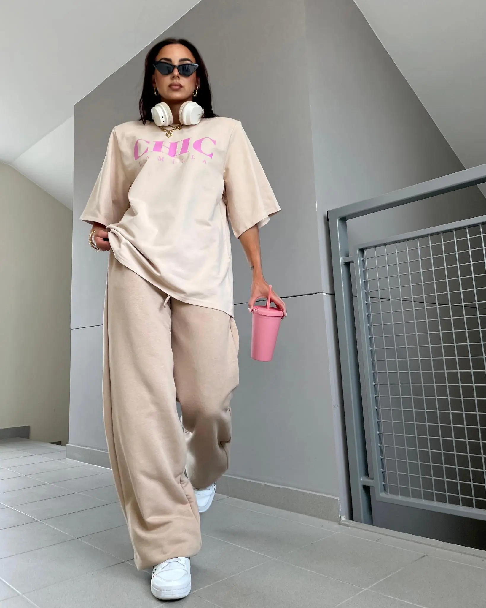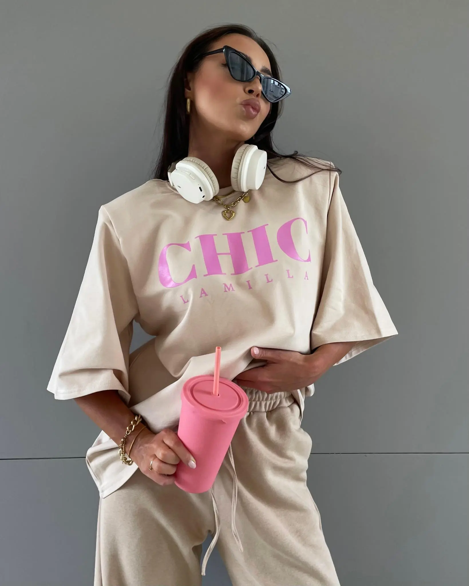 Stilingi laisvalaikio stiliaus marškinėliai su užrašu blizgančiu užrašu CHIC, puikus pasirinkimas kiekvienai dienai.