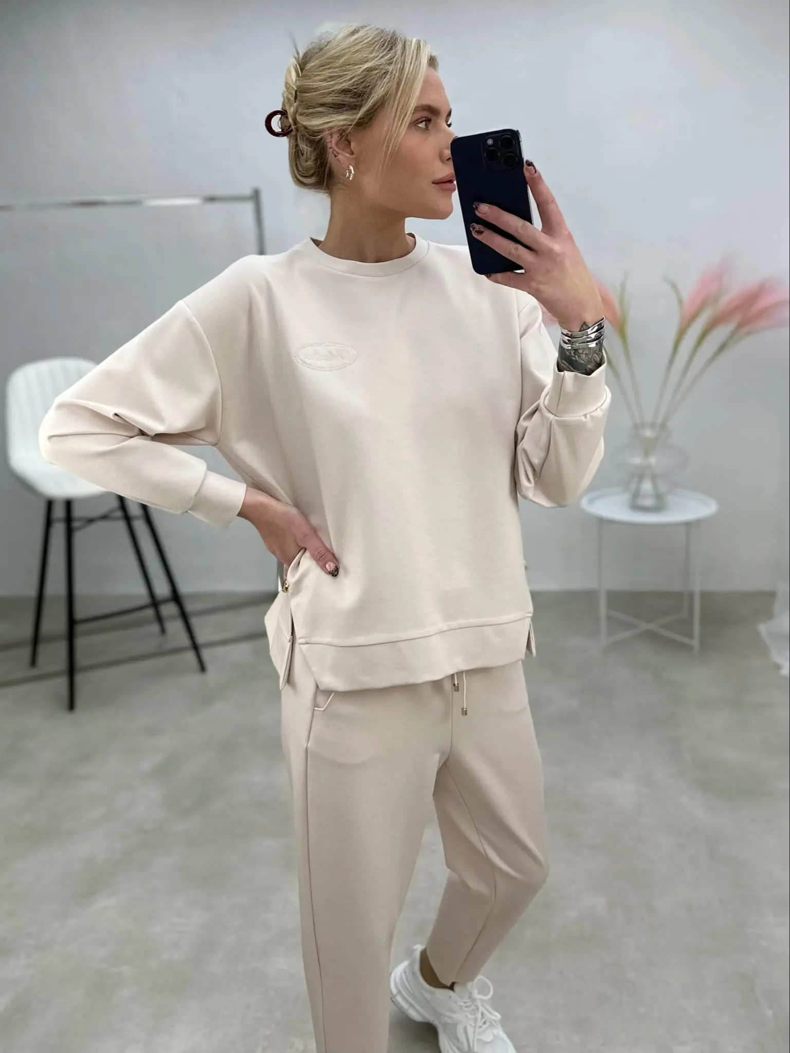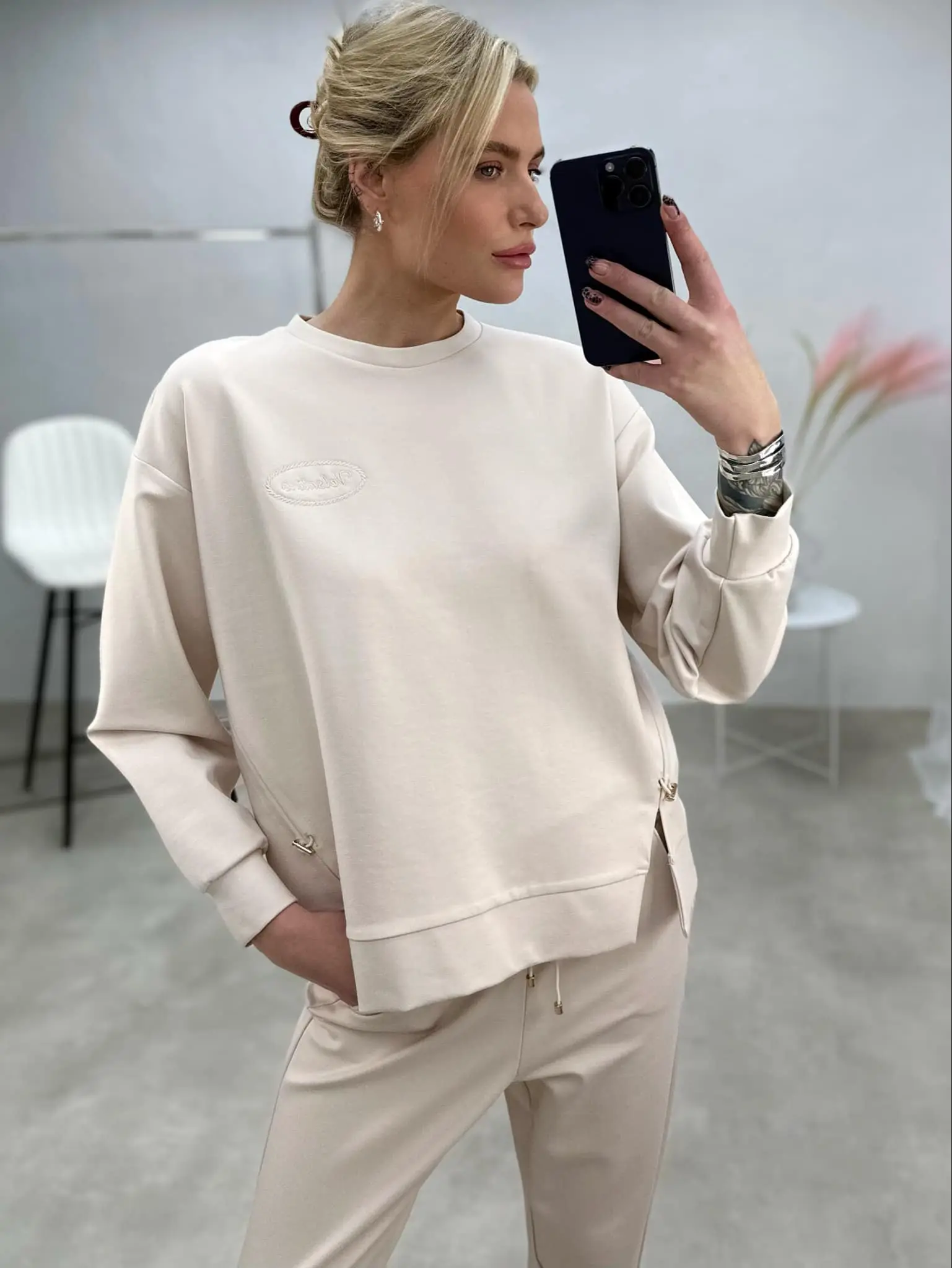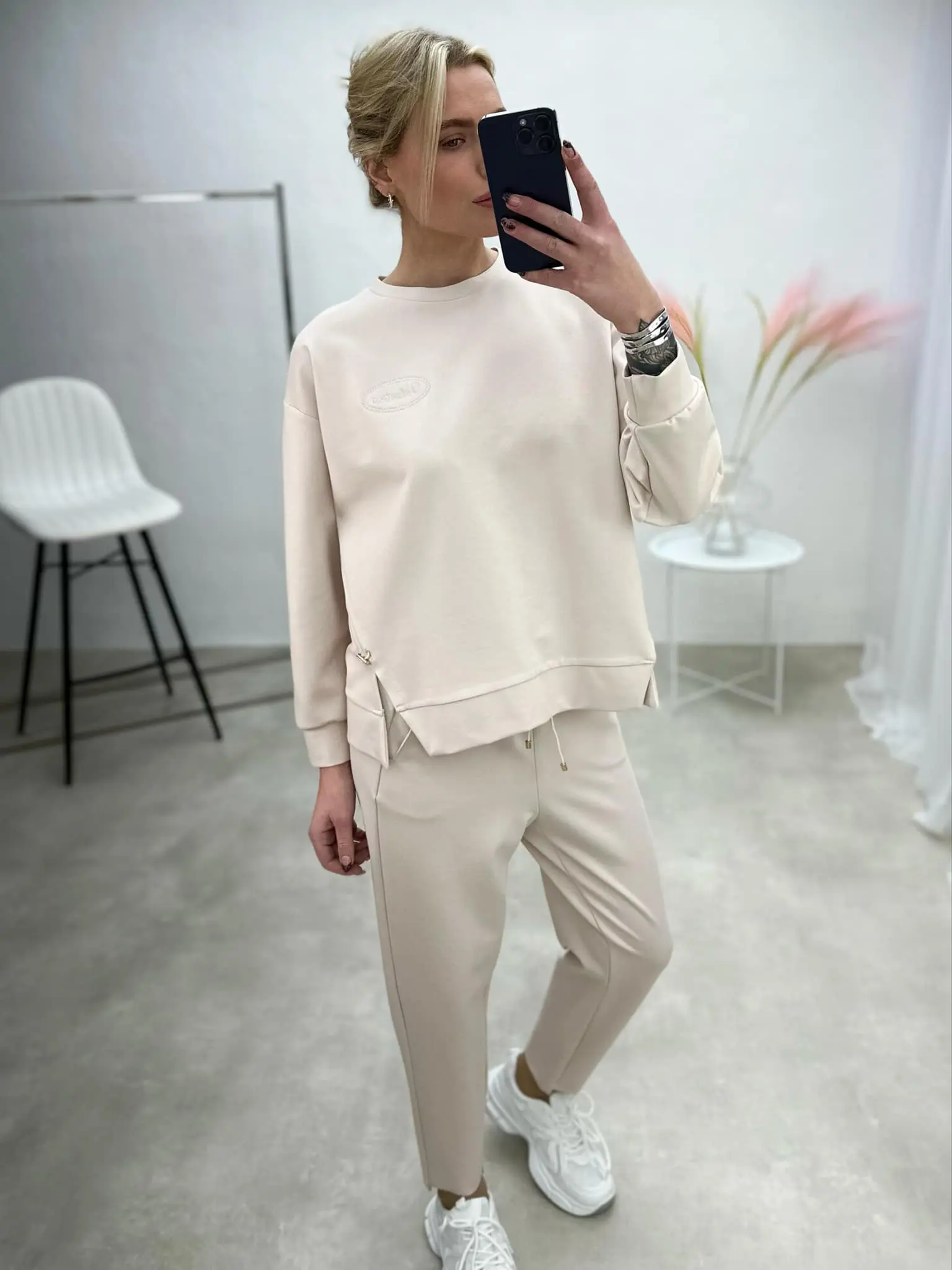 Stilingas laisvalaikio stiliaus kostiumėlis, sudarytas iš džemperio su skeltukais šonuose ir tiesaus kirpimo kelnių. Šis derinys puikiai tinka tiek kasdienai, tiek moderniam miesto įvaizdžiui.