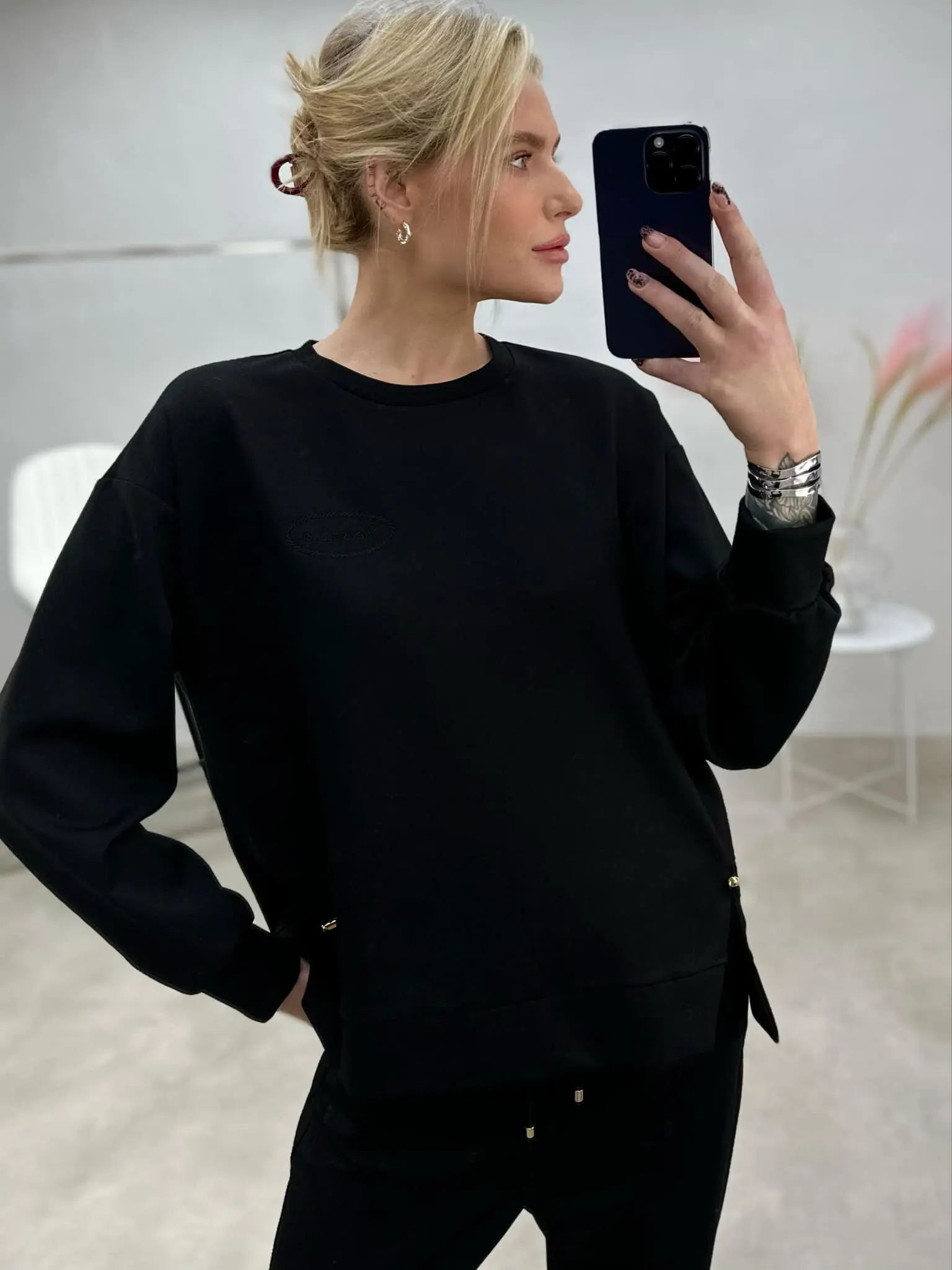 Stilingas laisvalaikio stiliaus kostiumėlis, sudarytas iš džemperio su skeltukais šonuose ir tiesaus kirpimo kelnių. Šis derinys puikiai tinka tiek kasdienai, tiek moderniam miesto įvaizdžiui.