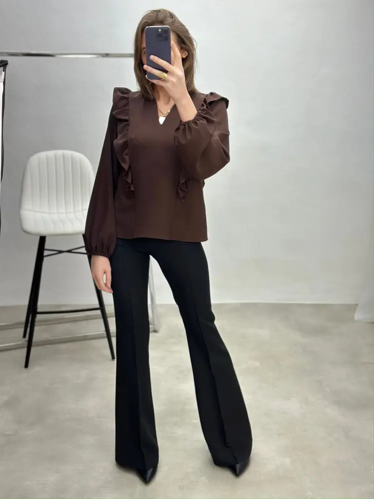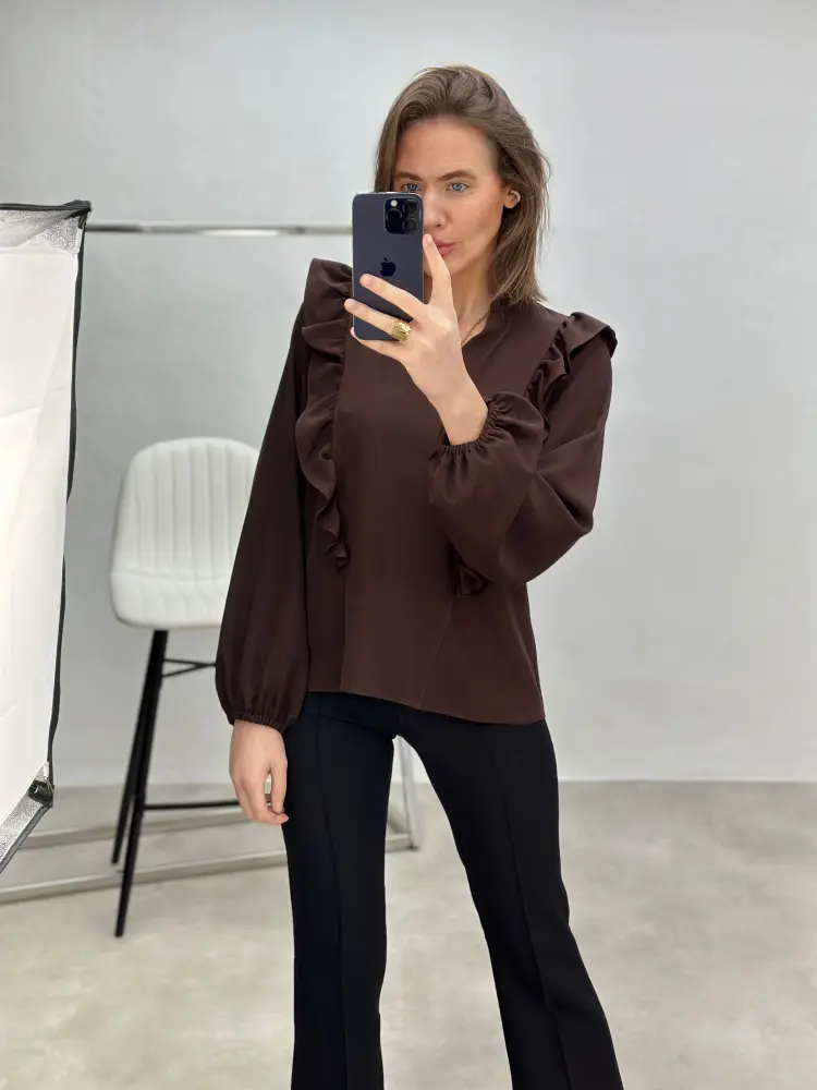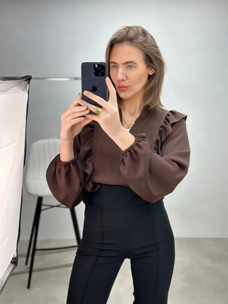 Stilingi marškiniai su subtiliais raukiniais šonuose, suteikiantys siluetui lengvumo ir išskirtinės formos.