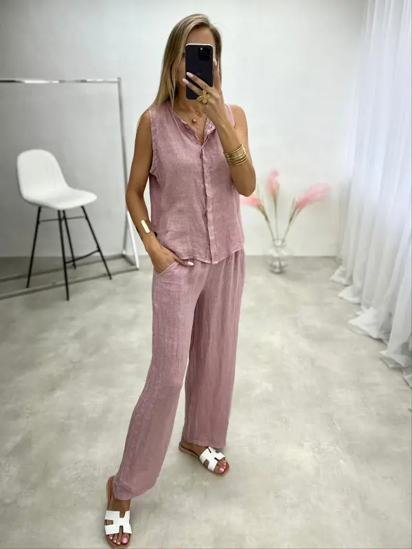 Lino kostiumėlis, sudarytas iš marškinių be rankovių su sagutėmis ir platėjančių kelnių – natūralus, lengvas ir stilingas pasirinkimas šiltajam sezonui.