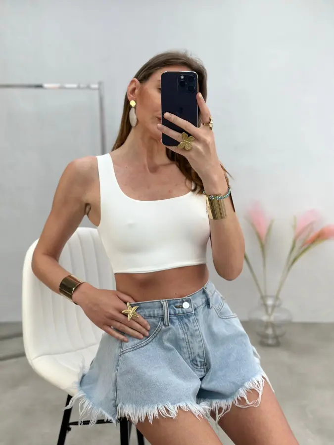 „Crop top“ modelio palaidinė – žaismingas ir vasariškas pasirinkimas, puikiai pabrėžiantis siluetą. Lengvai derinama tiek su sijonais, tiek su aukšto liemens kelnėmis ar šortais.