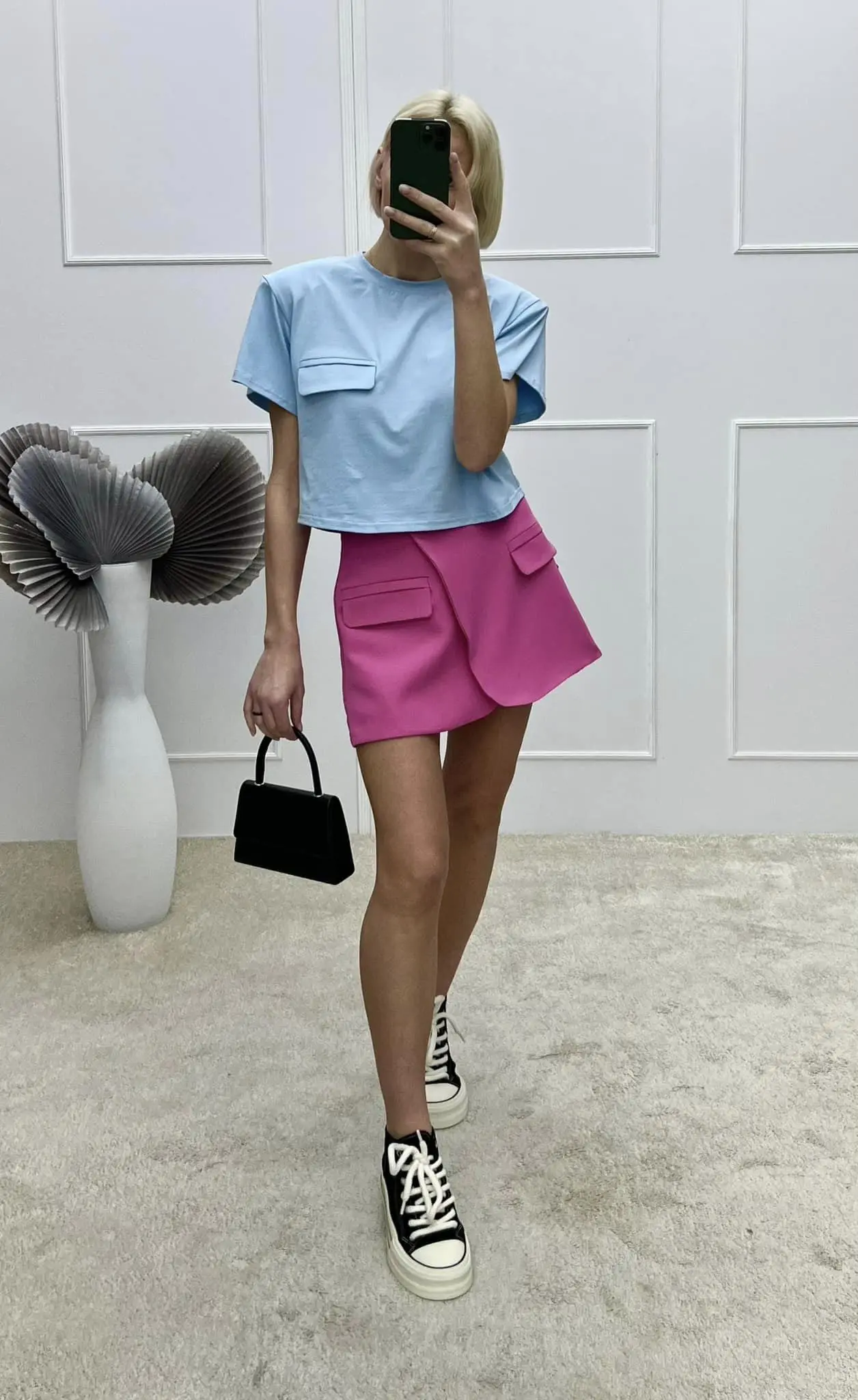 Crop top stiliaus marškinėliai su kišene – žydros spalvos