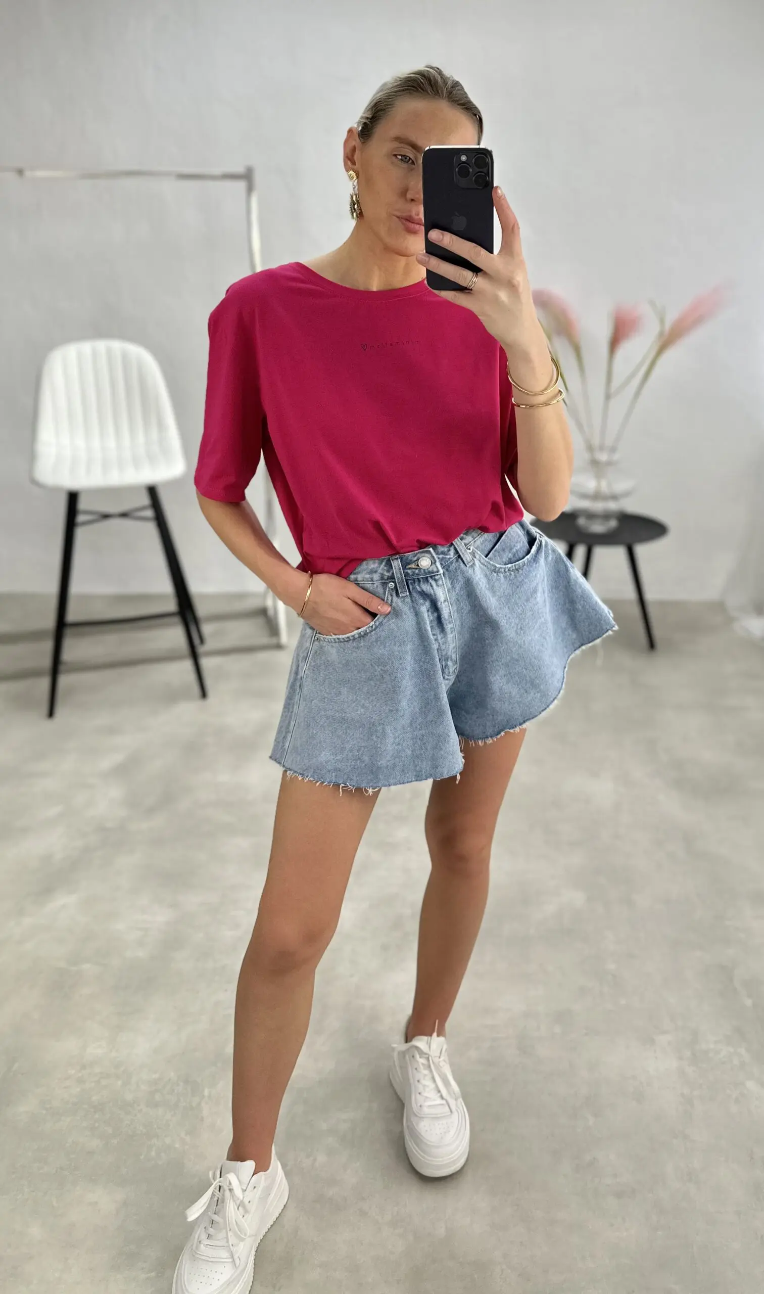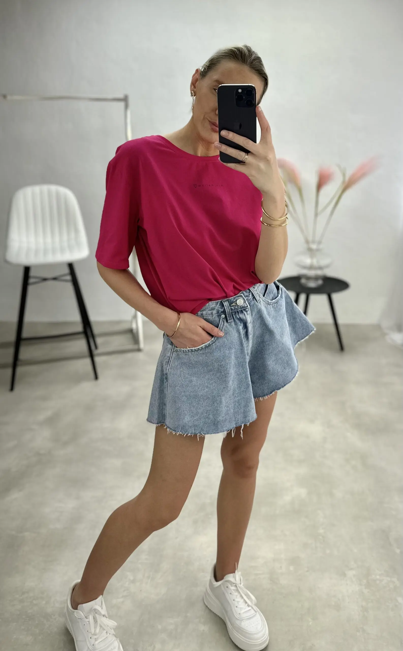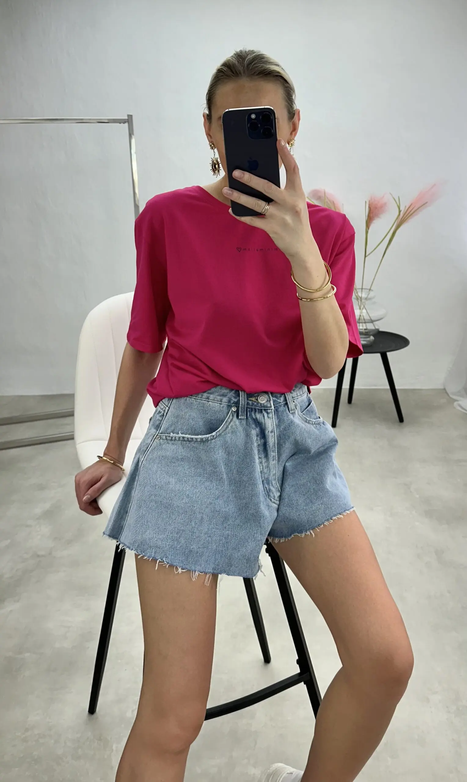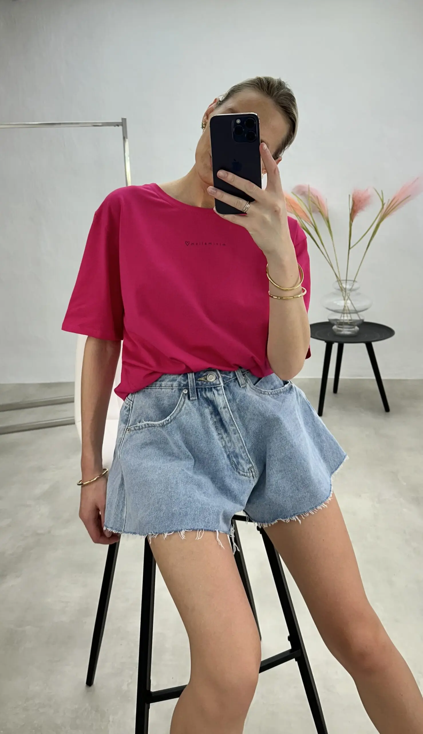 Stilingi lengvo silueto, šiek tiek oversize modelio marškinėliai trumpomis rankovėmis su užrašu ,,Minimalism” .