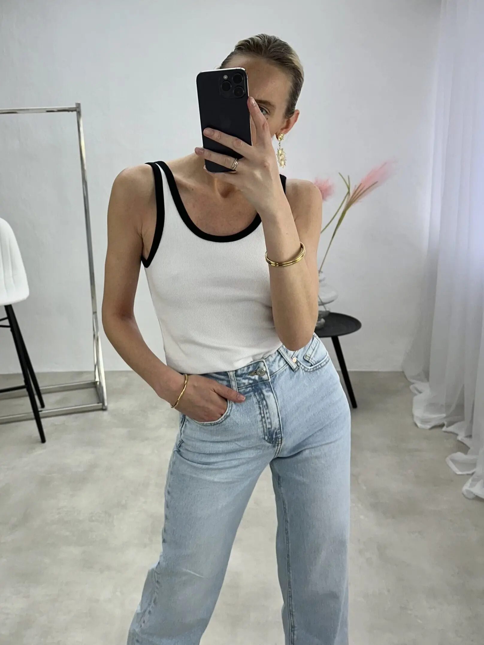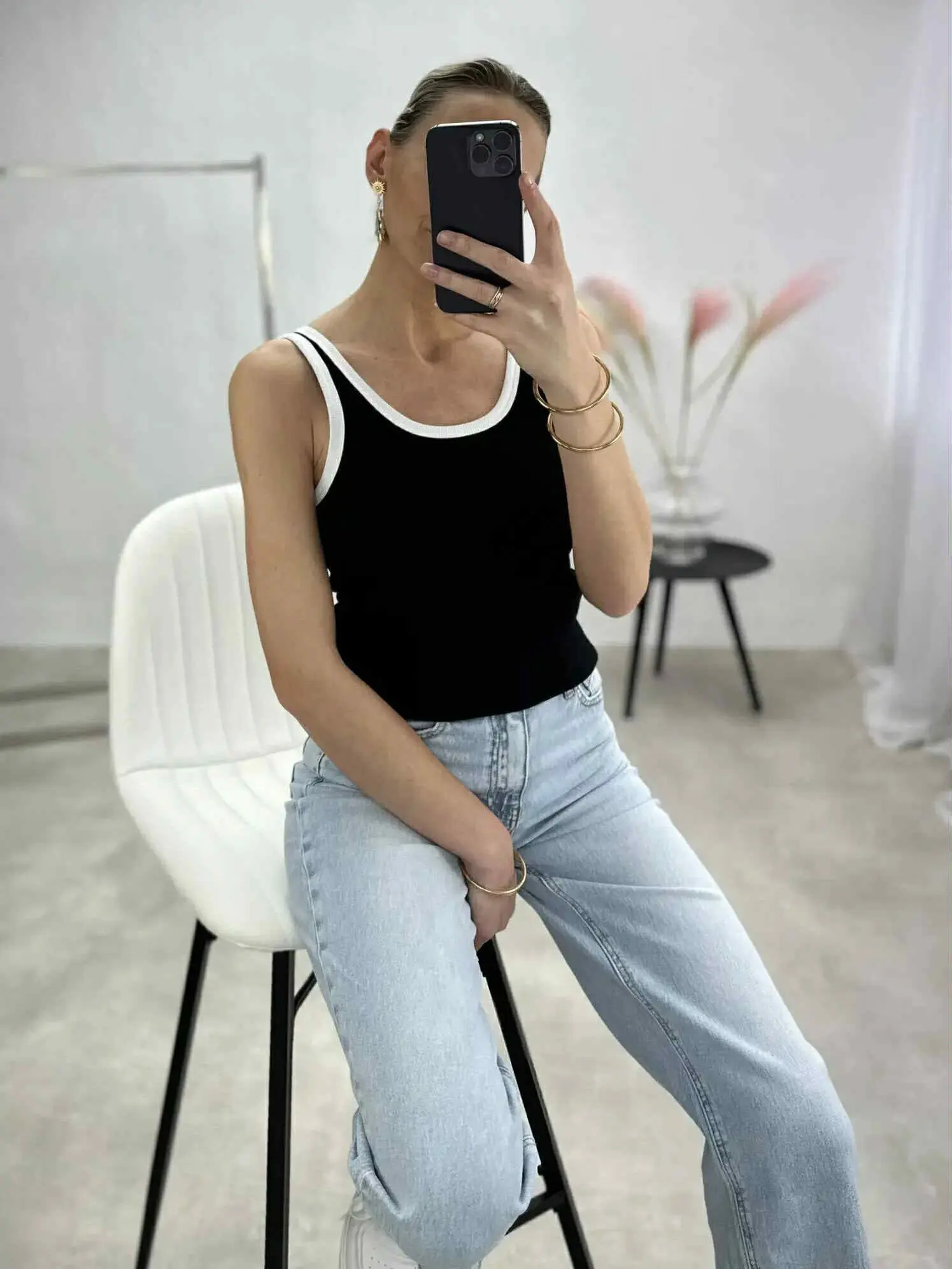 Vasariški marškinėliai be rankovių su apvadais, kuriuos puikiai galite dėvėti vienus ar, kaip bazę po švarku.
