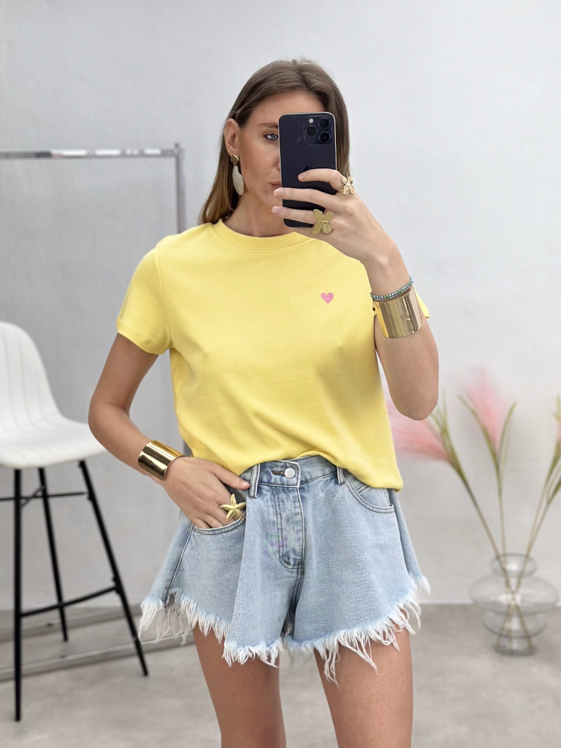 Laisvalaikio palaidinė, vienspalvė su širdele ir trumpomis rankovėmis, – paprastas ir patogus pasirinkimas kasdienai. Minimalistinis dizainas leidžia lengvai derinti su įvairiais stiliais ir aksesuarais.