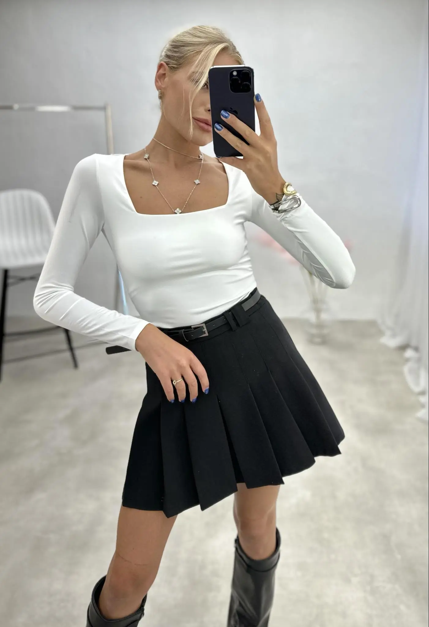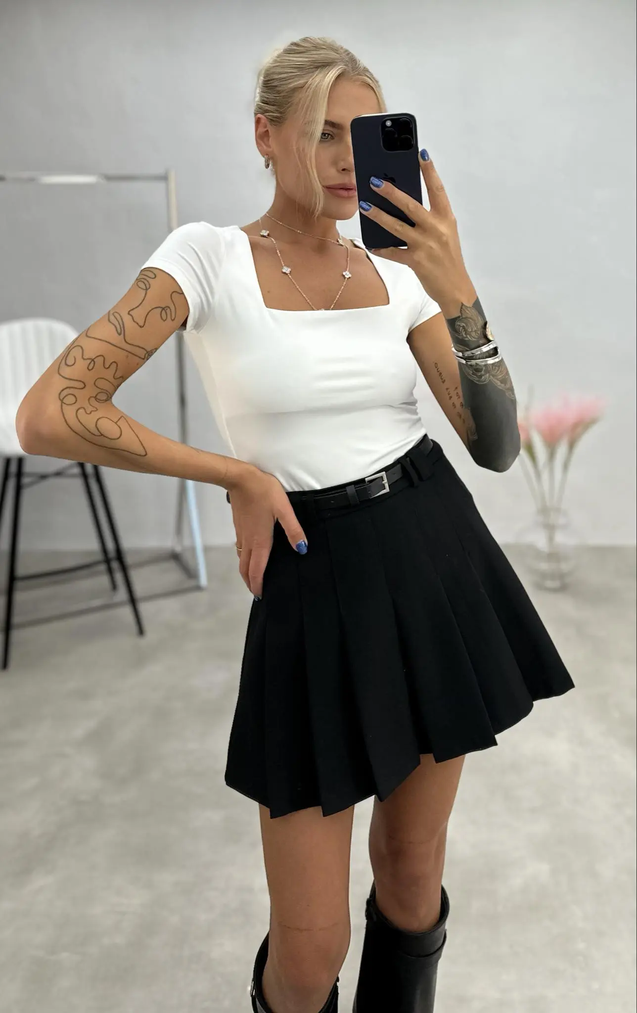 Ši palaidinė kvadratine iškirpte yra puikus pasirinkimas, kaip pagrindinis drabužis po liemenėmis ar švarkais. Jos minimalistinis dizainas ir priglundanti forma leidžia lengvai derinti prie įvairių stilių, tiek oficialių, tiek kasdienių.