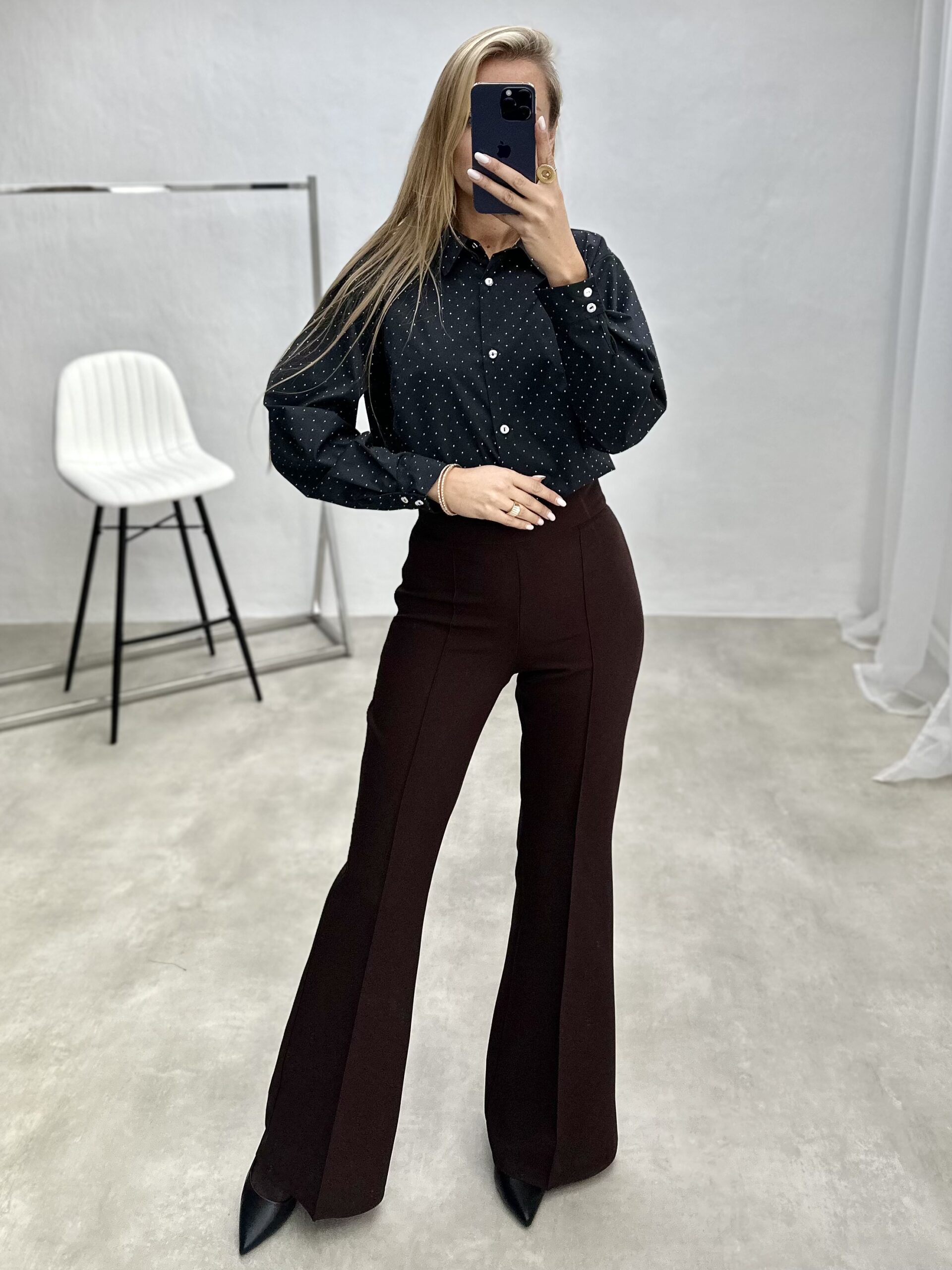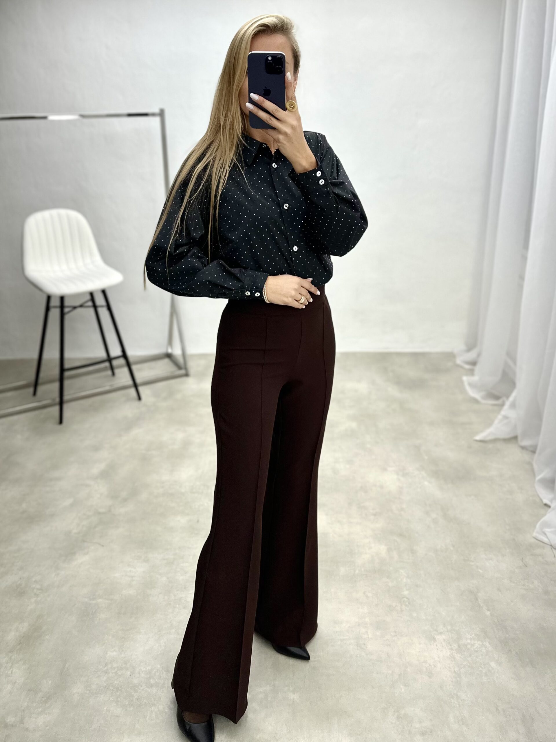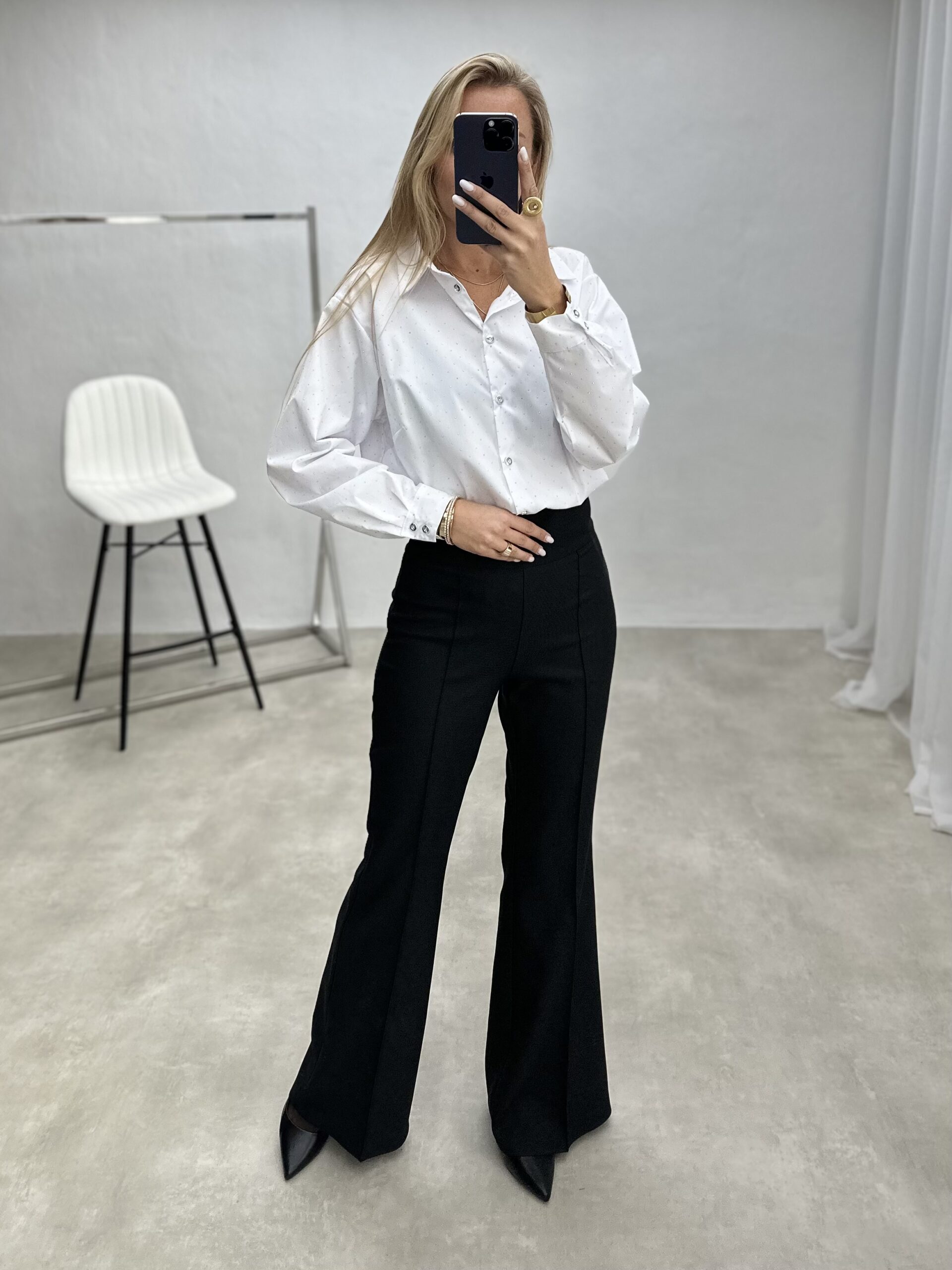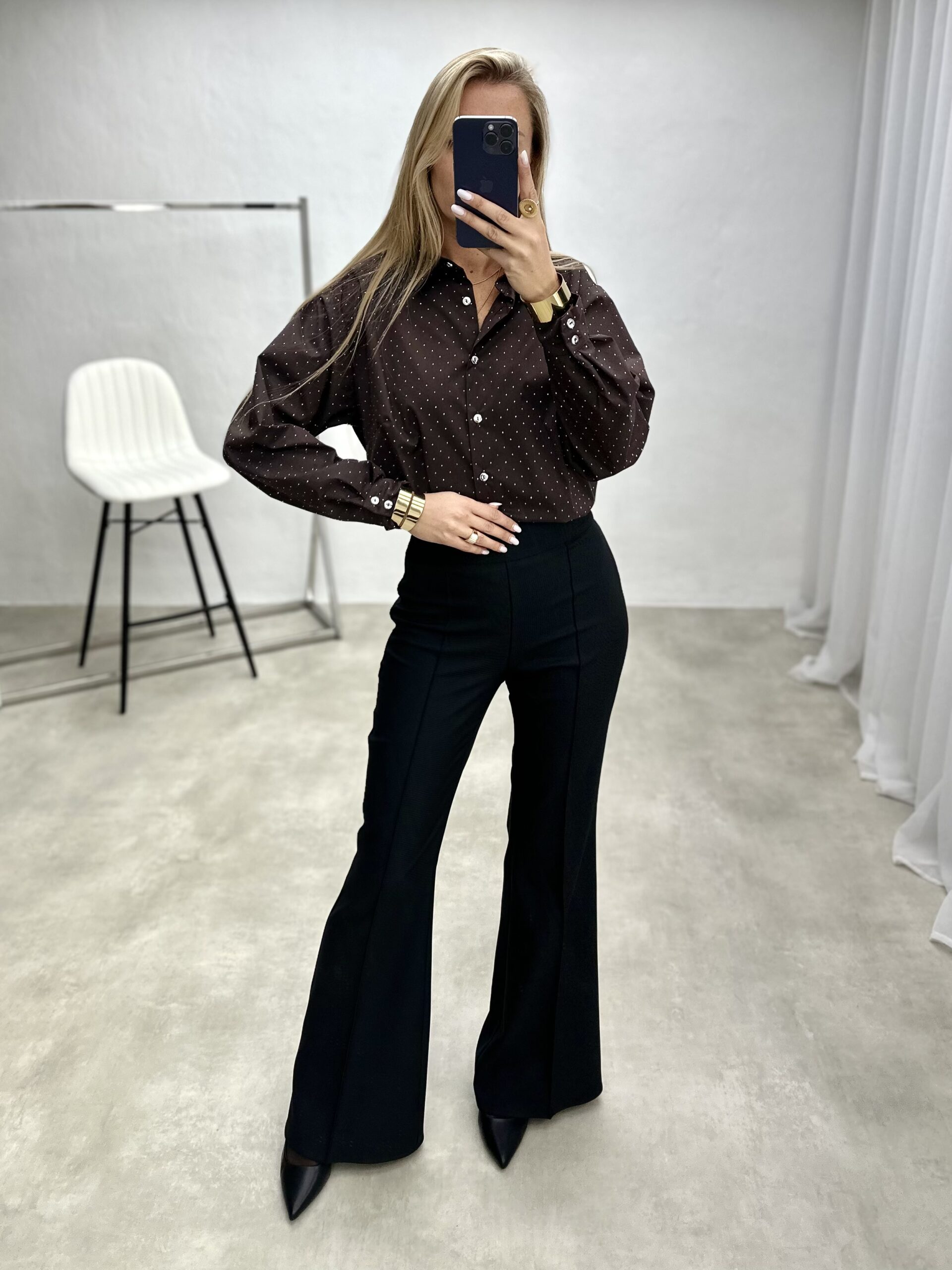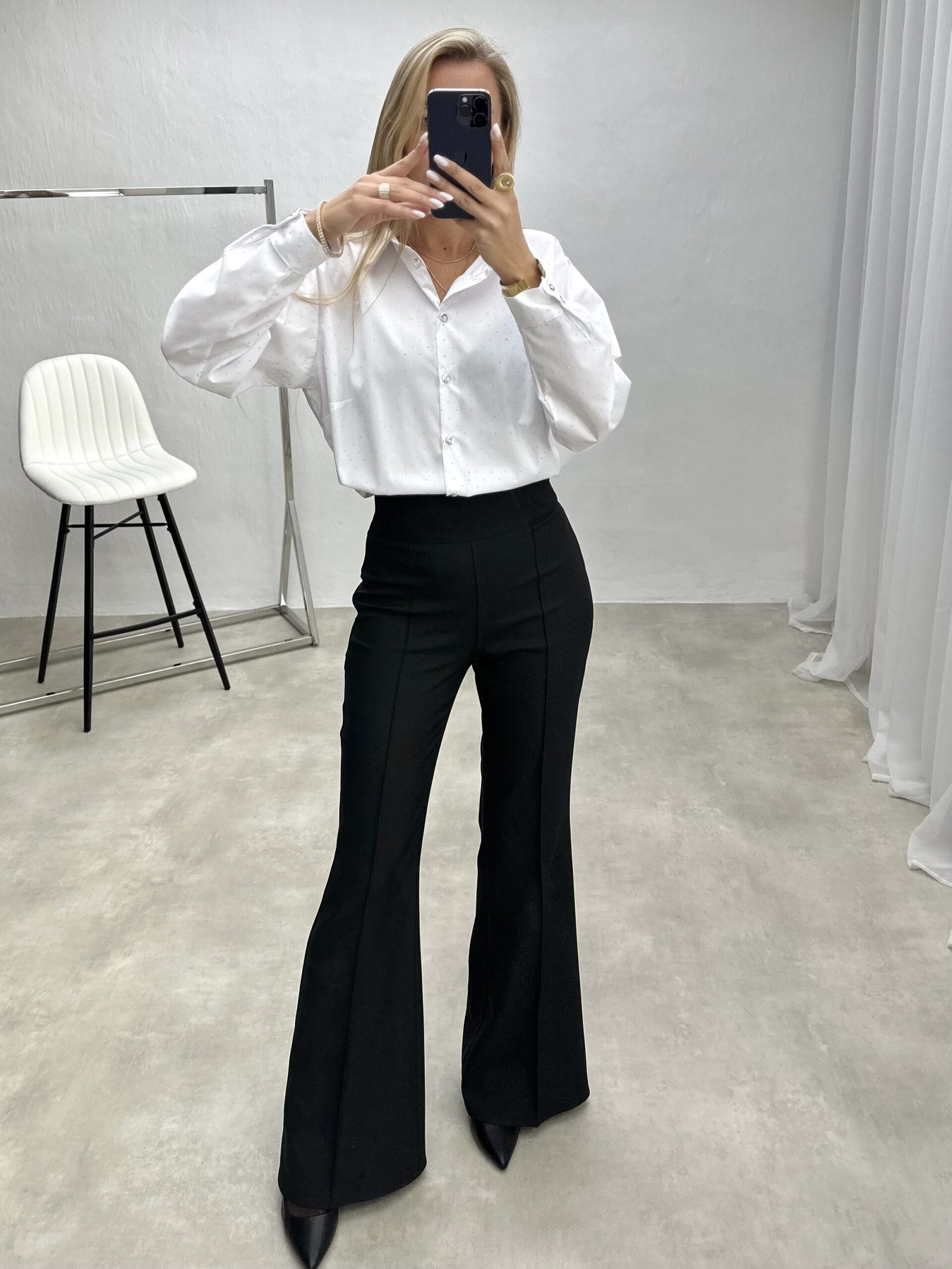 Elegantiški marškiniai, dekoruoti subtiliais blizgučiais, kurie suteikia šventinį spindesį. Laisvo silueto, patogūs ir stilingi – puikus pasirinkimas ypatingoms progoms.