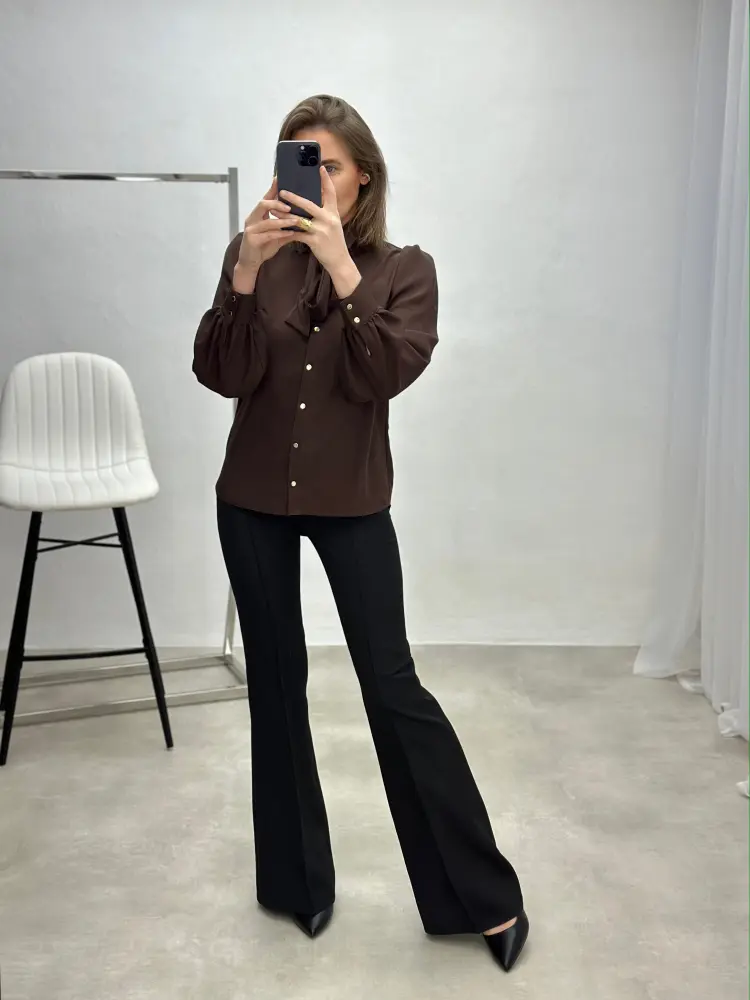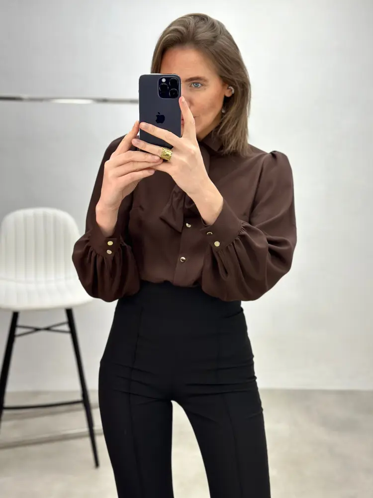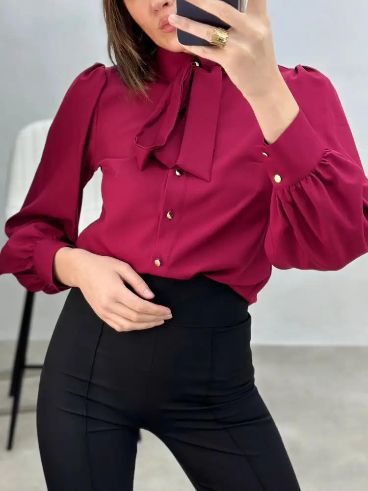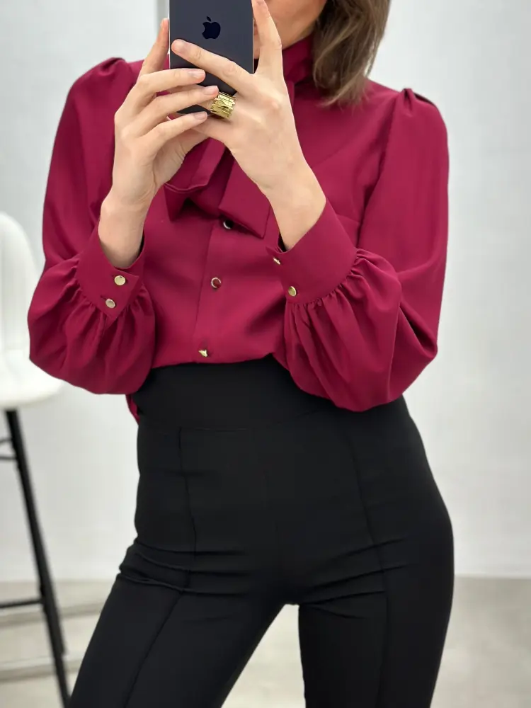 Klasikinio stiliaus marškiniai su sagutėmis, papildyti nuimamu kaspinėliu, kuris suteikia švelnų akcentą ir leidžia lengvai keisti įvaizdį.