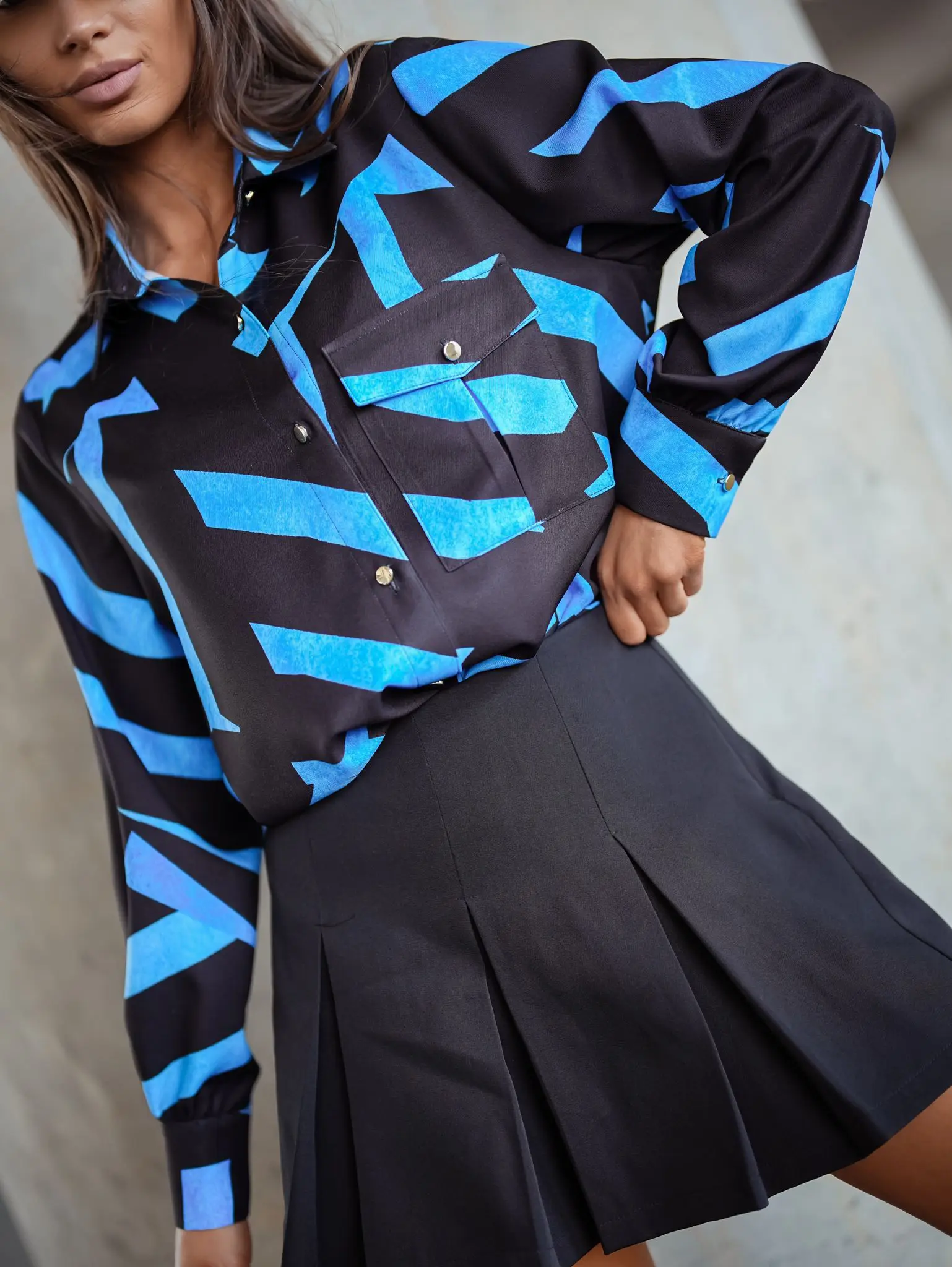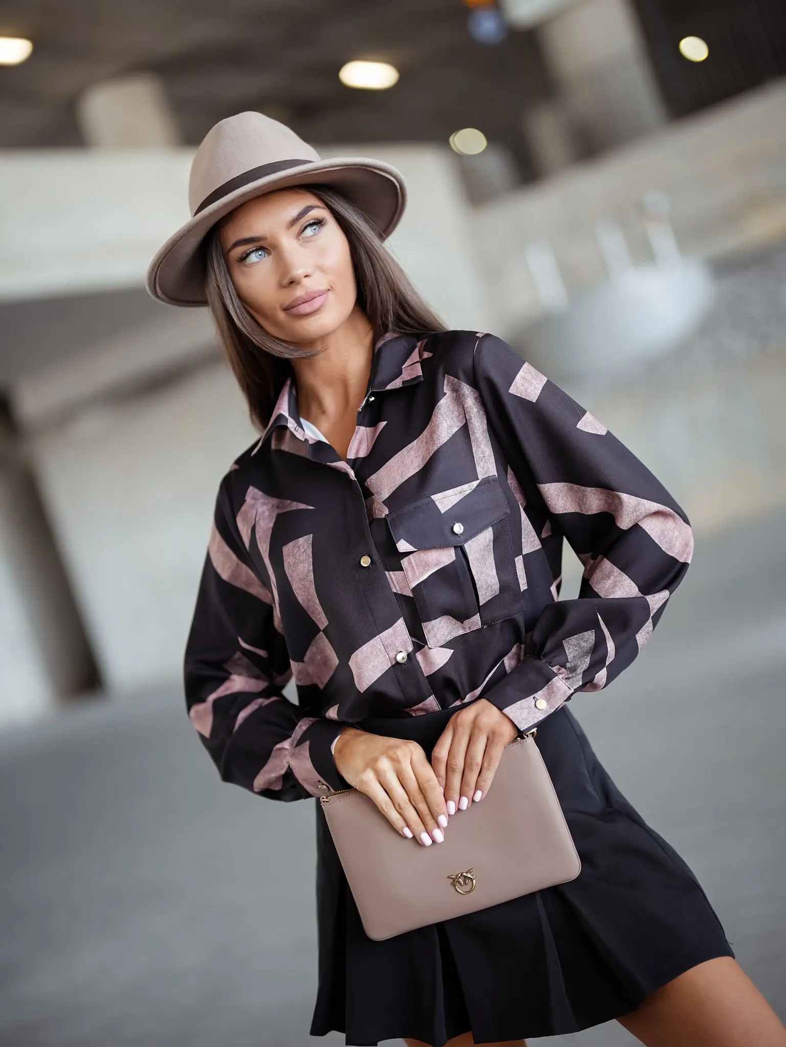Išskirtinio rašto marškinėliai su sagutėmis iš blizgaus audinio – stilingas ir elegantiškas pasirinkimas ypatingoms progoms.