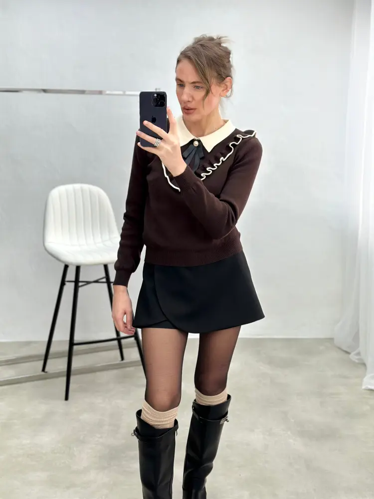 Švelnus ir elegantiškas megztinis su subtiliu kaspinėliu ir raukiniais, suteikiantis tvarkingą ir stilingą įvaizdį. Lengvai derinamas tiek kasdien, tiek prie išskirtinių derinių.