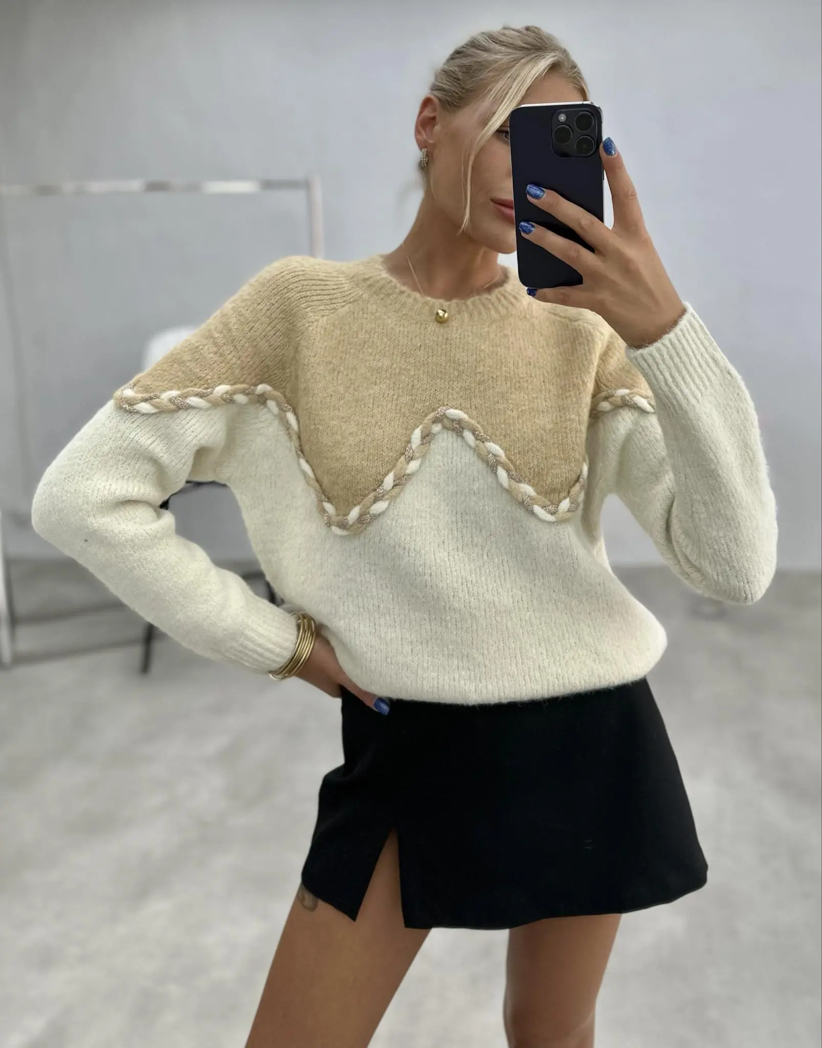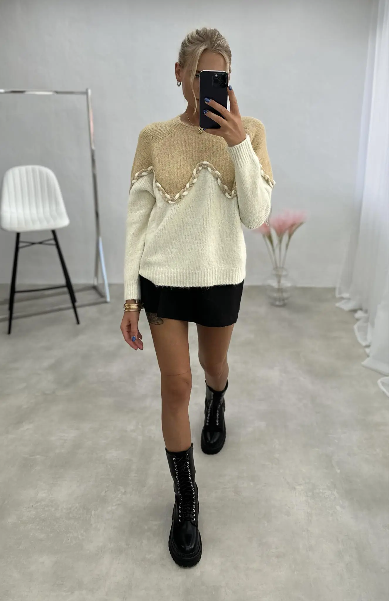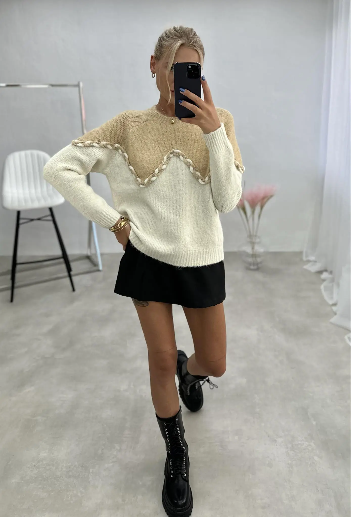 Šis megztinis su akcentais – apgaubs jaukumu ir šiluma. Šis laisvo silueto modelis puikiai tinks ir kasdieniniams, tiek puošniems deriniams.