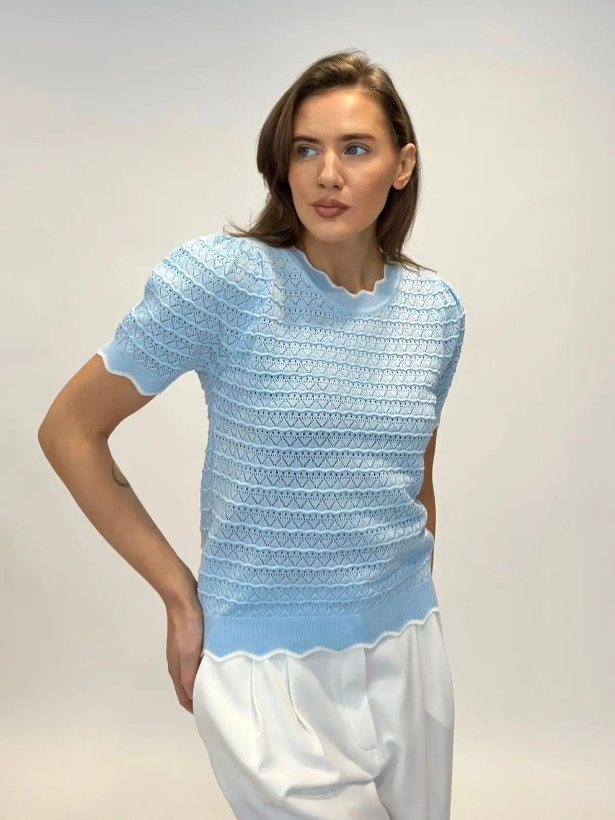 Jaukus ir stilingas megztinis trumpomis rankovėmis su subtiliais raukiniais. Puikiai tinka kasdieniam nešiojimui, suteikia švelnų ir moterišką akcentą.