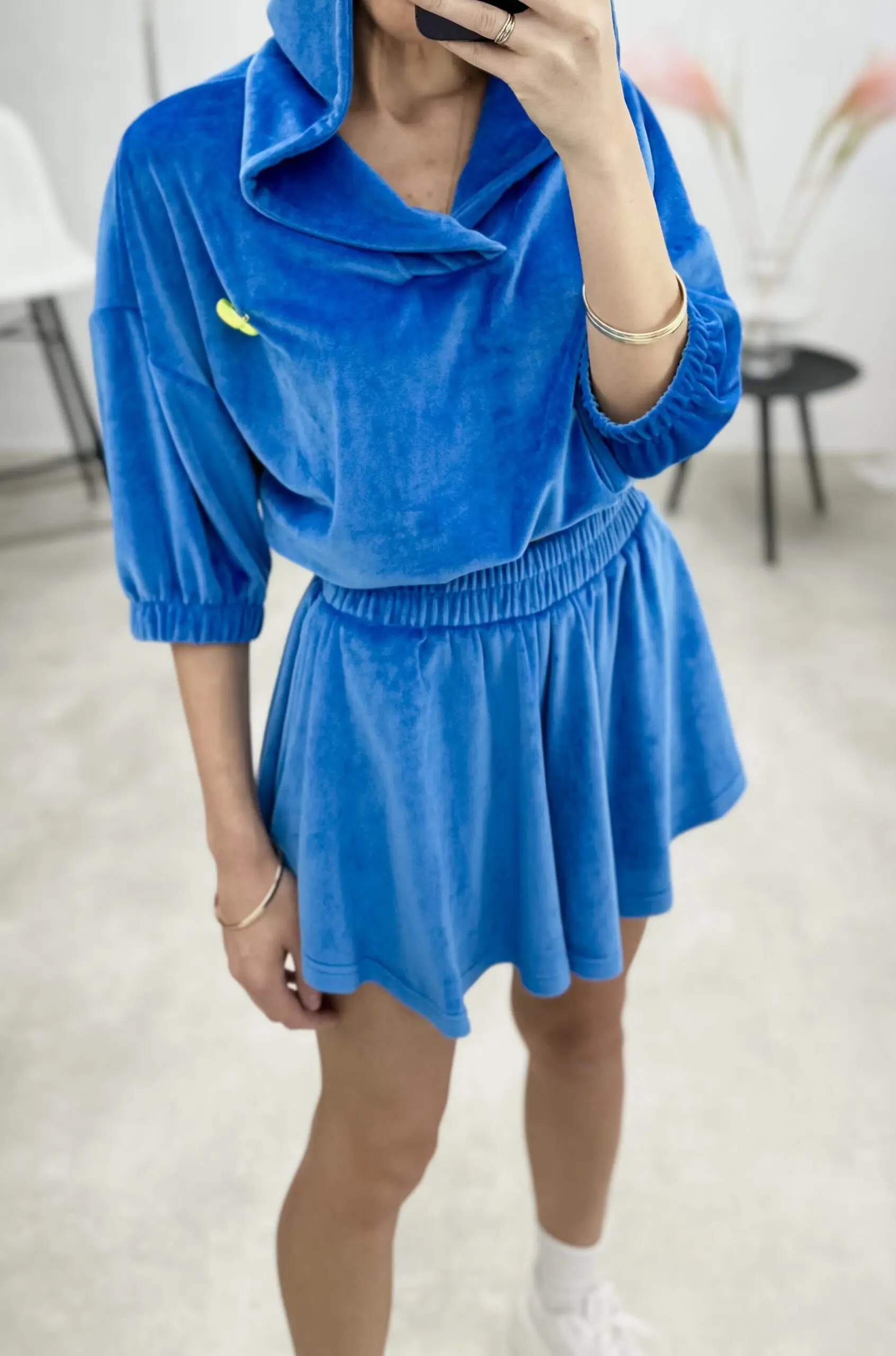 Vasariškas dviejų dalių kostiumėlis, kurį sudaro džemperis ir klostuoto modelio šortai.