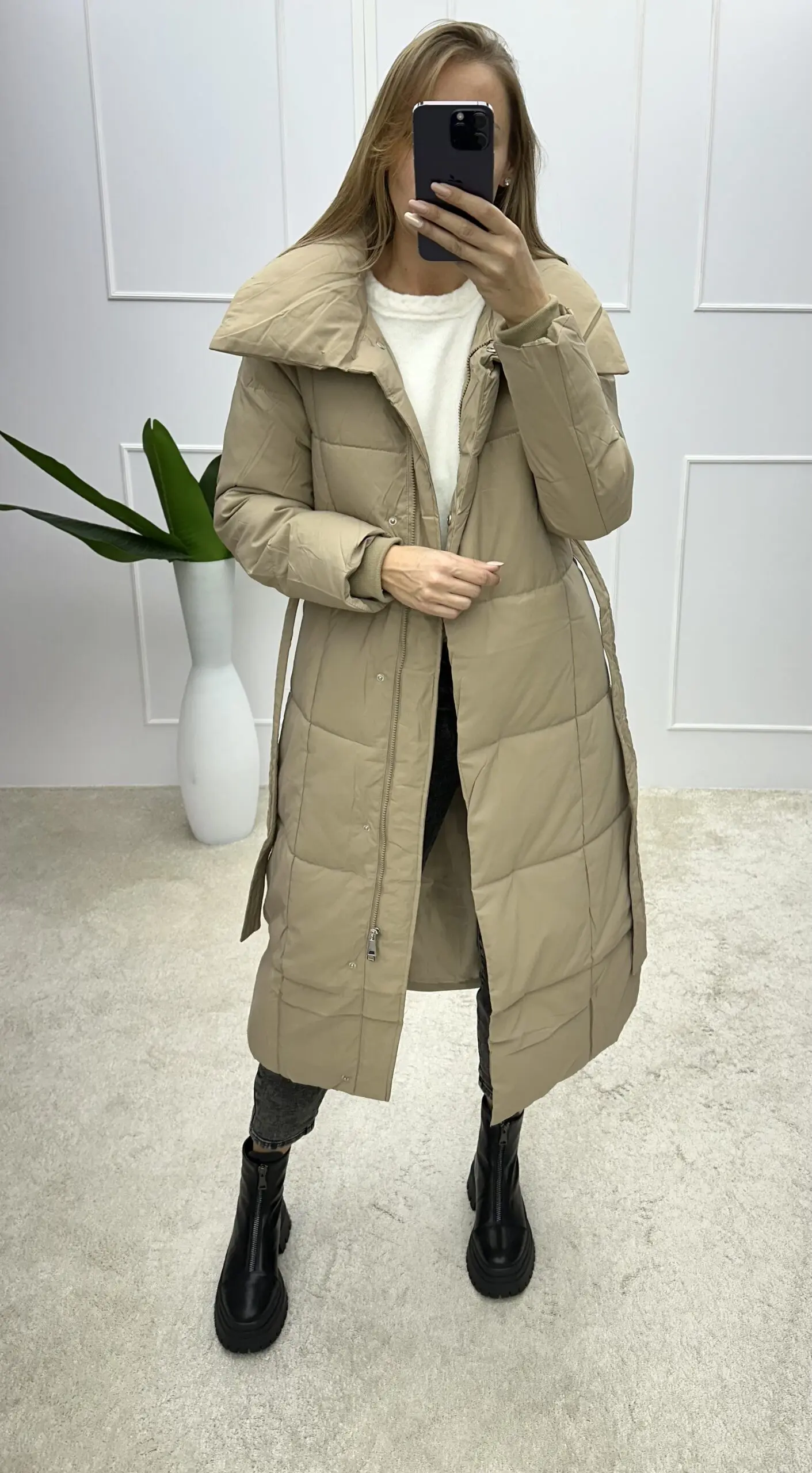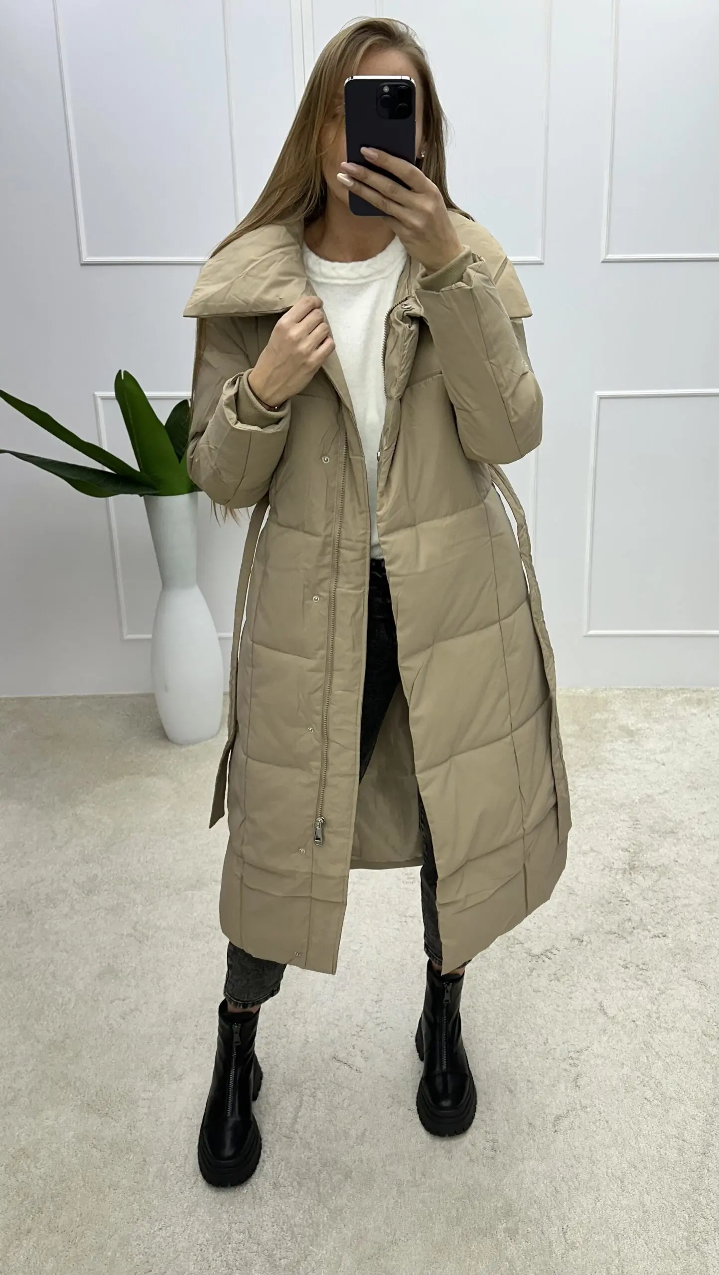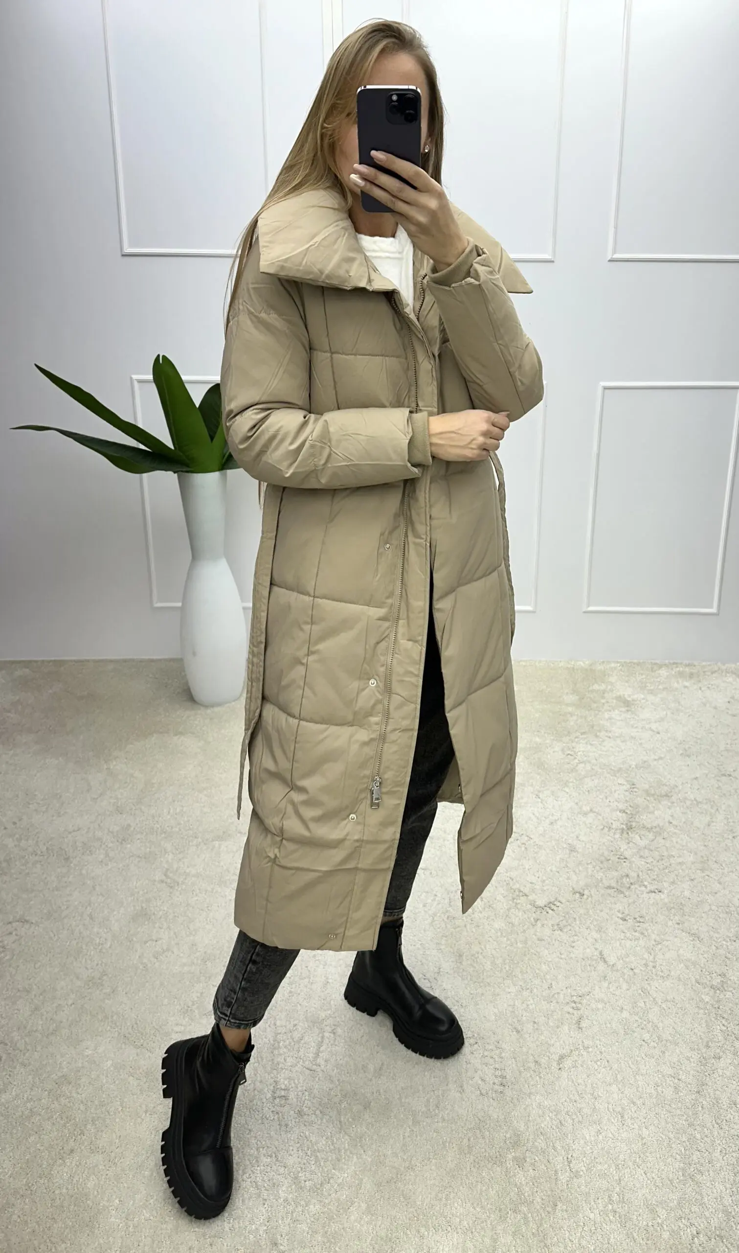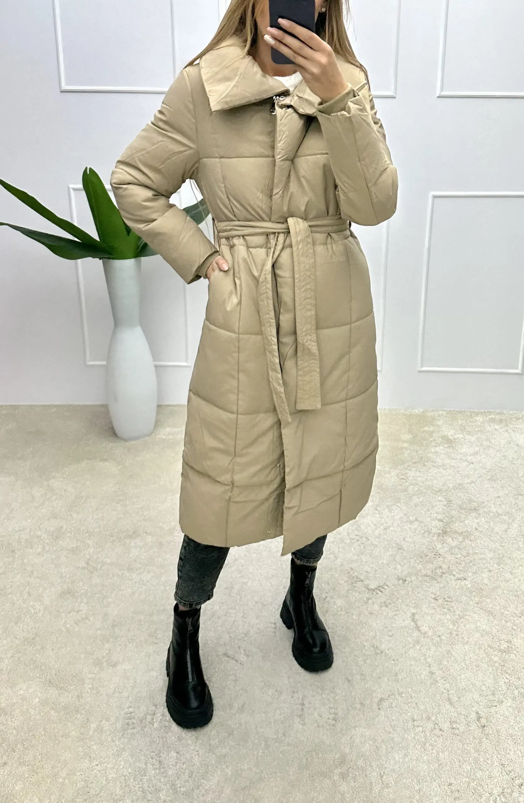 Šilta midi ilgio striukė su gobtuvu r dirželiu per juosmenį. Mūsų internetinėje parduotuvėje rasite įvairių dydžių bei modelių striukių, kurias nuolat pildome.