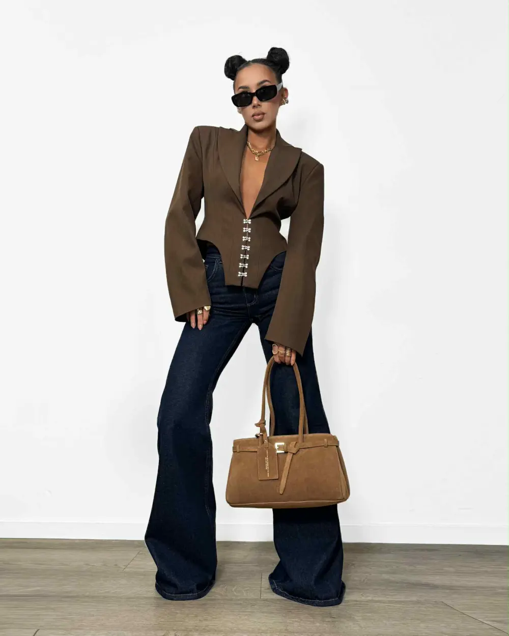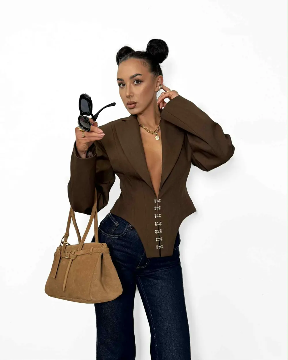 Modernus švarkas su giliais iškirpimais dekoruotas subtiliomis metalinėmis kniedėmis, suteikiančiomis drąsų ir stilingą akcentą. Tiesus kirpimas pabrėžia siluetą ir kuria šiuolaikišką, išskirtinį įvaizdį.