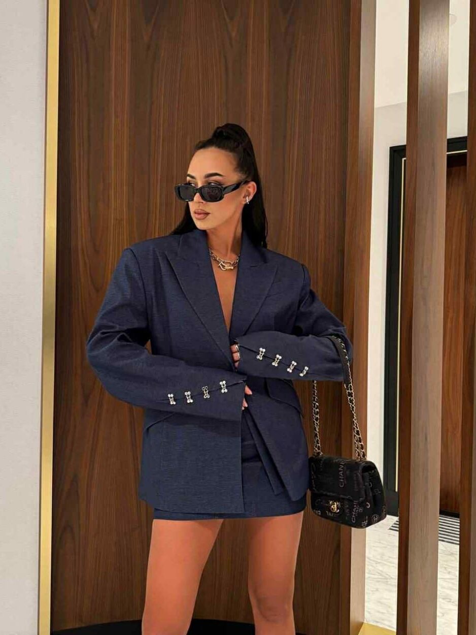 Šis elegantiškas, struktūruoto silueto švarkas išsiskiria moderniu dizainu ir subtiliomis metalinėmis kniedėmis. Kniedės puošia ne tik rankogalius, bet ir nugaros dalį, suteikdamos modeliui išskirtinumo ir charakterio. Puikiai tinka tiek stilingam kasdieniam, tiek vakariniam įvaizdžiui kurti.