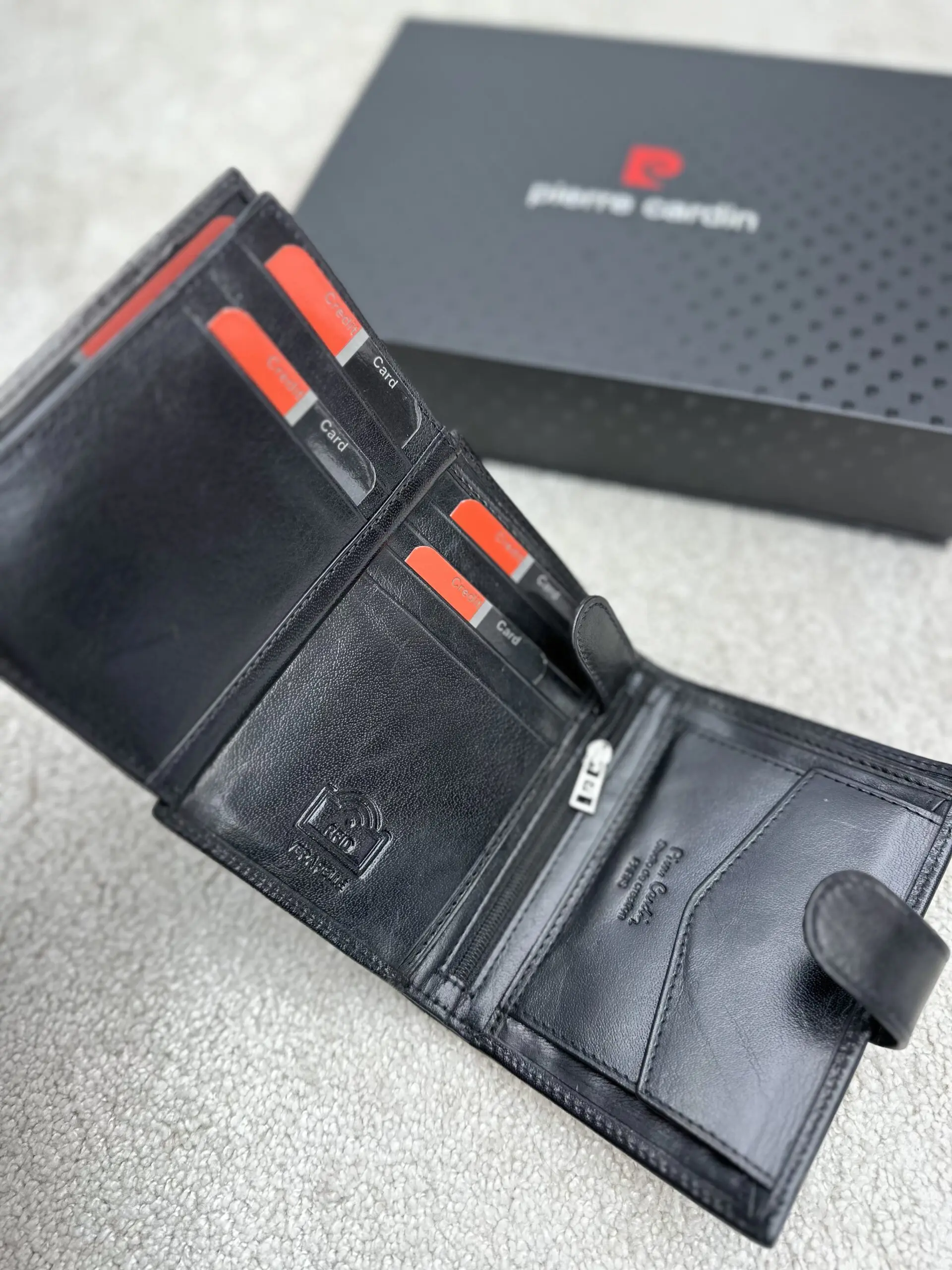 Piniginė blokuoja bekontakčių kortelių RFID signalą ir neleidžia per atstumą nuskaityti mokėjimo kortelių ar tapatybės dokumentų duomenų.