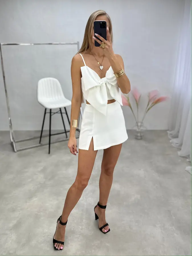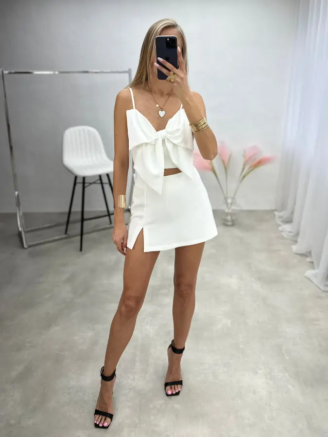 Palaidinė su kaspinėliu, „crop top“ modelio, ant petnešėlių – žaisminga ir moteriška detalė vasaros įvaizdžiui. Nugaroje esantis užtrauktukas suteikia patogumo ir stilingumo vienu metu.