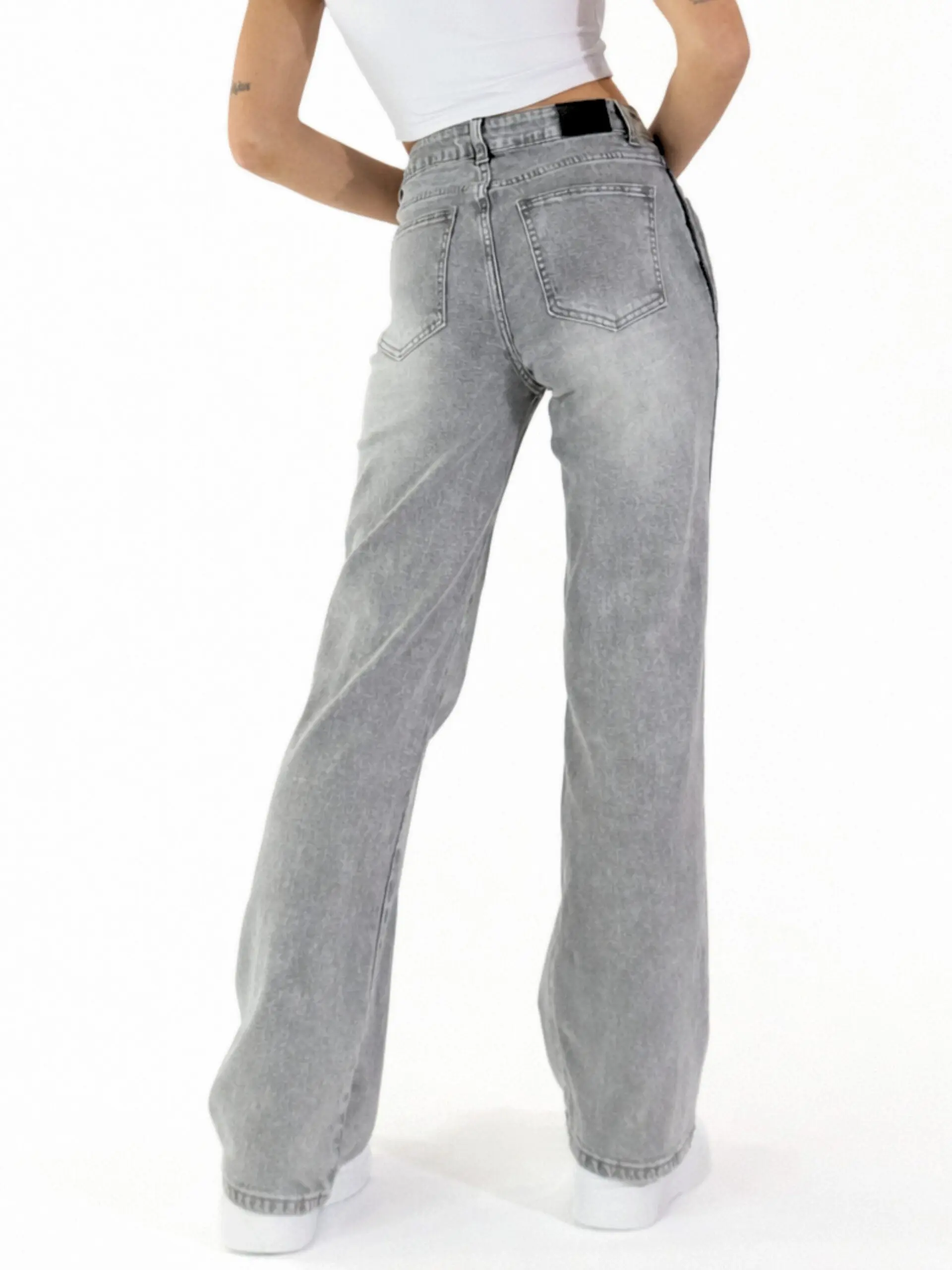 Stilingi platūs džinsai su šoninėmis juodos spalvos juostomis, kurios sukuria modernų siluetą. Puikiai tinka kasdieniam nešiojimui ir lengvai derinami prie įvairių įvaizdžių.