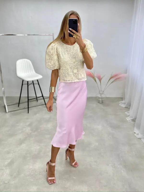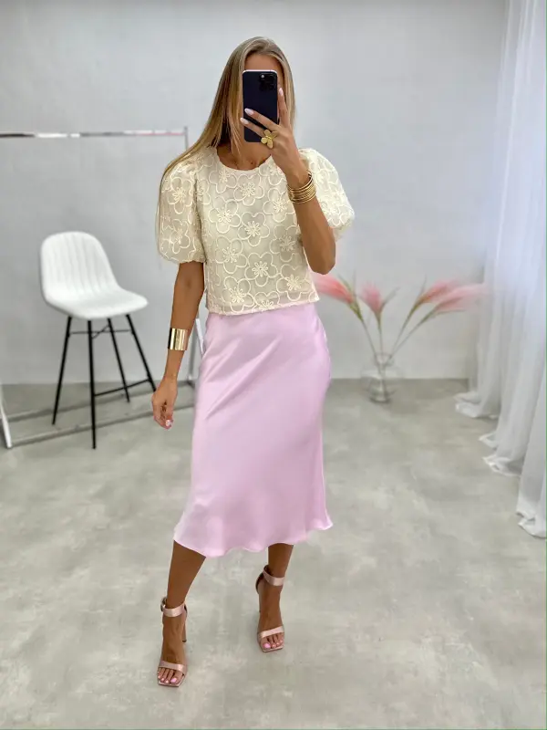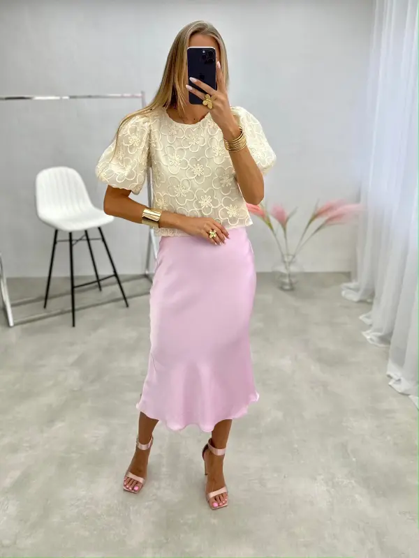 Puošni palaidinė su pūstomis rankovėmis ir blizgančiu dekoru – elegantiškas akcentas, suteikiantis įvaizdžiui prabangos ir moteriškumo.