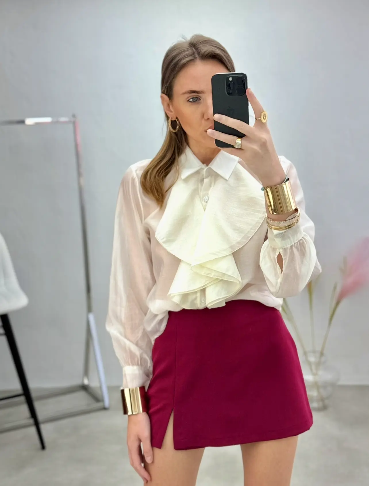 Puošni palaidinė su ripuliais priekyje yra elegantiška ir išskirtinė, suteikianti subtilų moteriškumą. Ripuliai prideda judesio ir tekstūros, pabrėždami stilingą detalę.