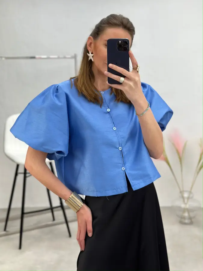 Puošni palaidinė su pūstomis rankovėmis ir sagutėmis priekinėje dalyje – elegantiškas ir išskirtinis akcentas jūsų įvaizdžiui. Dailus siluetas ir subtilios detalės suteikia prabangos pojūtį tiek kasdienai, tiek ypatingoms progoms.