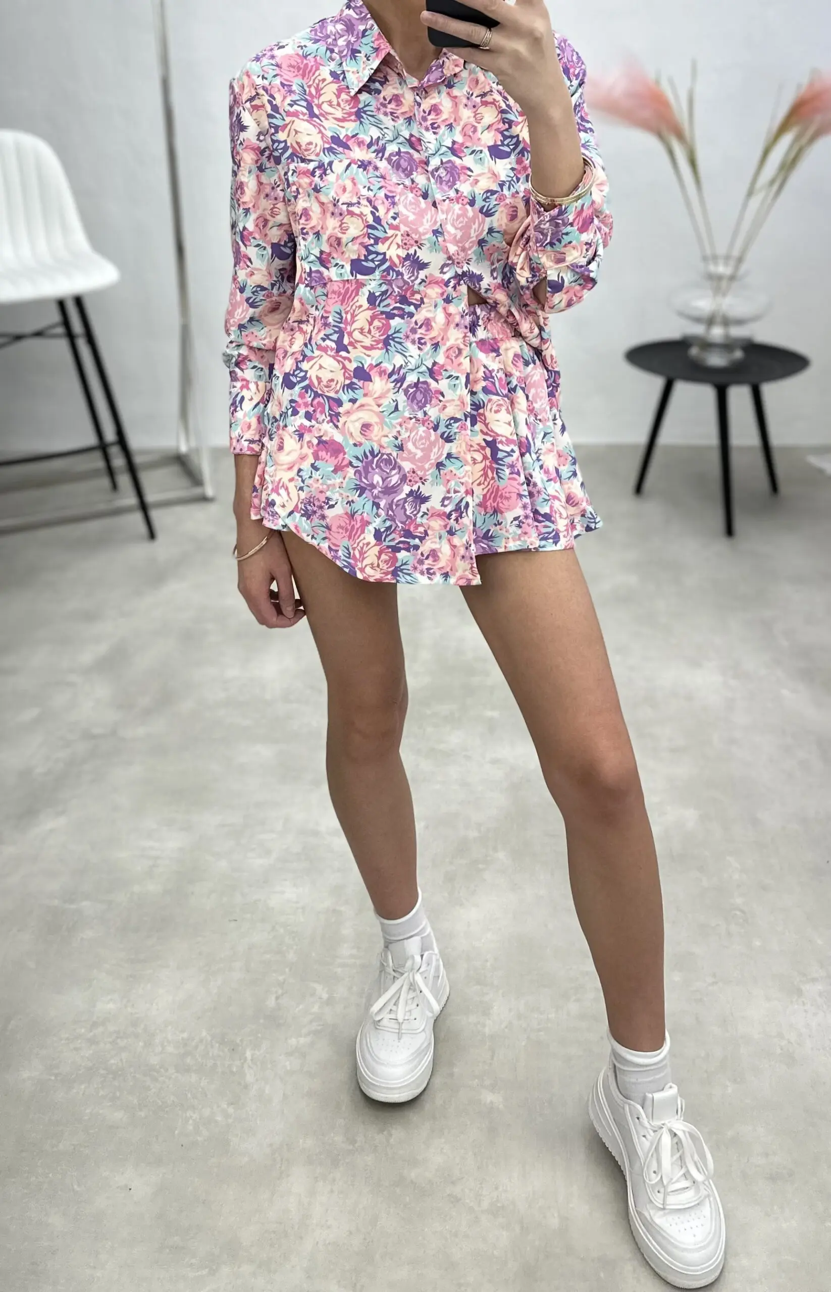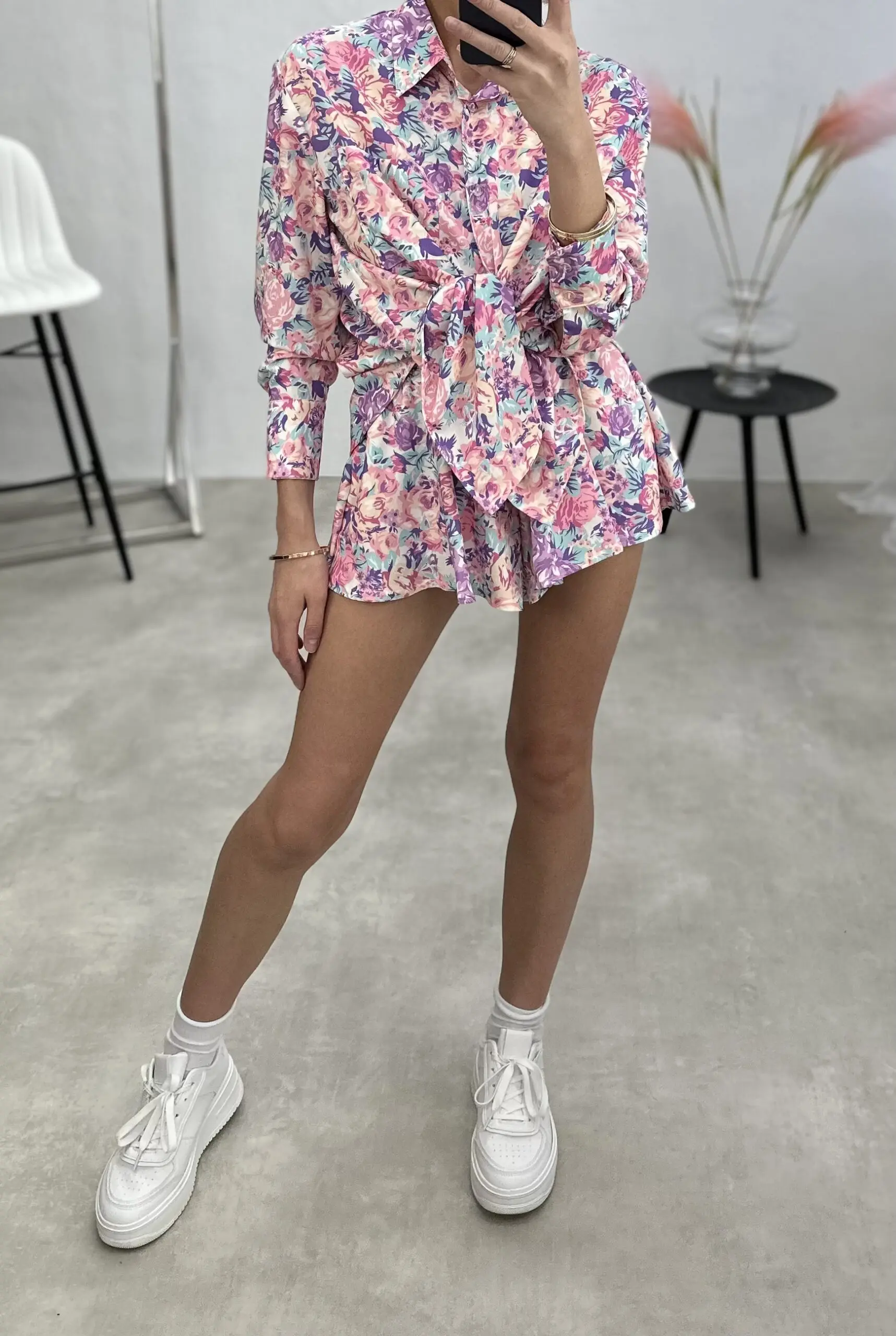 Vasariškas dviejų dalių kostiumėlis, kurį sudaro marškiniai ilgomis rankovėmis ir sijonšorčiai.