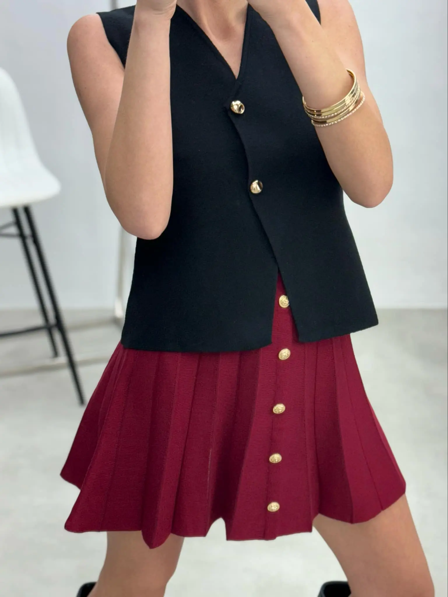 Stilinga, klasikinio modelio liemenė, dekoruota auksinės spalvos sagutėmis, puikus pasirinkimas kiekvienai dienai.