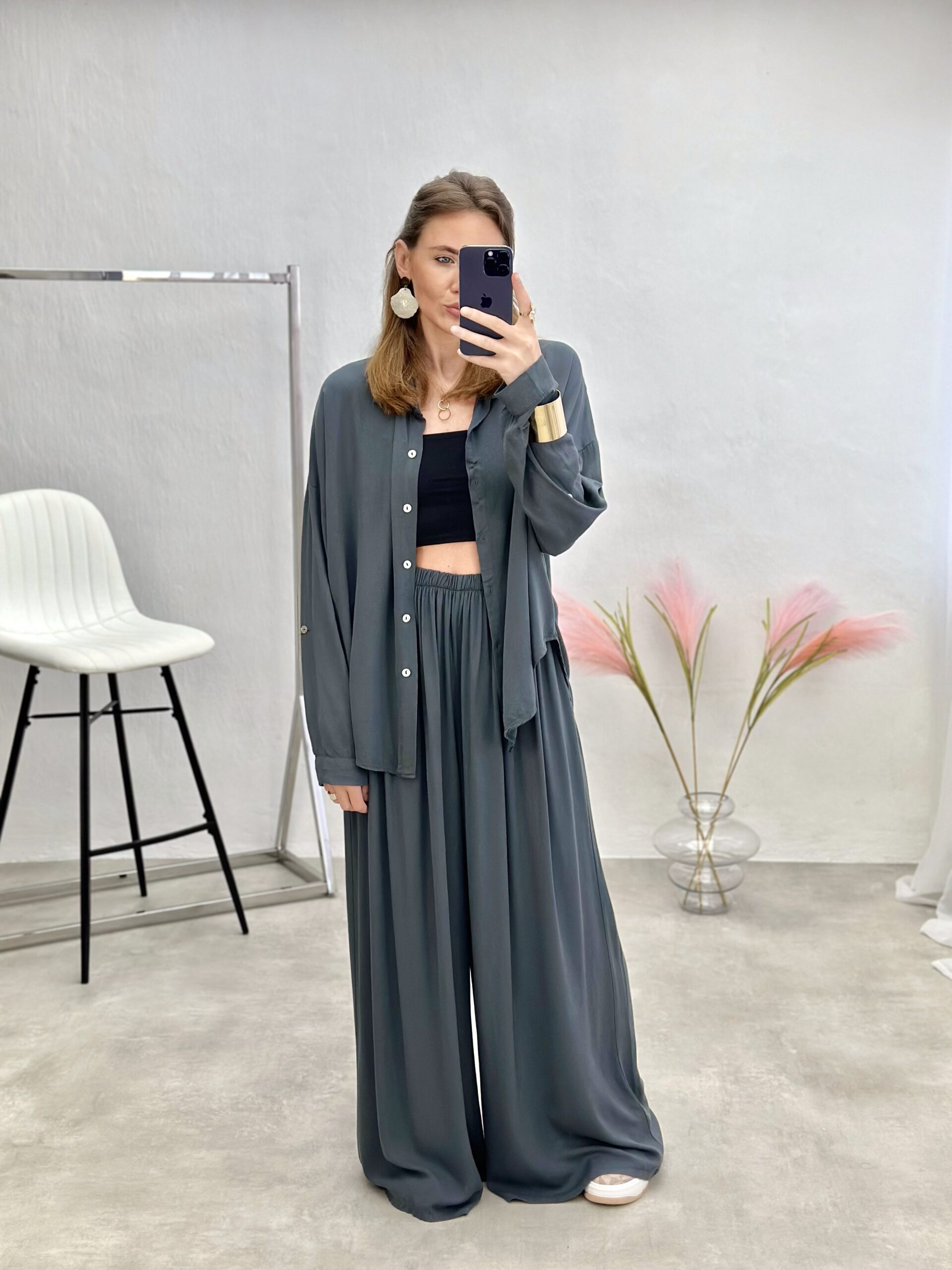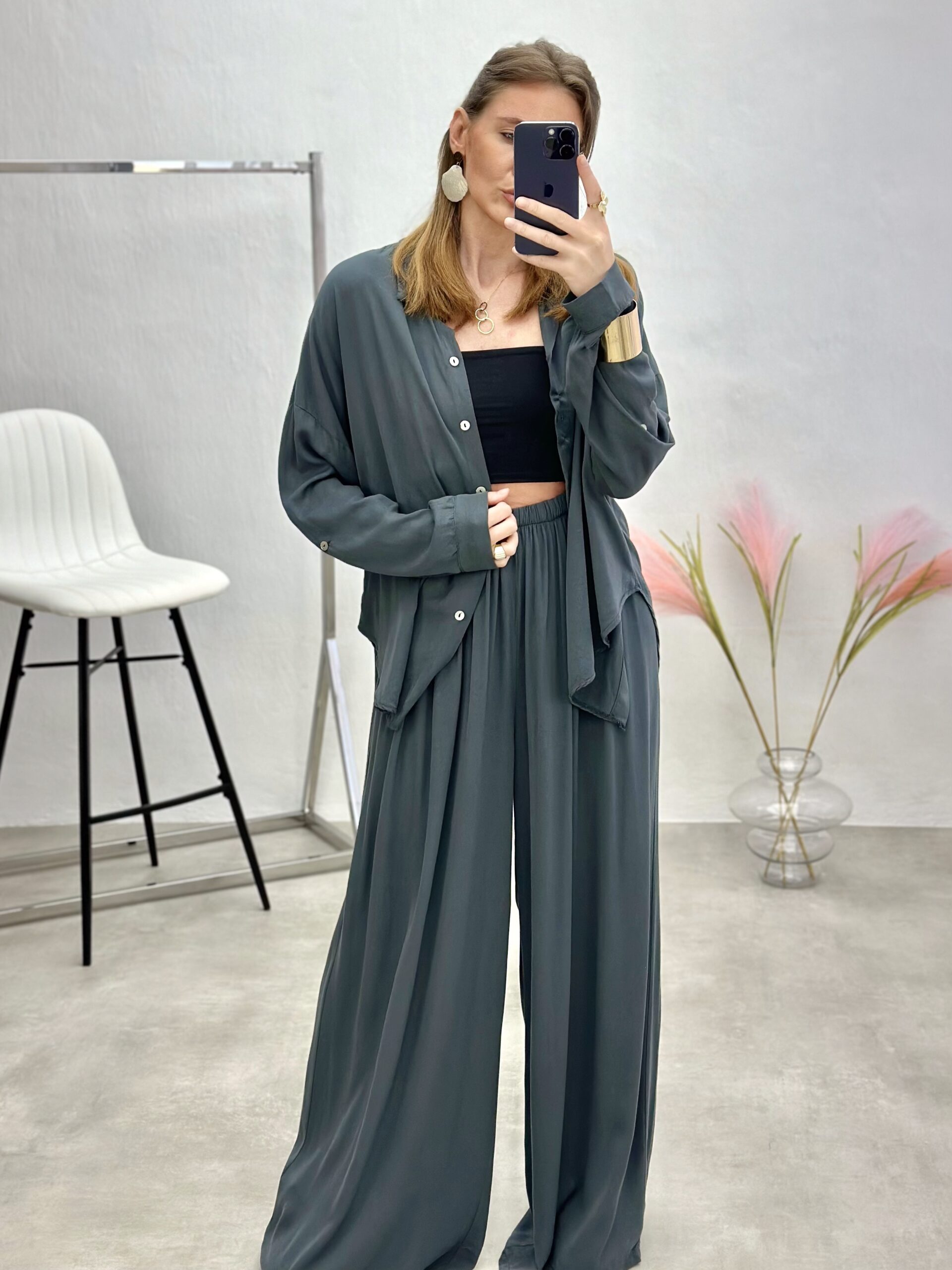 Stilingas dviejų dalių kostiumas, sudarytas iš klasikinio kirpimo marškinių ir platėjančių kelnių, spinduliuoja elegancija ir šiuolaikišku lengvumu. Lengvai derinamas ir išskirtinio silueto modelis puikiai tinka tiek kasdienai, tiek ypatingoms progoms.