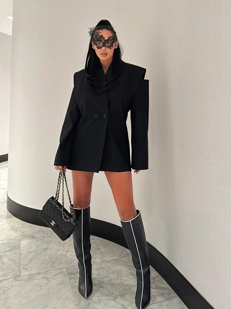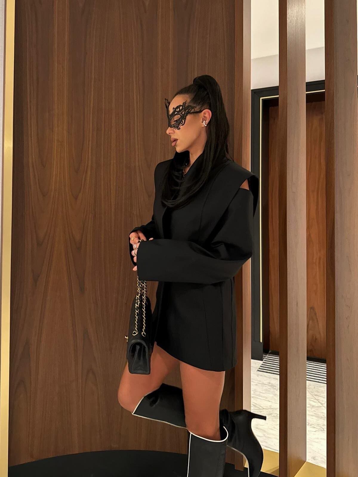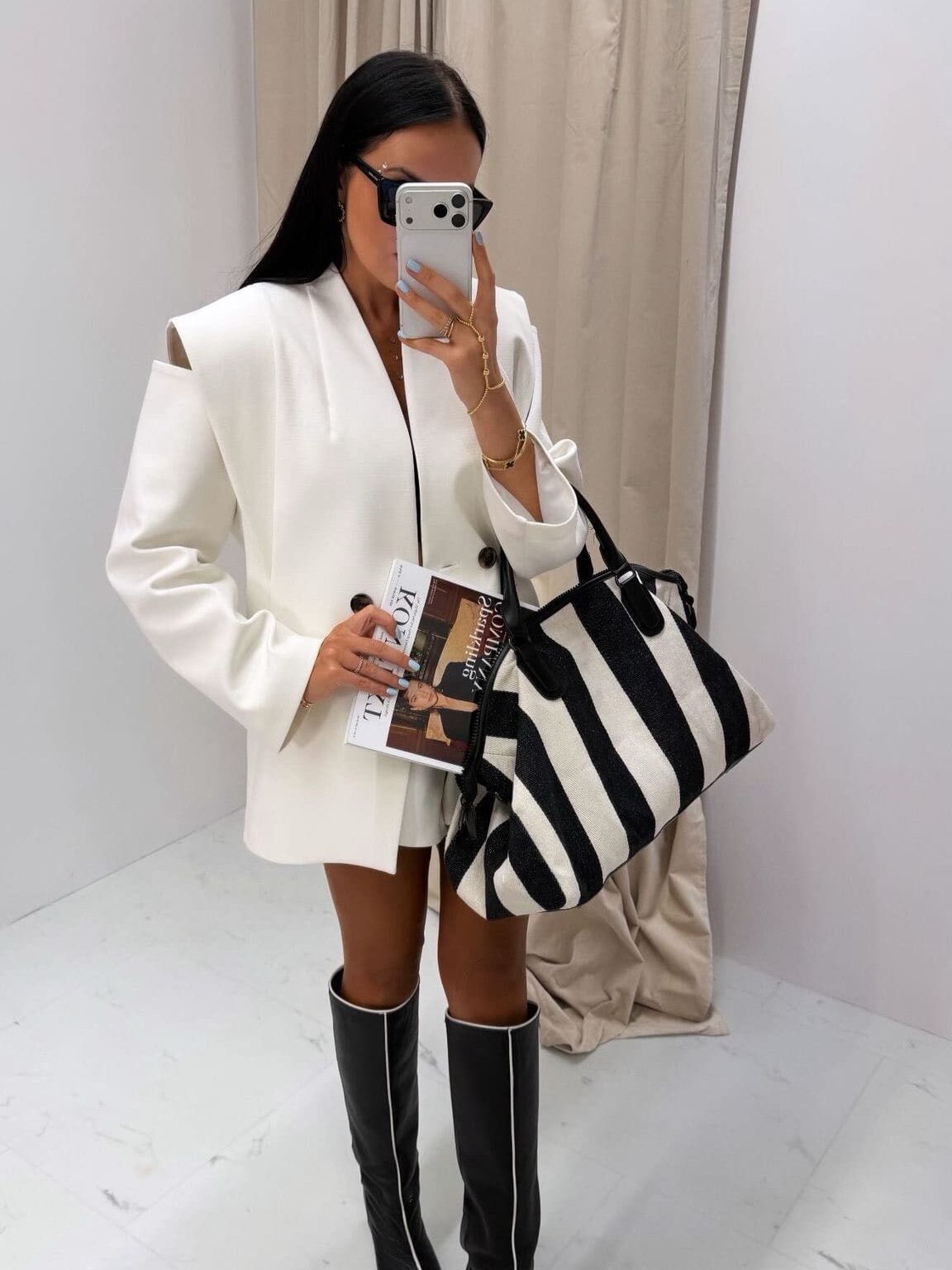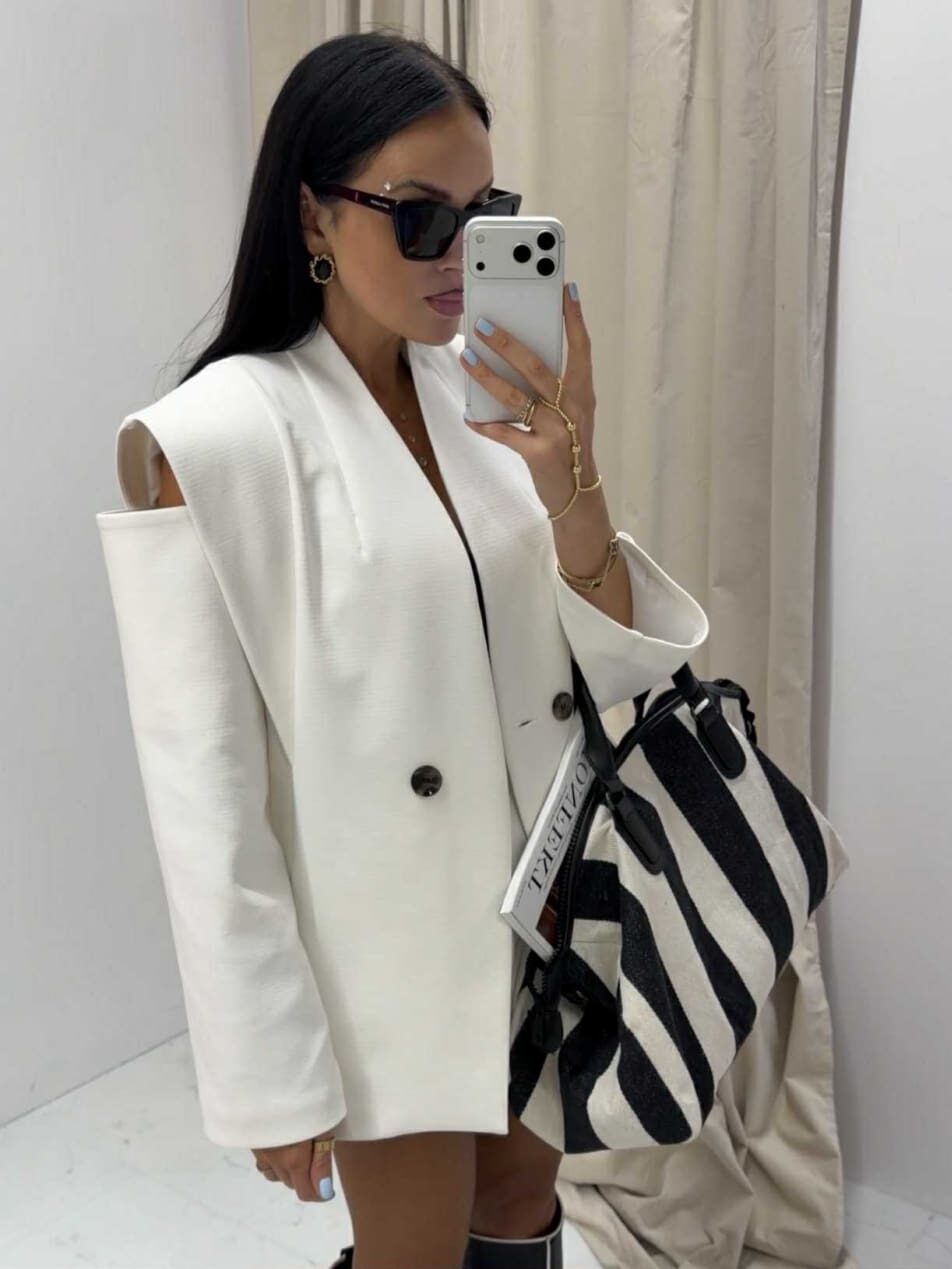 Stilingas tiesaus kirpimo švarkas su atvirais, išraiškingais pečiais kuria drąsų ir modernų įvaizdį. Aiškios linijos pabrėžia siluetą ir suteikia aprangai charakterio.