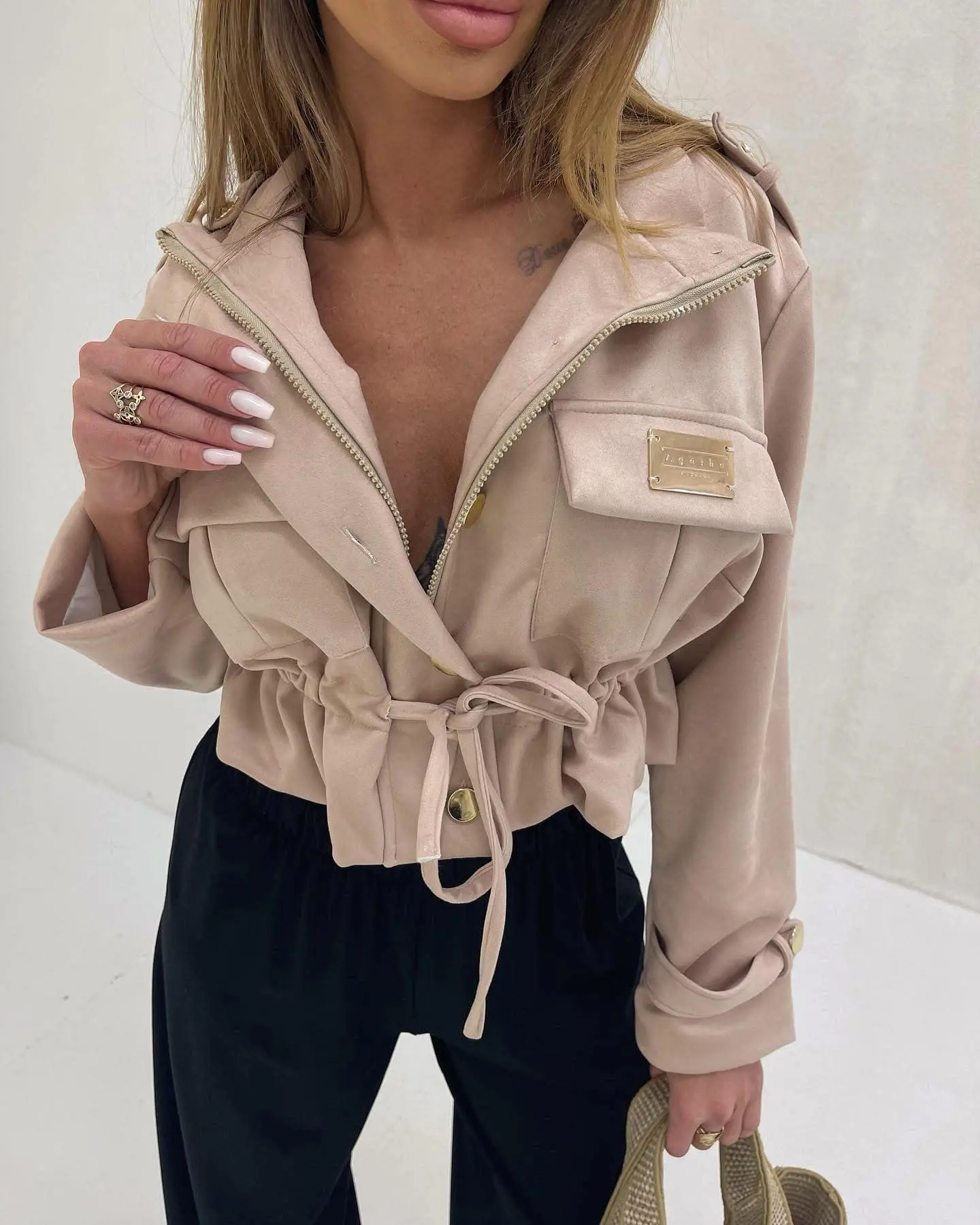 Trumpesnio modelio švarkelis su auksinės spalvos detalėmis. Puikiai tinka tiek kasdieniams, tiek elegantiškesniems deriniams.